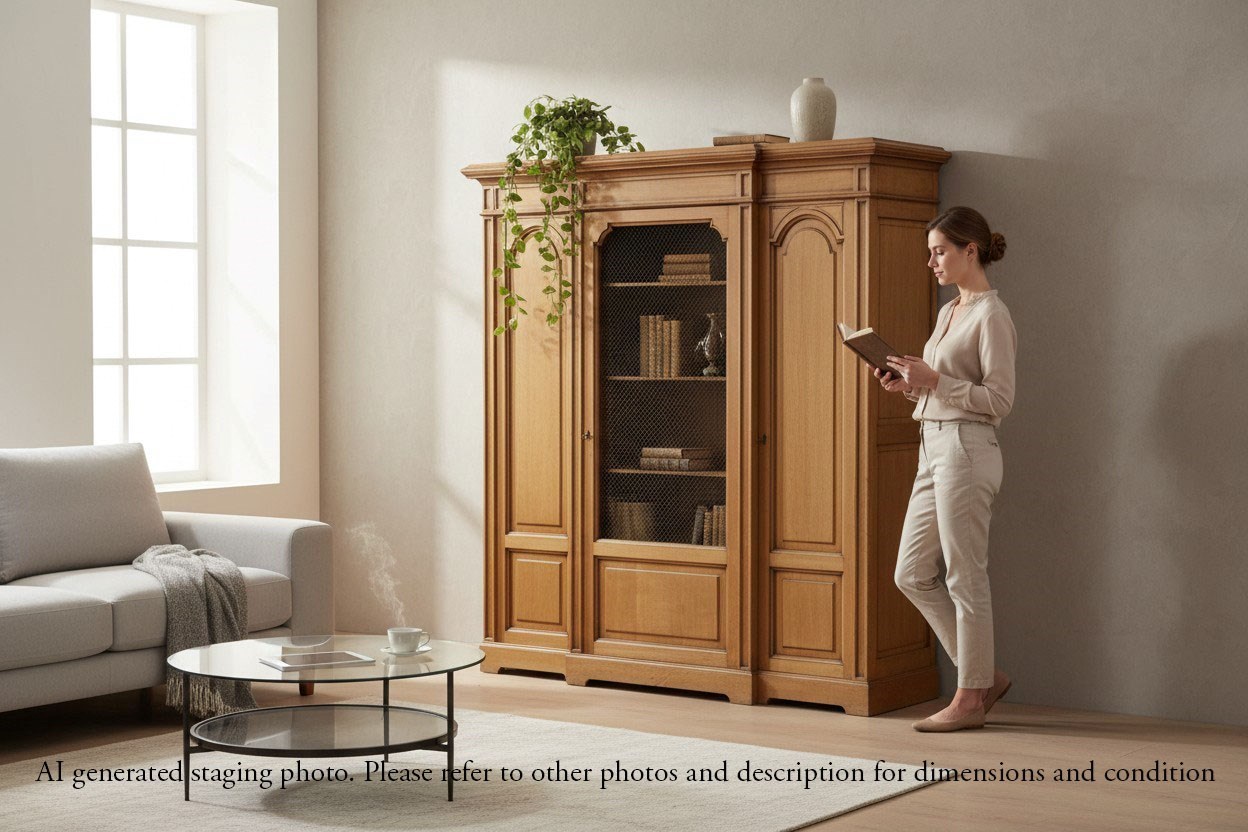 A superb early 20th-century light oak housekeeper’s cupboard, full of age, colour, and patina; brimming with charm and character. This rare decorative find offers enormous storage capacity, making it ideal for displaying and storing books, kitchenware, or collectables. Its elegant proportions and light oak finish bring warmth and presence to any room, and the piece conveniently comes apart for easier transport.