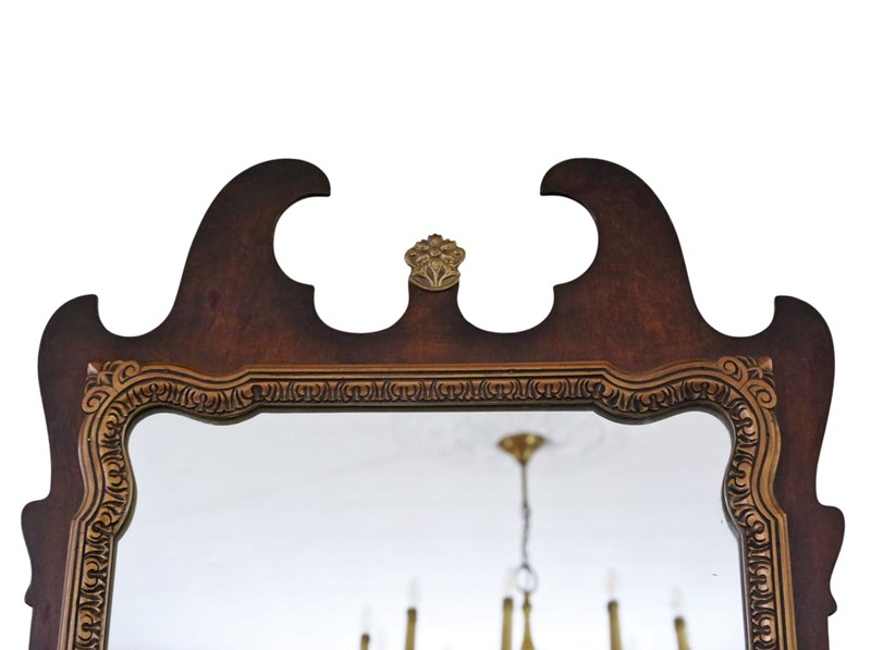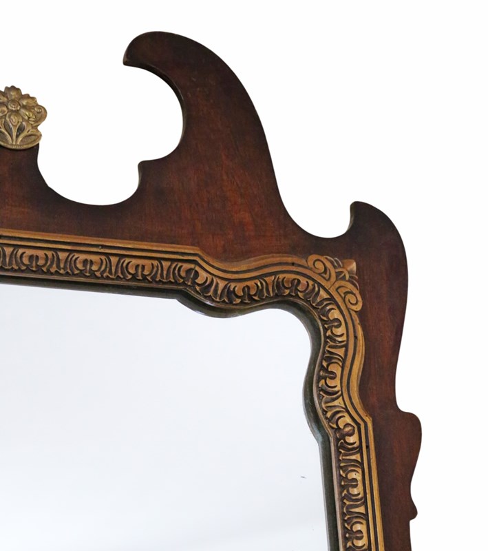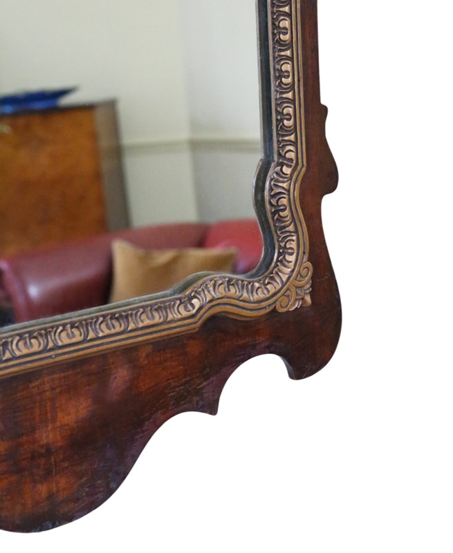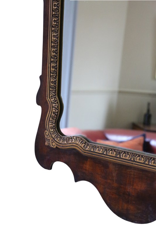 A decorative and practical overmantle mirror, full of charm and character, which displays lovely aged colour and finish. The gilt and mahogany veneer frame is fret-cut making it a striking statement piece for any room.