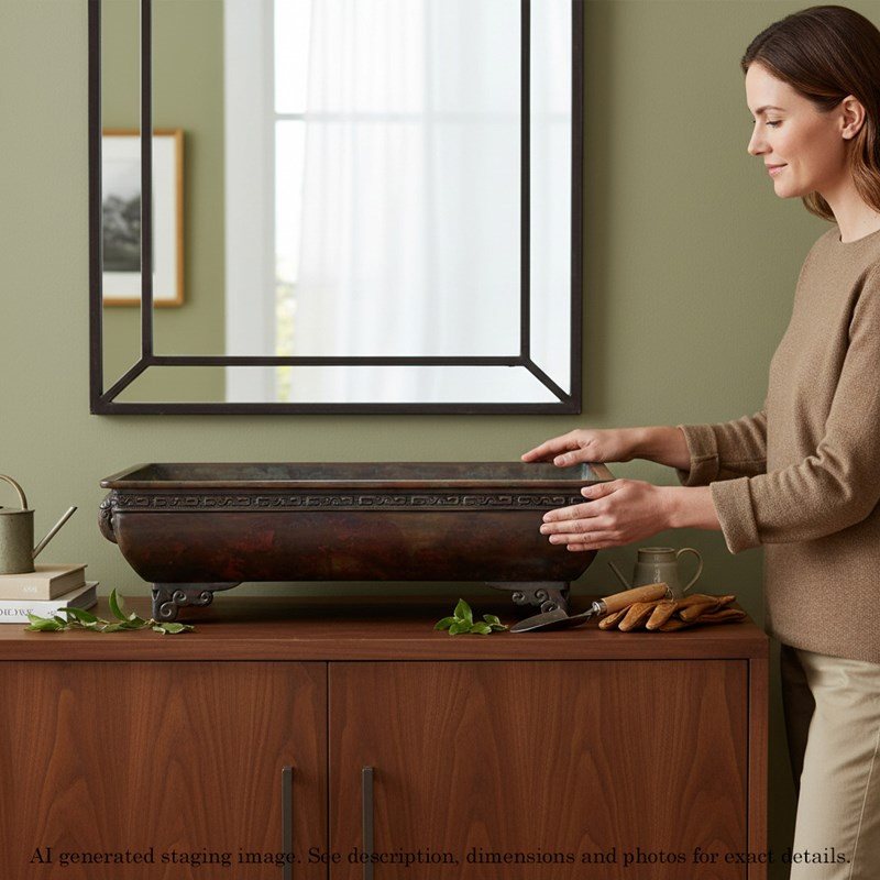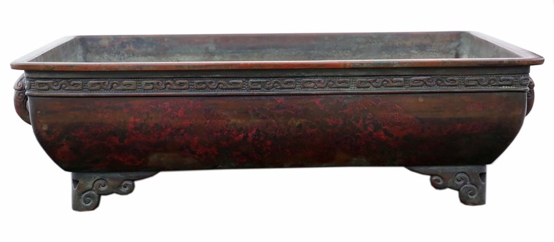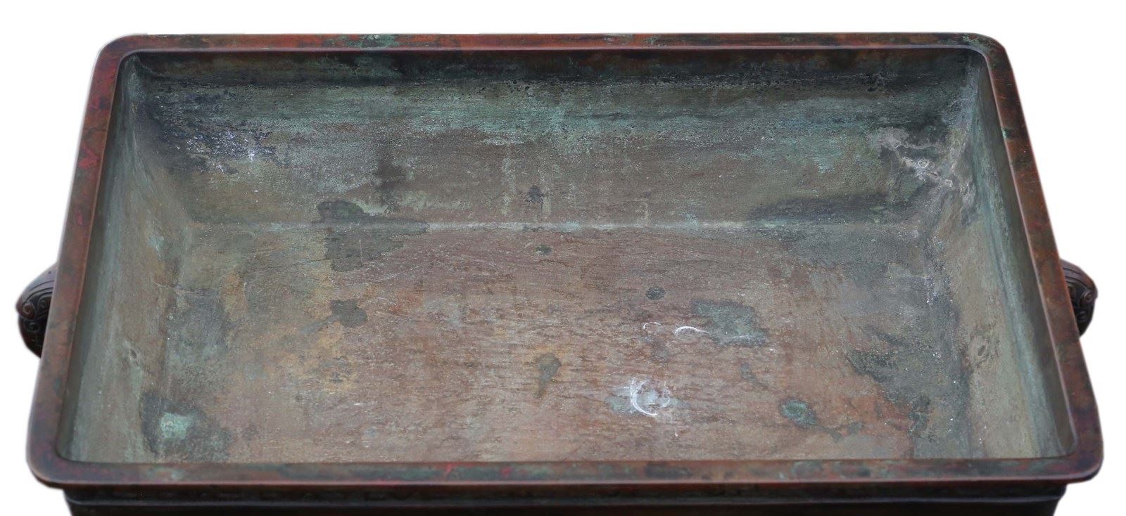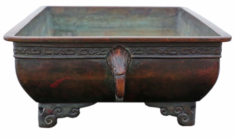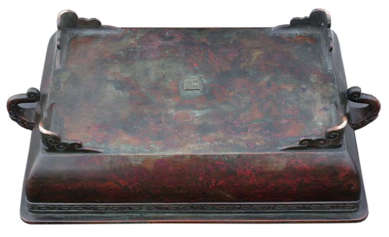Cast using the traditional lost wax technique, this piece also bears the maker’s mark on the base, which illustrates its provenance. Measuring an impressive 46 cm in length (including handles) x 31 cm in width x 13.5 cm in height (internal dimensions 42 cm x 27 cm x 10 cm), it is ideal for floral arrangements or bonsai displays. Its elegant form and fine detailing make it a striking addition to many settings.