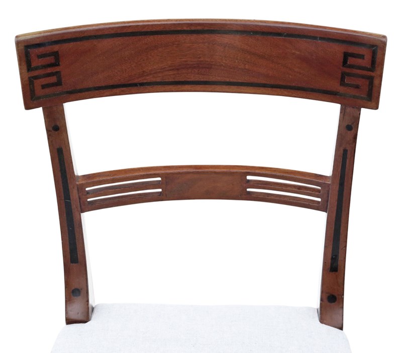 A rare decorative find, this set of eight early 19th-century Georgian mahogany dining and carver chairs is full of age, character, and charm. With new professional upholstery, they bear desirable sabre legs and ebonised Greek key inlays—the latter a distinctive Regency / Georgian feature. These chairs are structurally sound and would make a practical yet elegant addition to a dining room, study, or period-inspired interior.