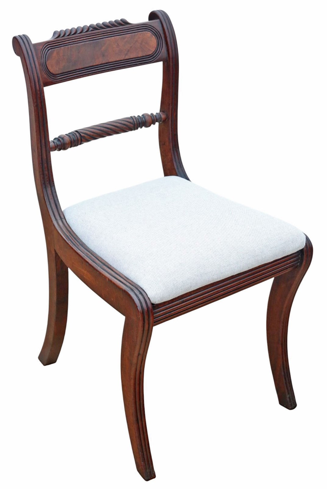 A rare decorative find, this set of eight early 19th-century Georgian mahogany dining and carver chairs is full of age, character, and charm. With new professional upholstery, they bear desirable sabre legs and Trafalgar twist backs—distinctive Regency / Georgian features. These chairs are structurally sound and would make a practical yet elegant addition to a dining room, study, or period-inspired interior.