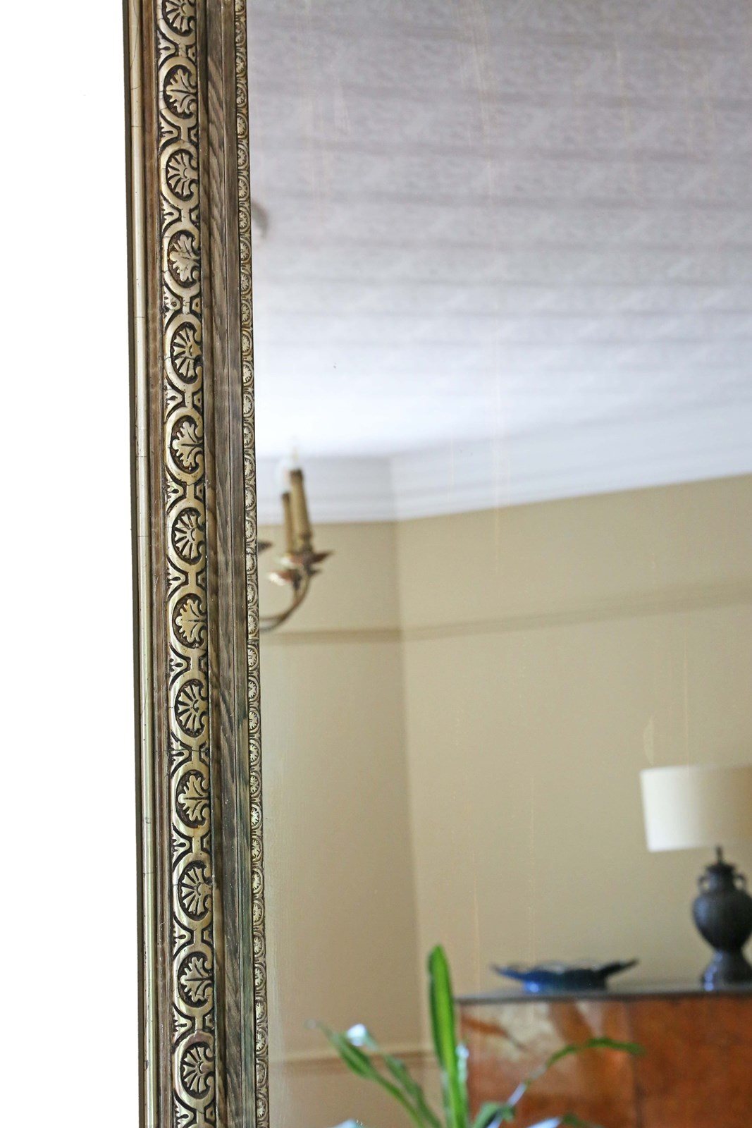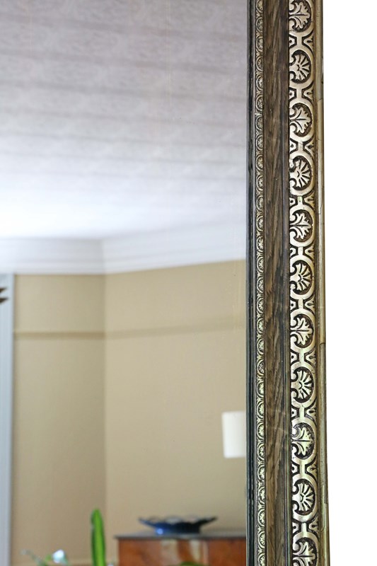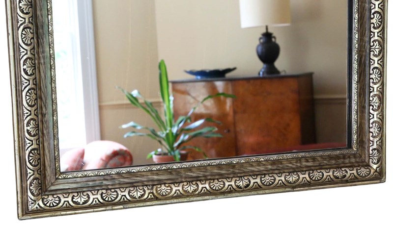 The frame is solid with no loose joints or signs of woodworm. The mirrored glass is in good condition overall, showing light oxidation, gentle shadowing, and other age-related imperfections consistent with antique mirrors of this period.