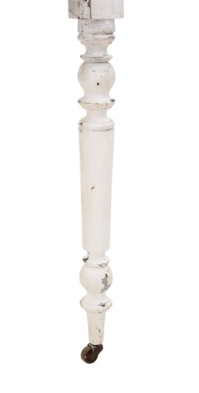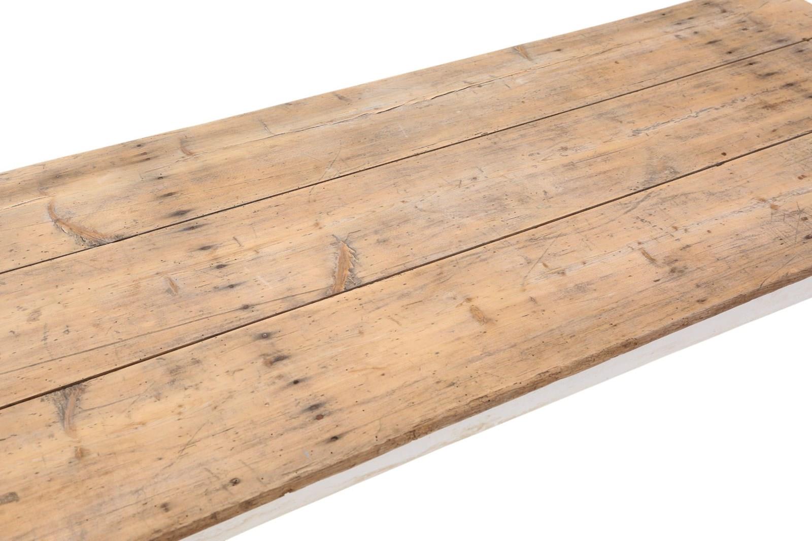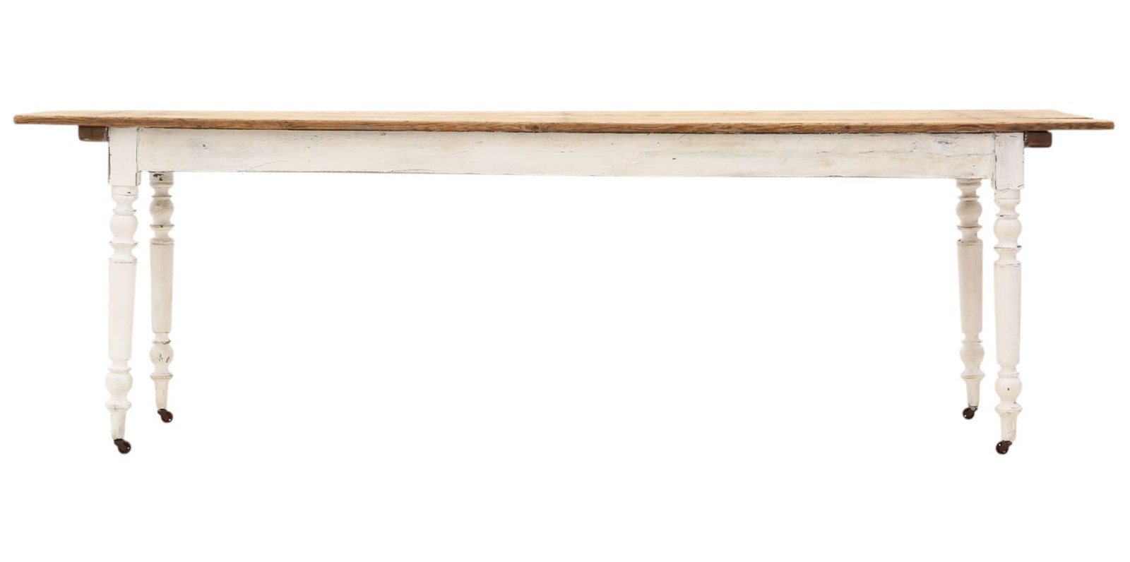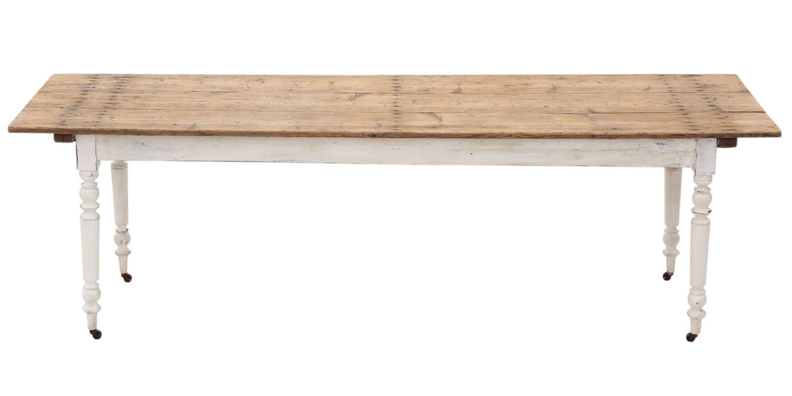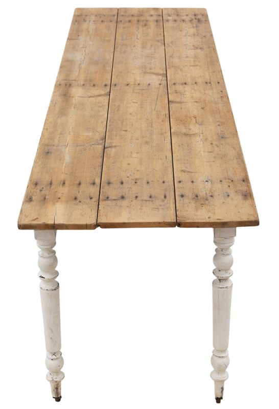 A charming and practical antique table dating from the late 19th to early 20th century, with a beautifully patinated pine top. Its long, narrow proportions and rustic character make it ideal as a kitchen dining or serving table, blending seamlessly into both traditional and eclectic interiors. The base retains traces of old, worn white paint, adding to its farmhouse appeal.