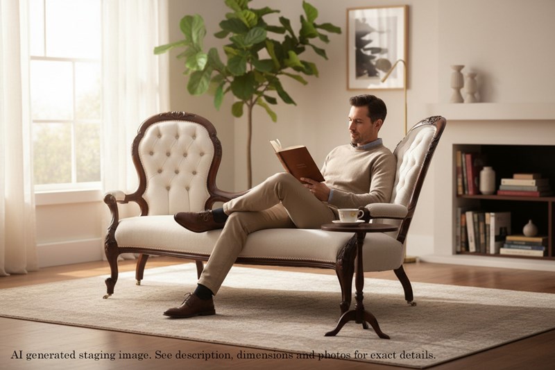 Recently reupholstered in a soft, mottled cream velour with classic button-back detailing, it exudes charm and sophistication. It has replacement castors and leg extensions to ensure its stability.
