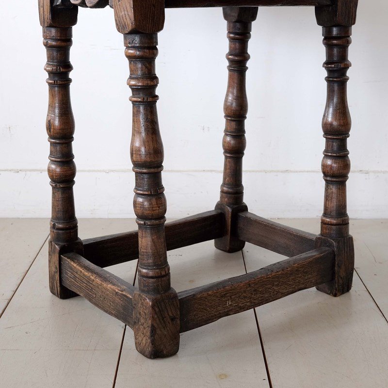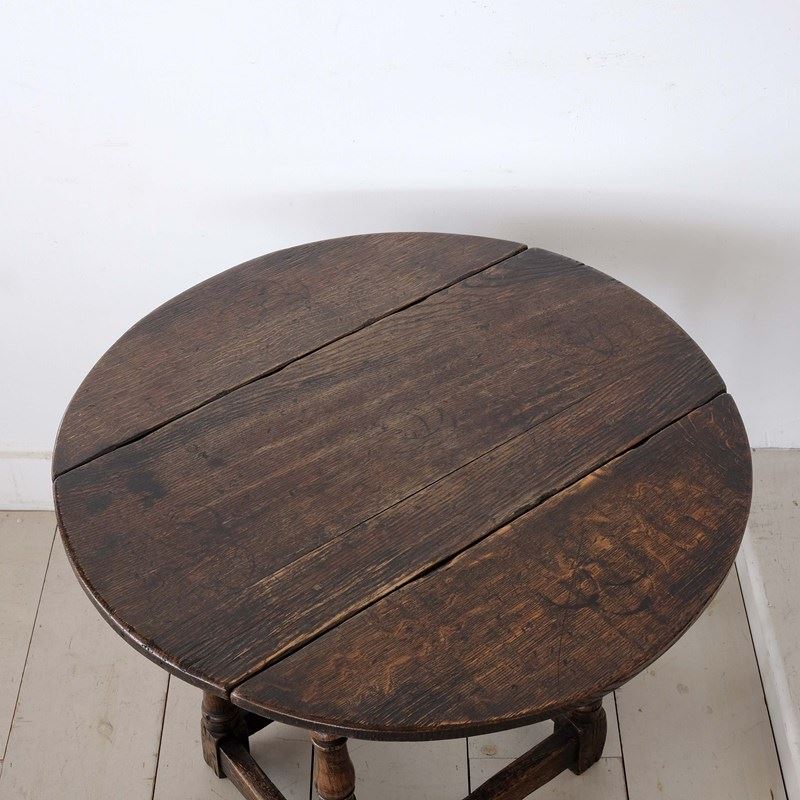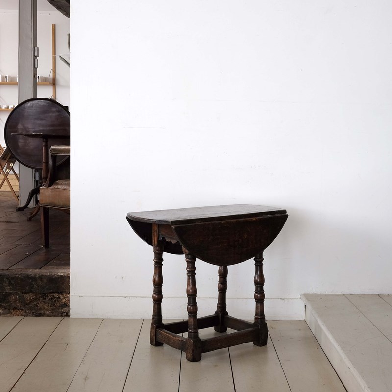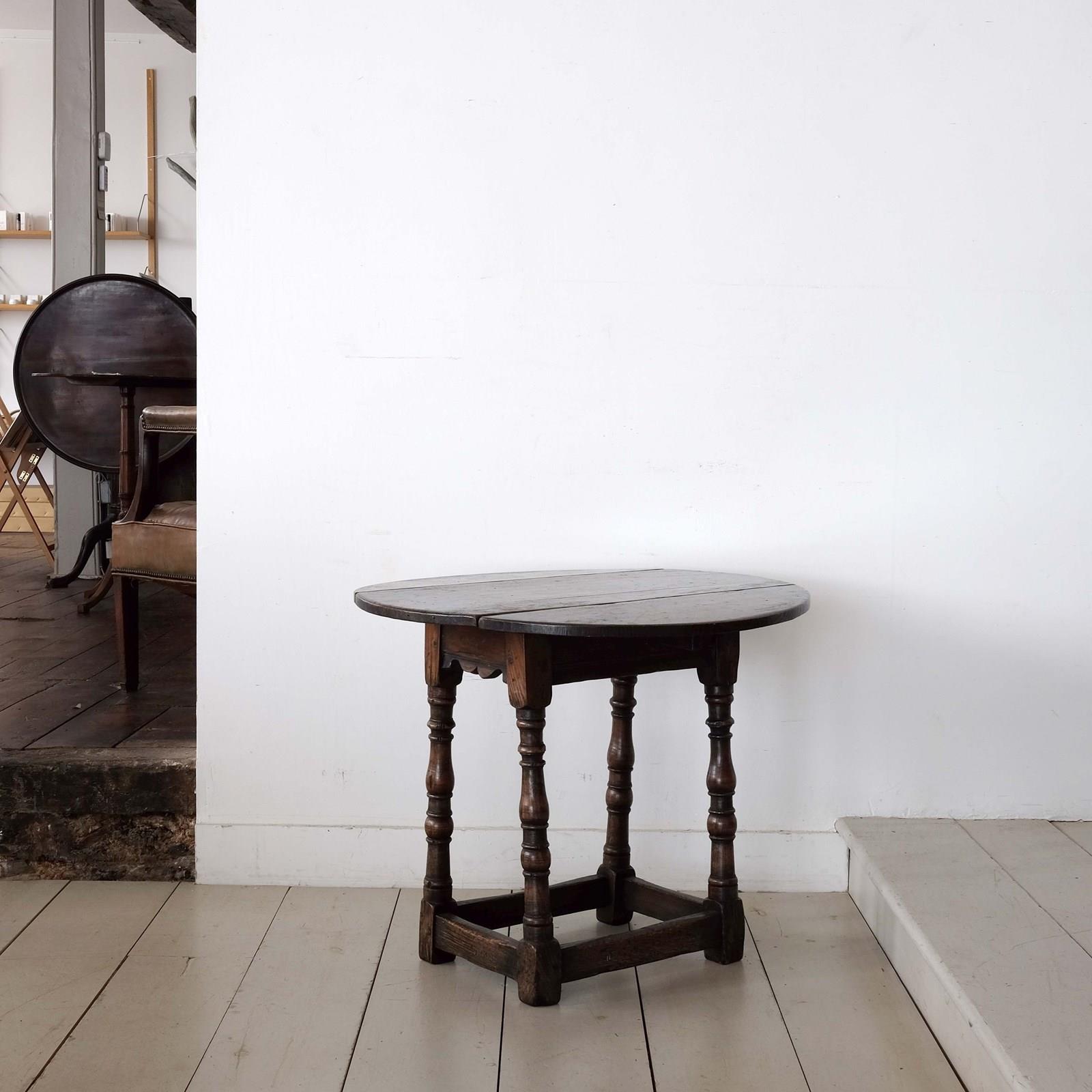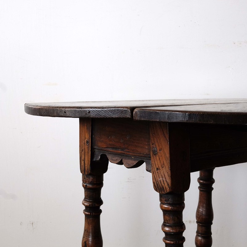 An unusual late 18th century drop leaf side table in Oak. England circa 1780. Oak drop leaf top on a jointed frame with a shaped appron, turned legs and connecting rails. Lovely dark rich patination. Perfect armchair side table height and proportions.