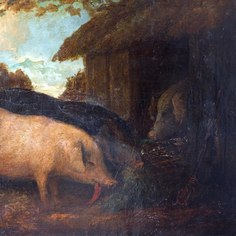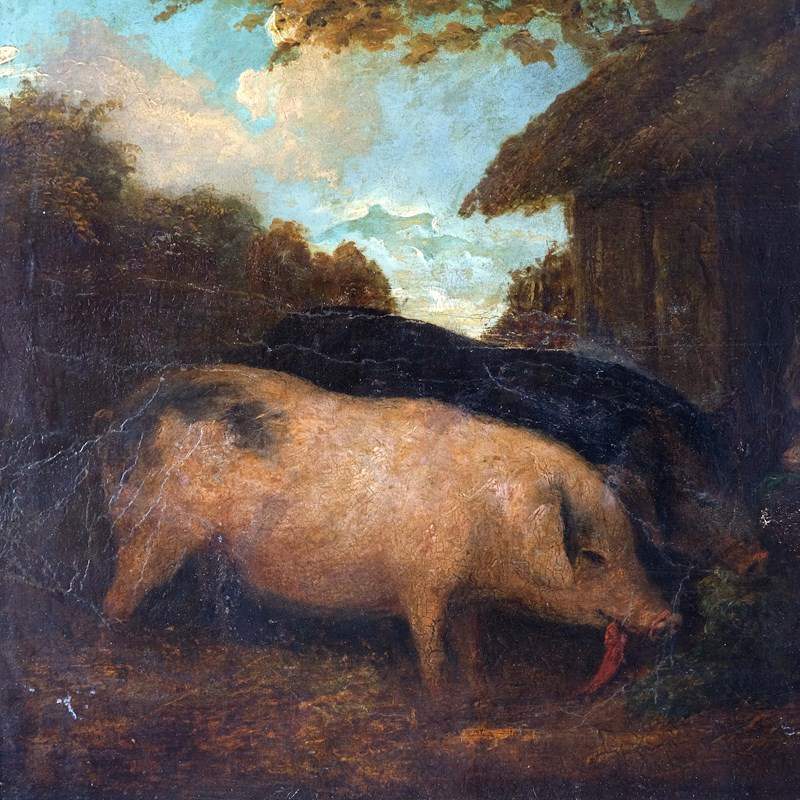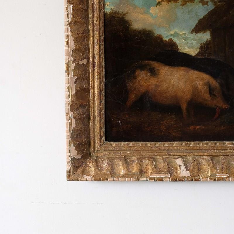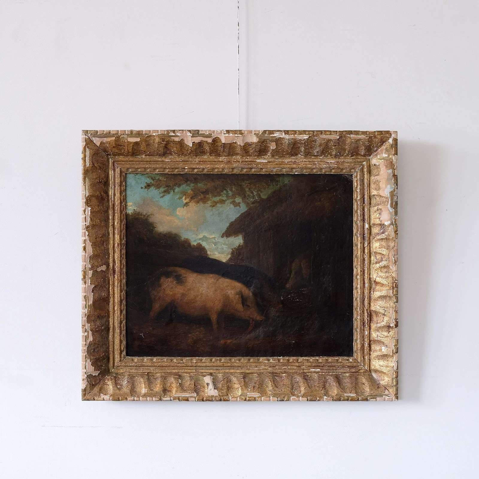 An exceptionally charming 18th century English farm scene depicting Pigs in their sty. Oil on card paired with a 1940s French hand carved montparnasse frame. Unsigned but lovely naive execution.