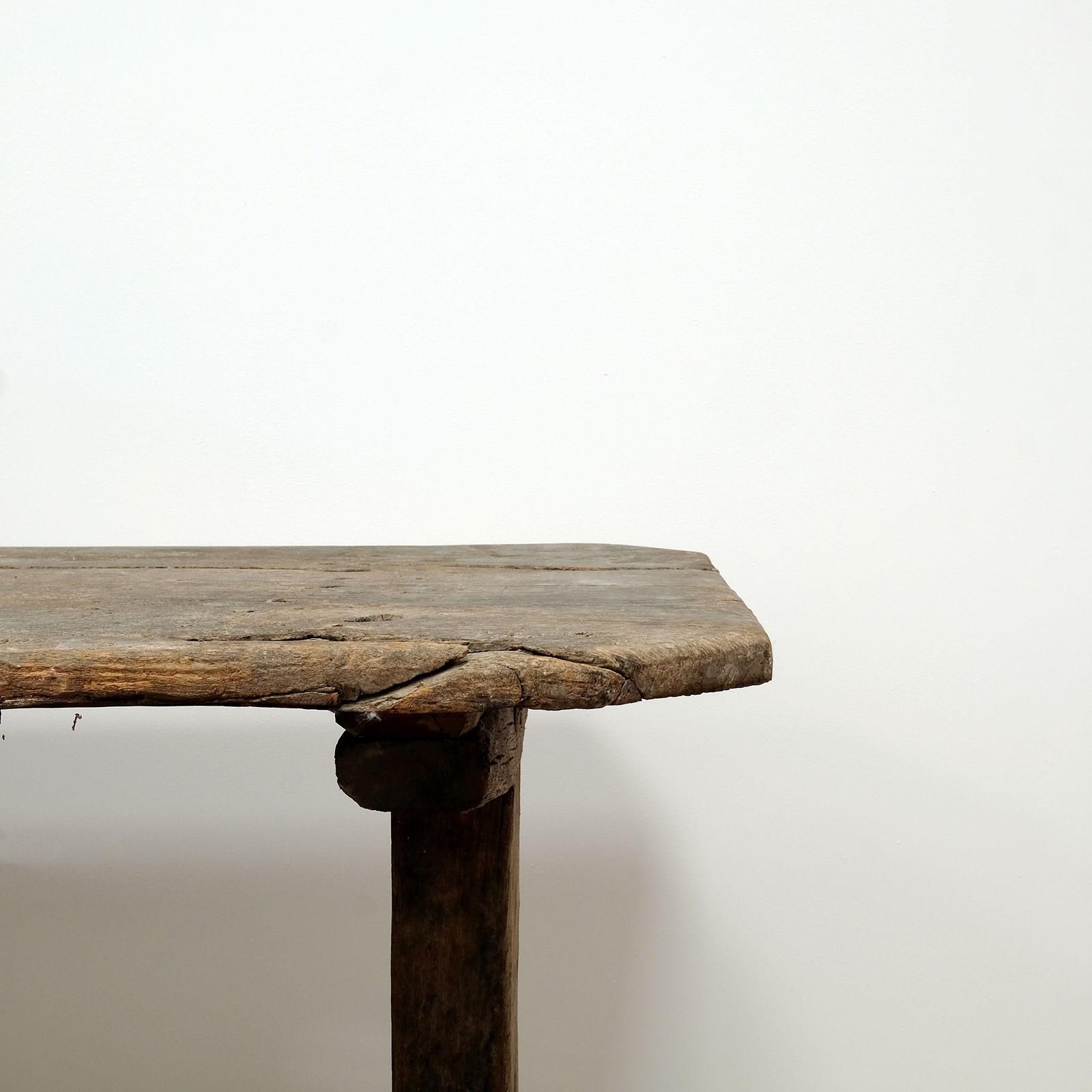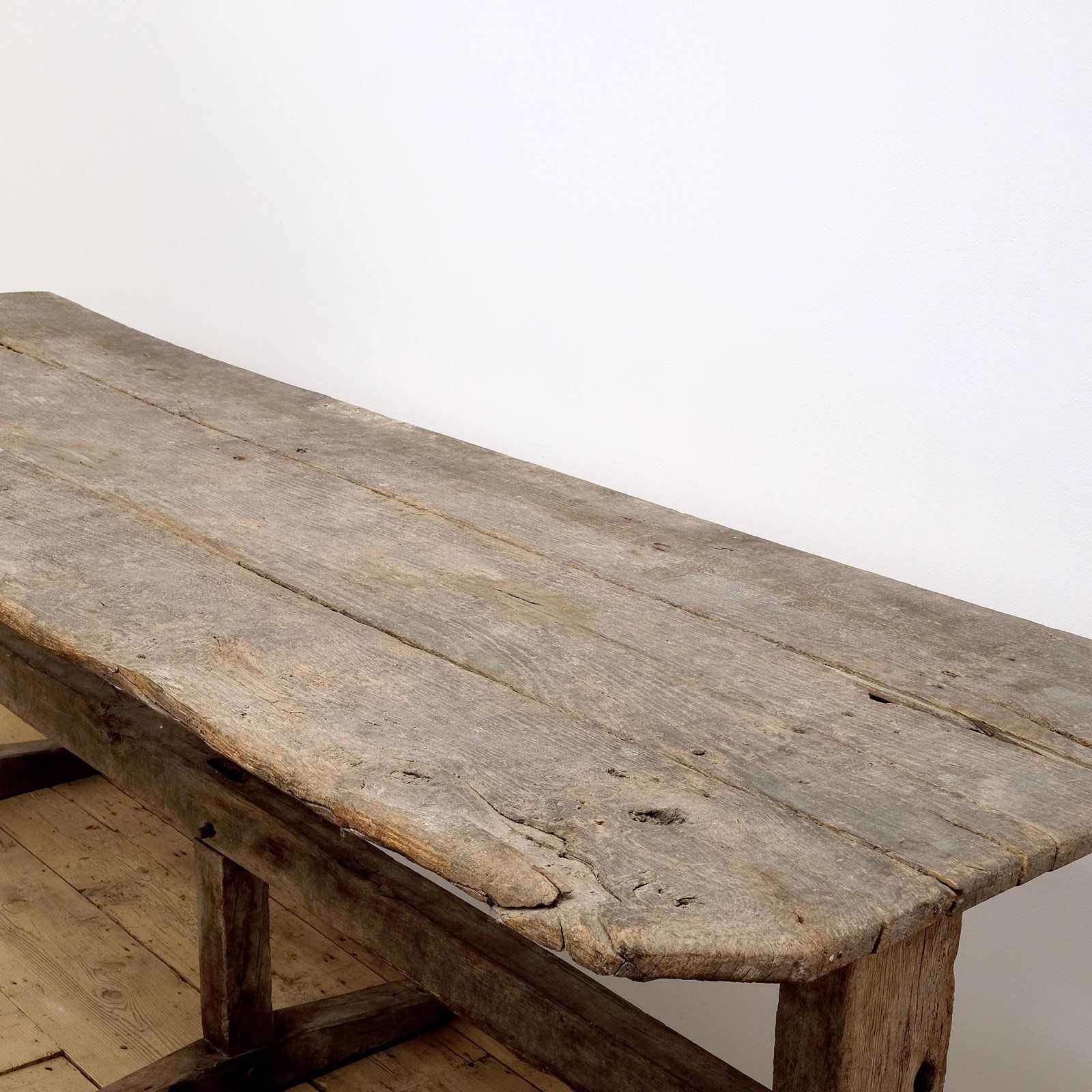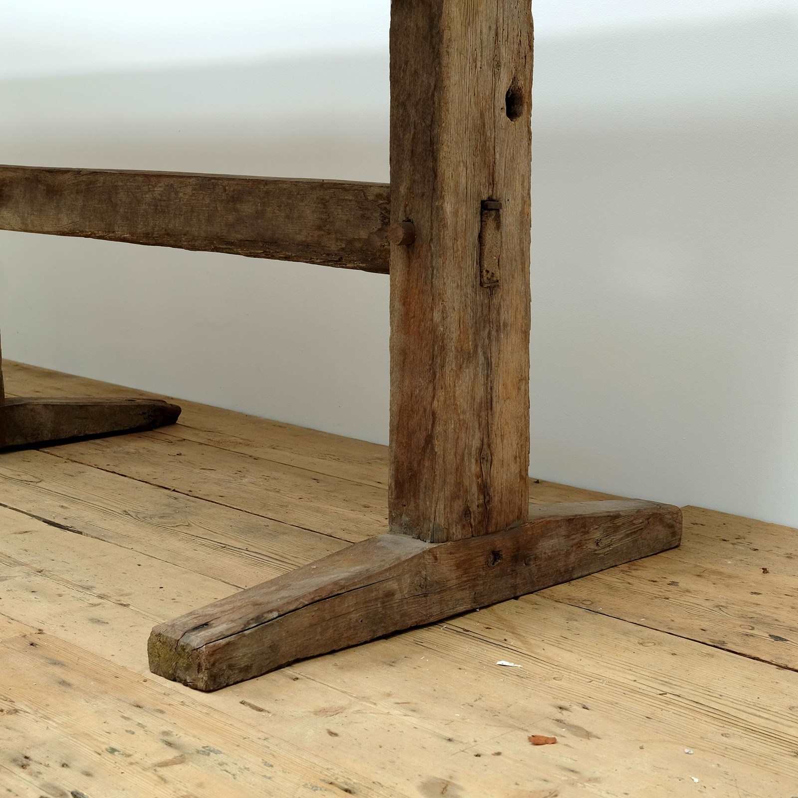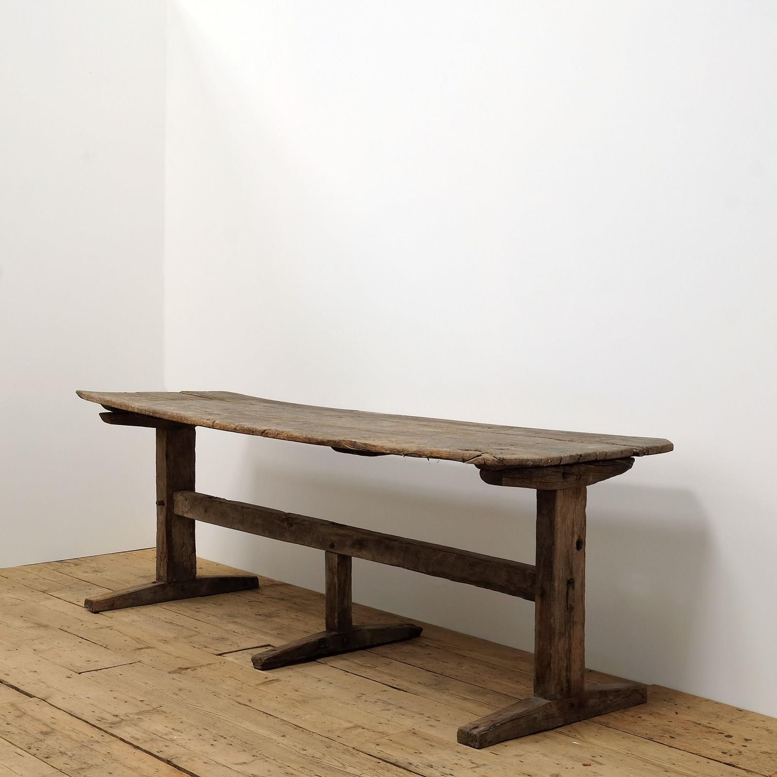 An exceptional trestle table, 18th century (or earlier), Heavy chestnut top on a trestle base. Originating from the Massif Central, France. Wonderful historic patina and signs of age with soft edges.