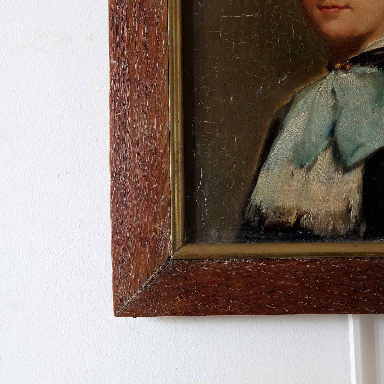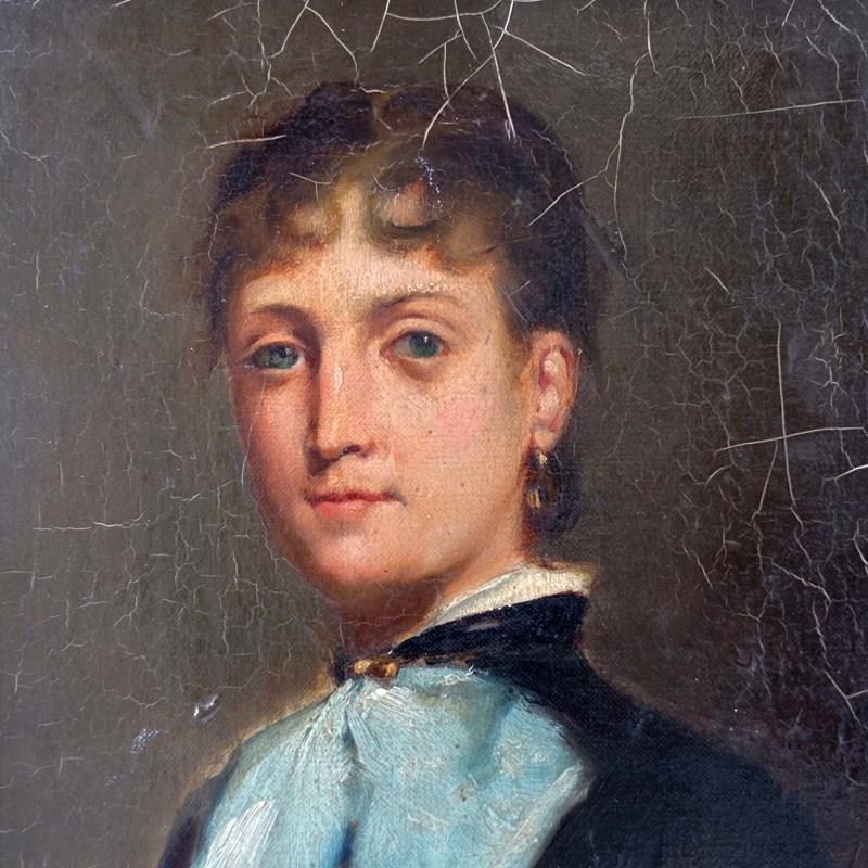 A very arresting portrait of a young French lady, oil on board, in an antique frame. Sitter and artist unknown but well executed capturing the sitters kind features.