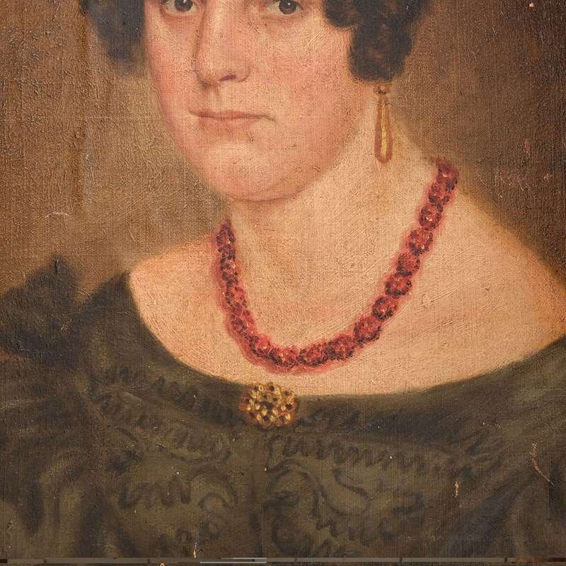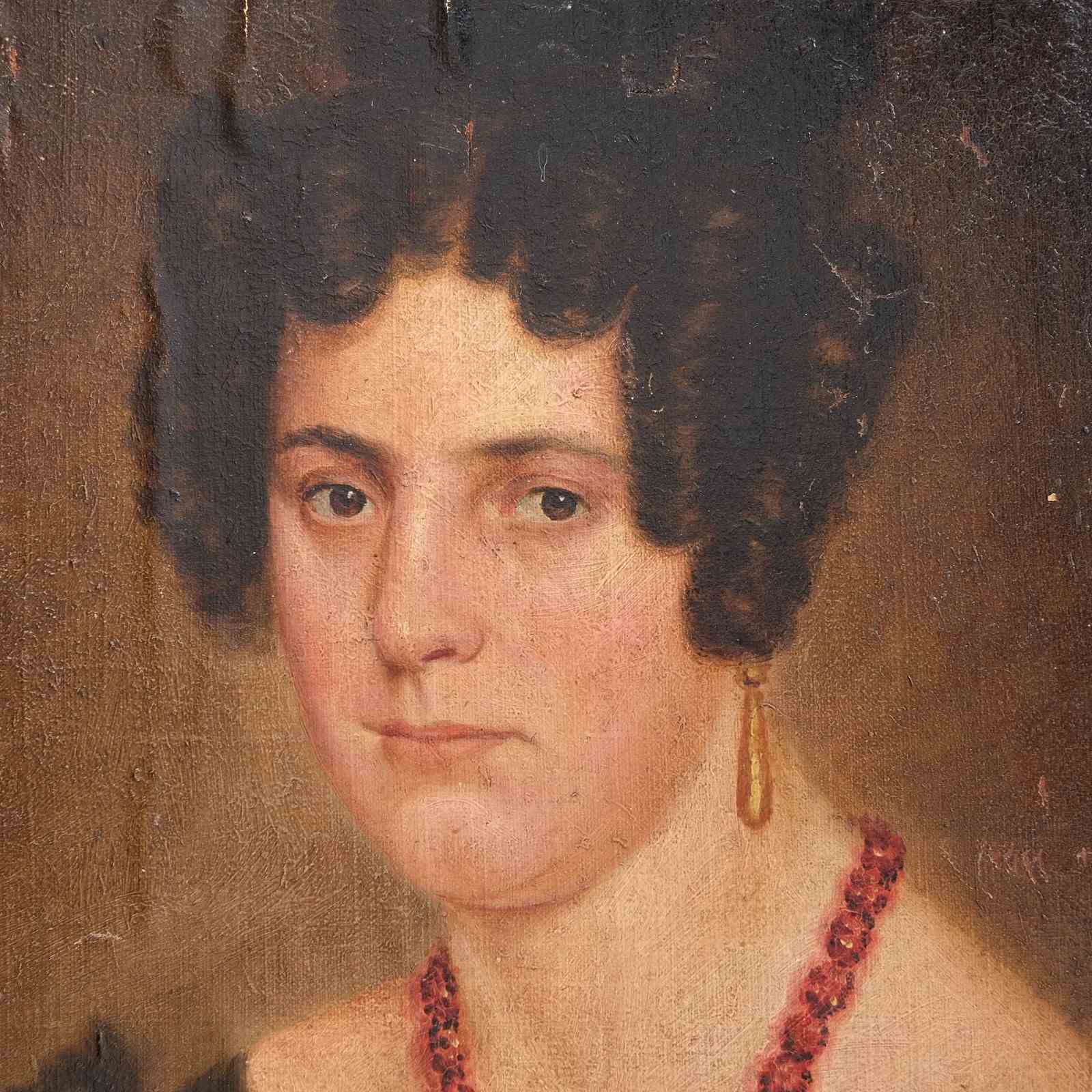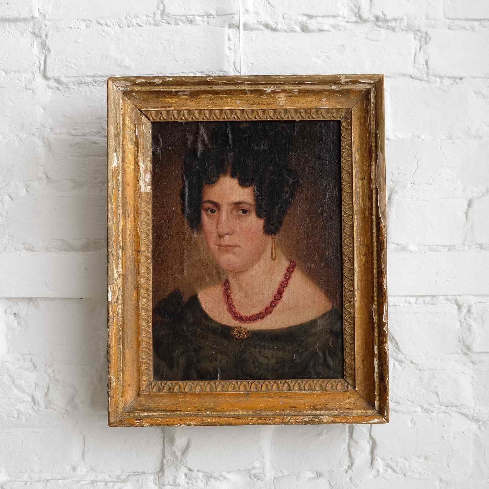 19th century portrait of an English lady, oil on canvas laid on board, in an antique gilded frame. Sitter and artist unknown. Lovely slightly naive execution.