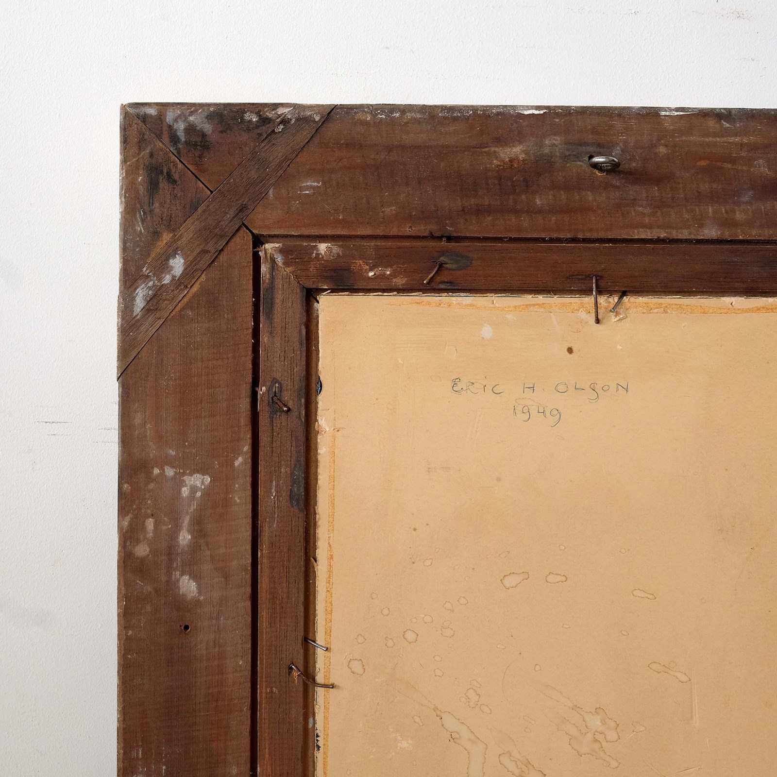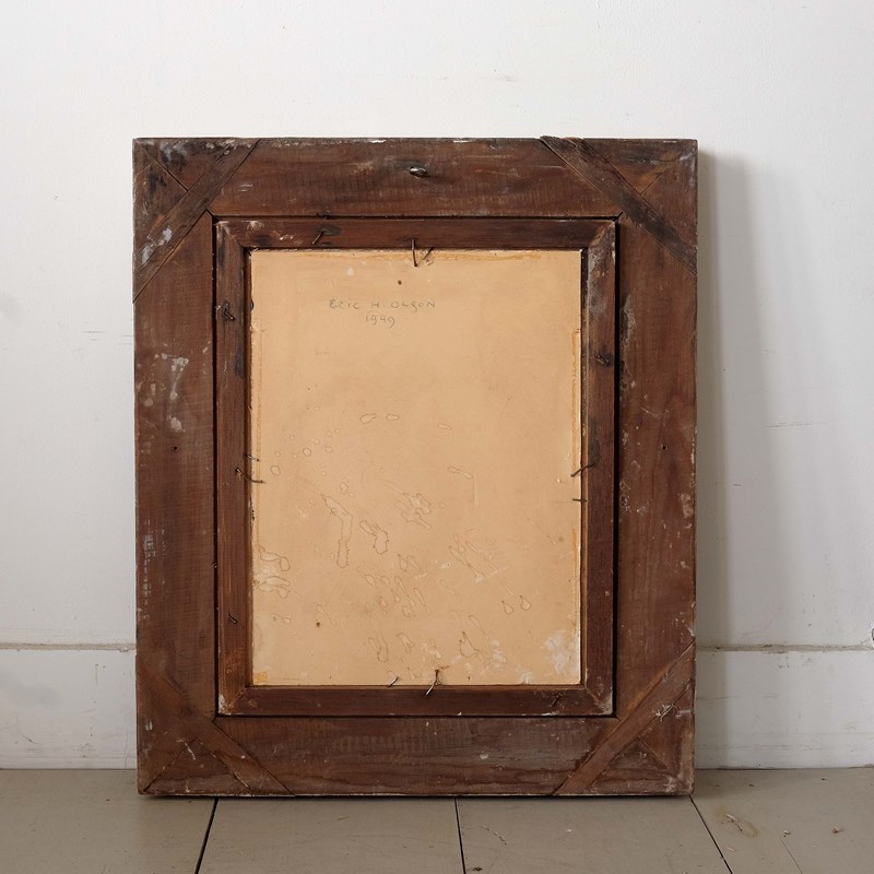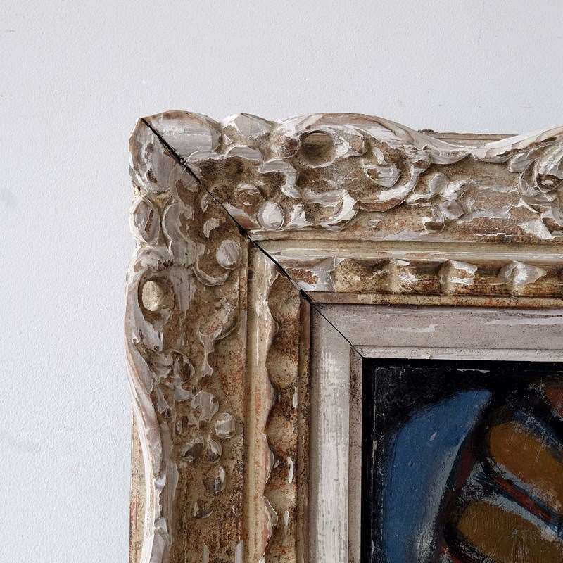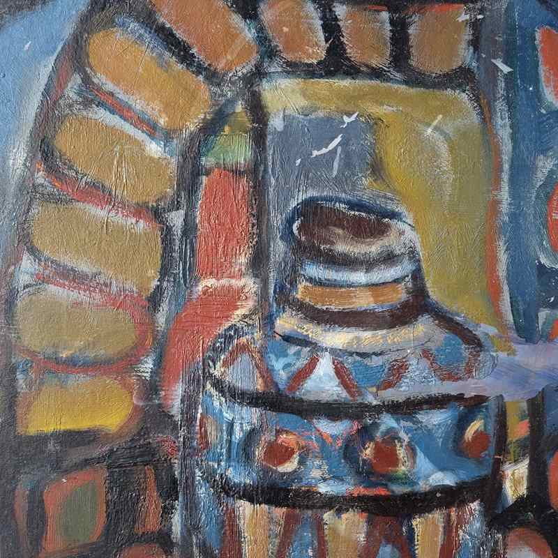 A wonderful abstract still life, oil on card, paired with a French Montparnasse frame, scribed verso 'Eric H Olsen 1949'. Attributed to Eric H Olsen (Swedish, 1909–1996).