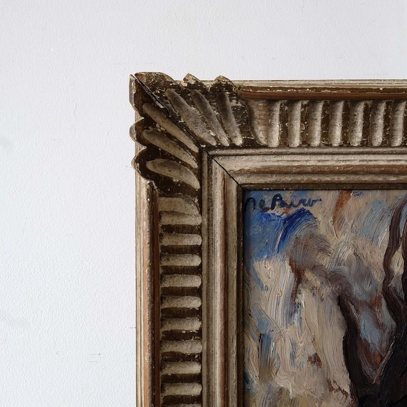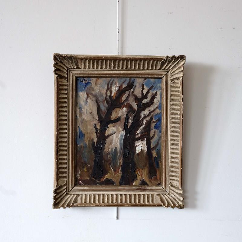 A lovely mid 20th century French artwork depicting stylised trees, oil on board, and paired with a French montparnasse frame. Signed top left but artist unknown.
