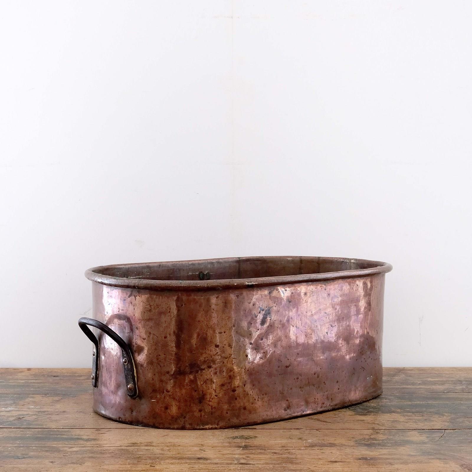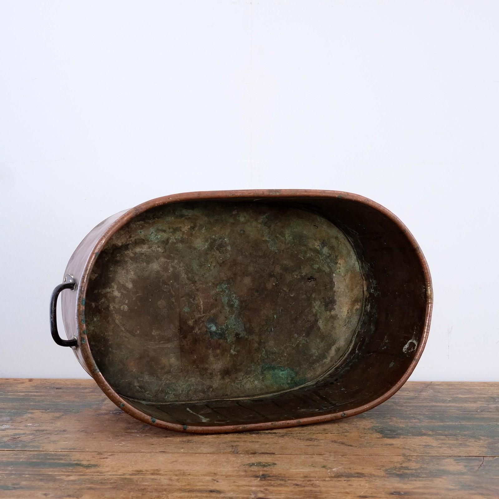 19th century antique French copper vessel/ boiling pan with riveted copper handles. Lovely shape and signs of age and wear. Good patination to the copper.