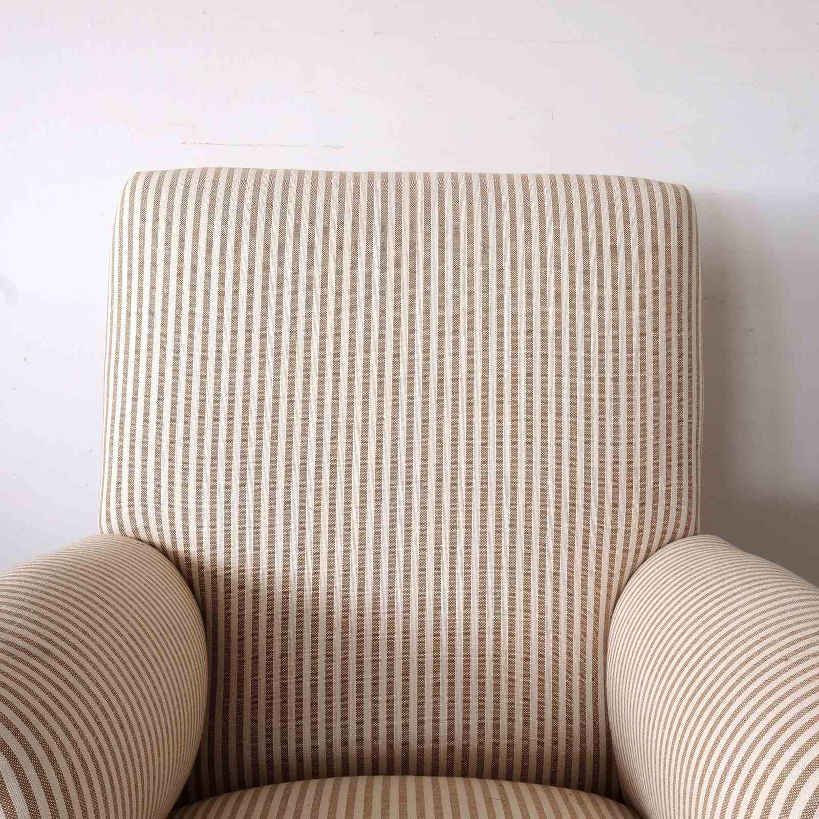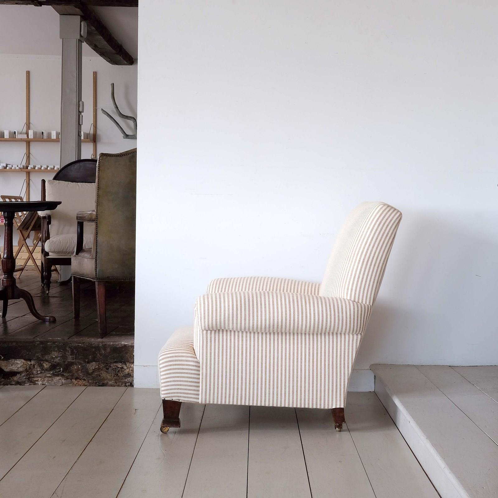 English country house armchair, circa 1900. Good quality hard wood frame raised on unusually chunky square tapered legs and original brass castors. Generous proportions and very comfortable. Restored and upholstered in caramel ticking from Merchant and Mills.
