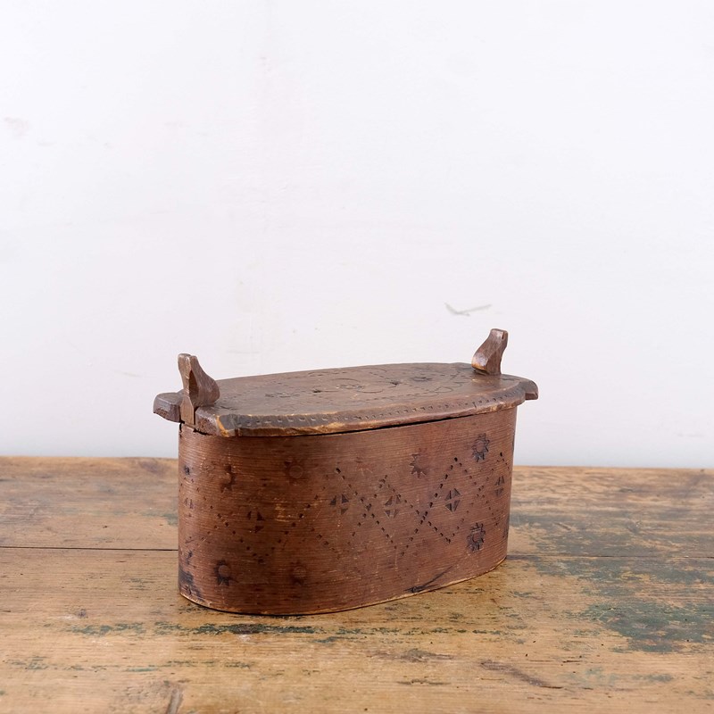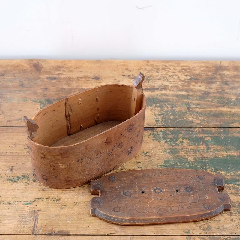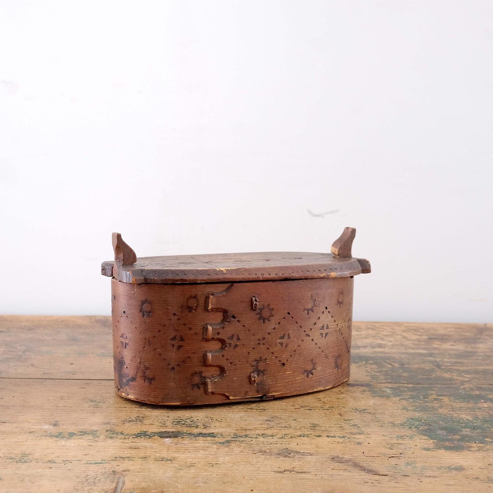 Early 19th century Swedish Folk Art trinket box, made in steamed beech bent wood with a lid and catch, with wonderful folk art engravings. Very charming.