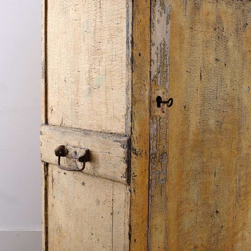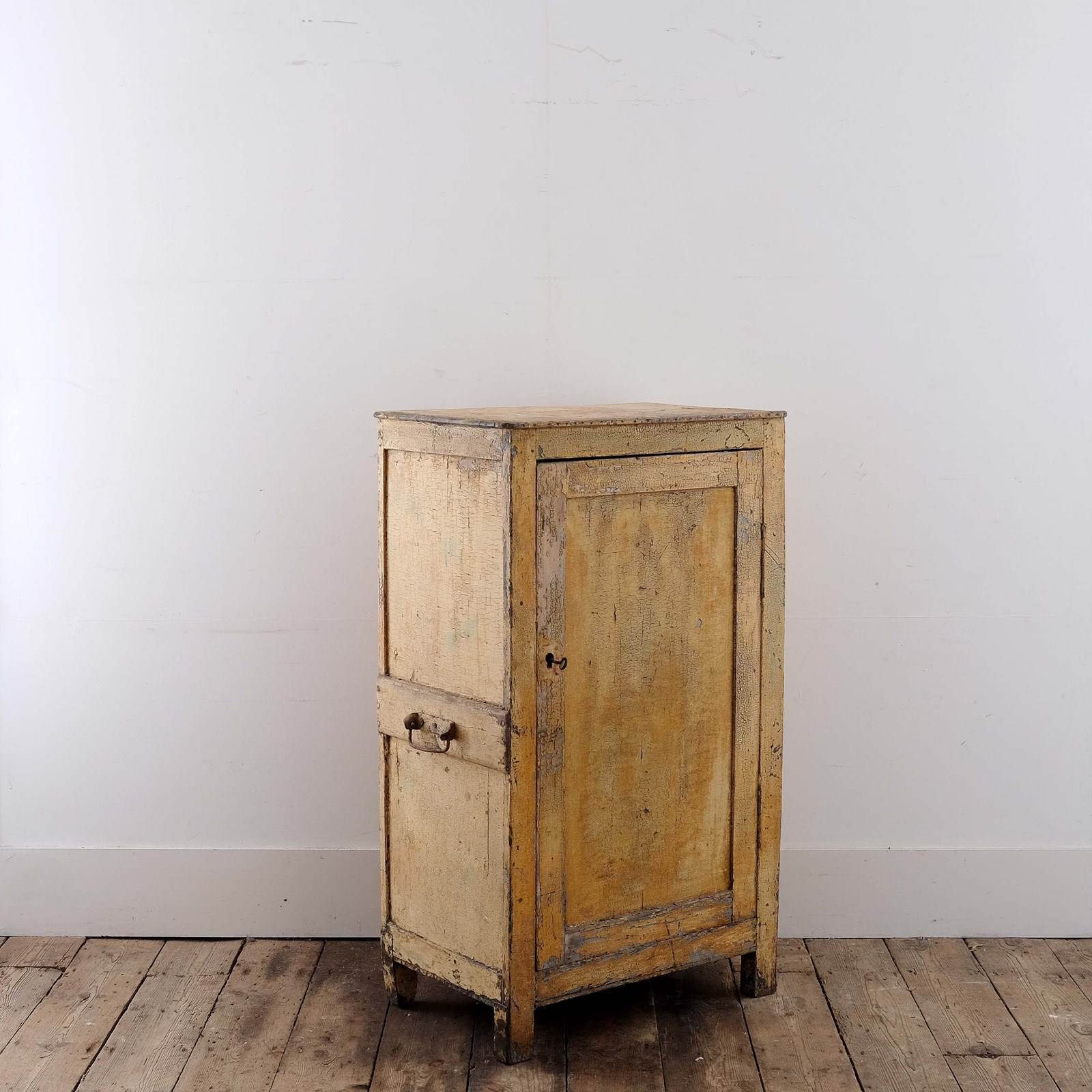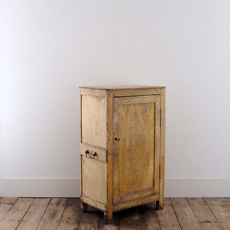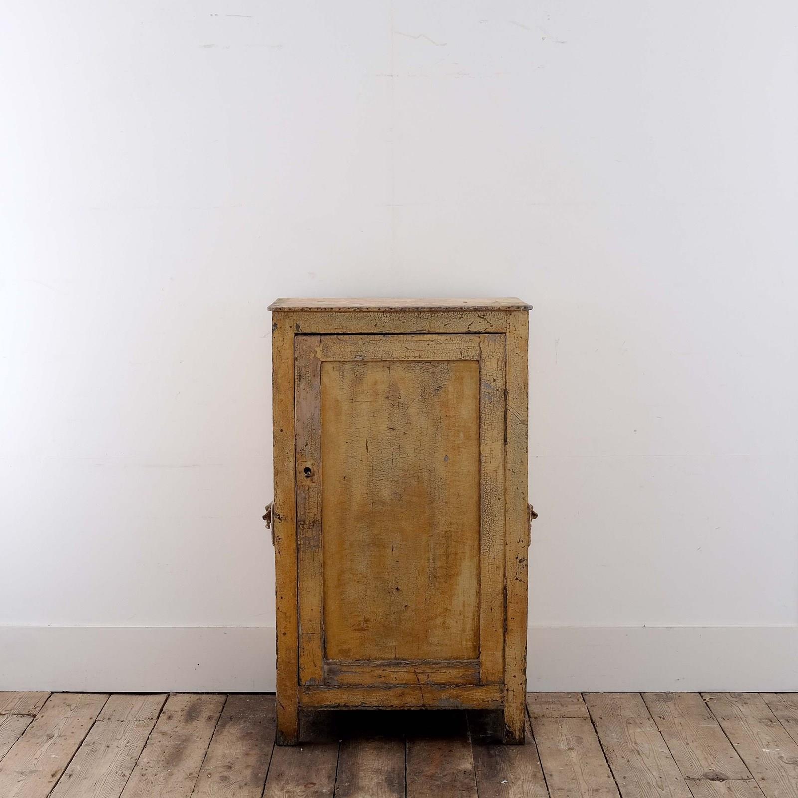 A charming late 19th century French jam cupboard. Panelled pine construction with the original handles, working lock, and remnants of the lovely original ochre paint. Useful small proportions for fitting in awkward niches!