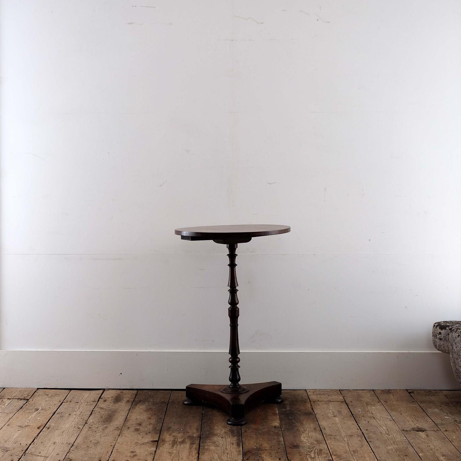 19th century English side table, rosewood veneered top with lovely figuring, supported by a finely turned pedestal on a rose wood veneered base.