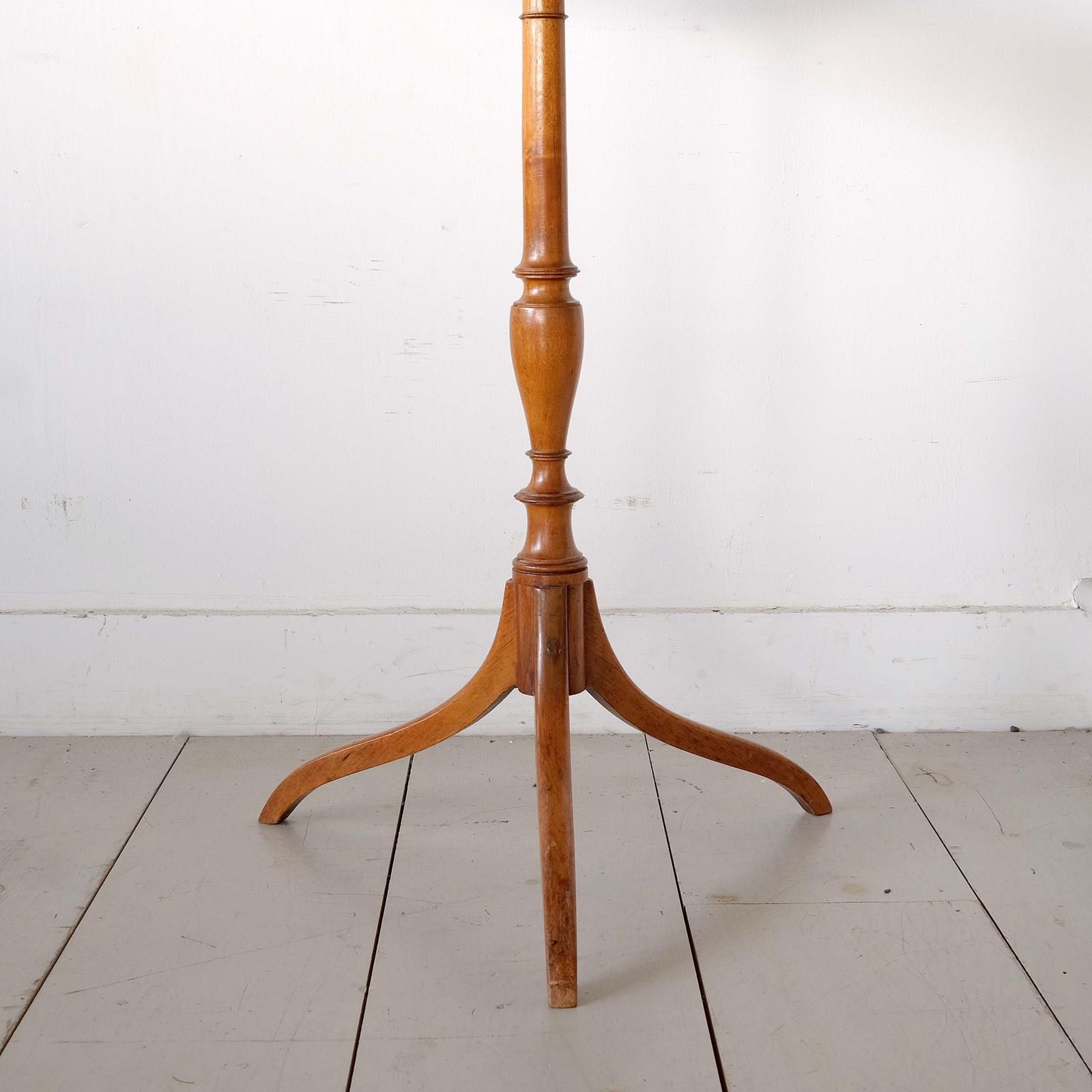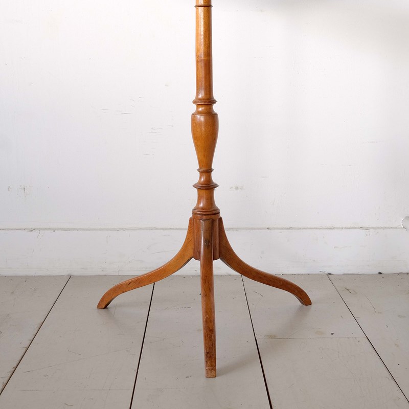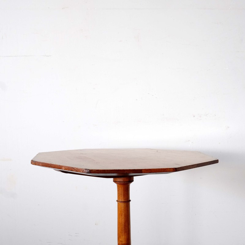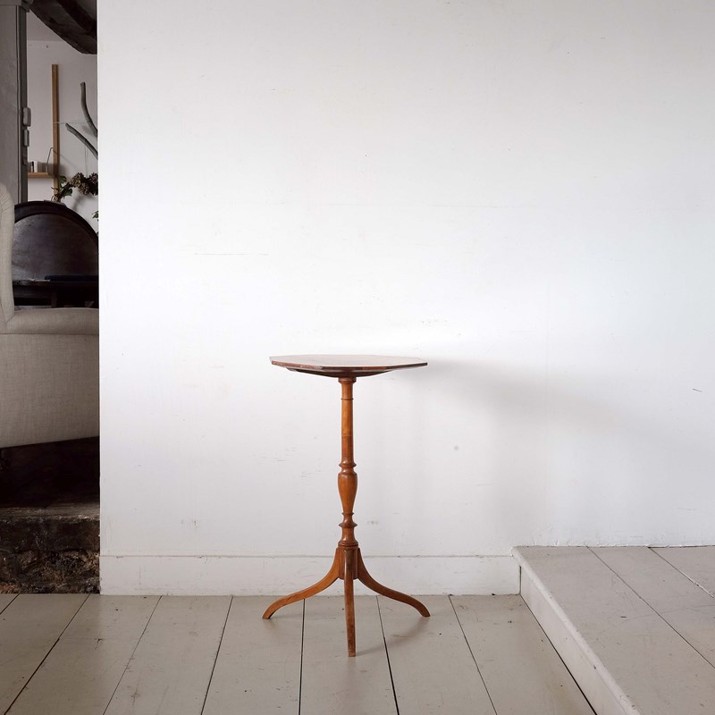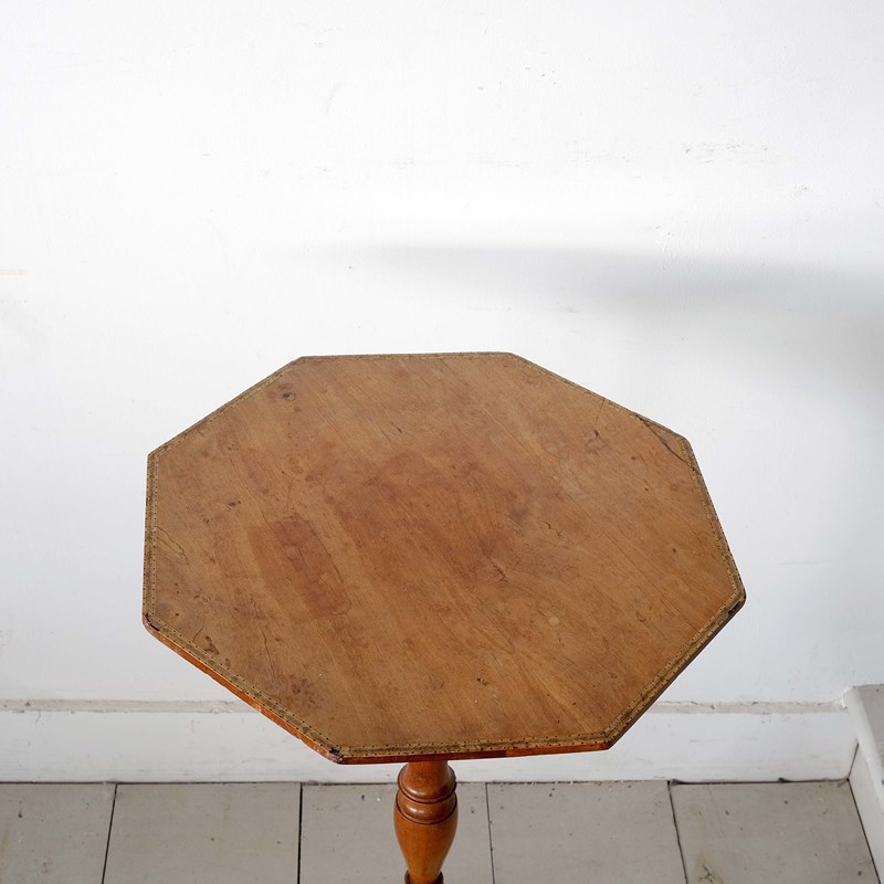 Early 19th century English wine/ side table in satinwood. Octagonal top with inlay decoration around the edge on a very elegantly turned pedestal base and lovely honey colour.