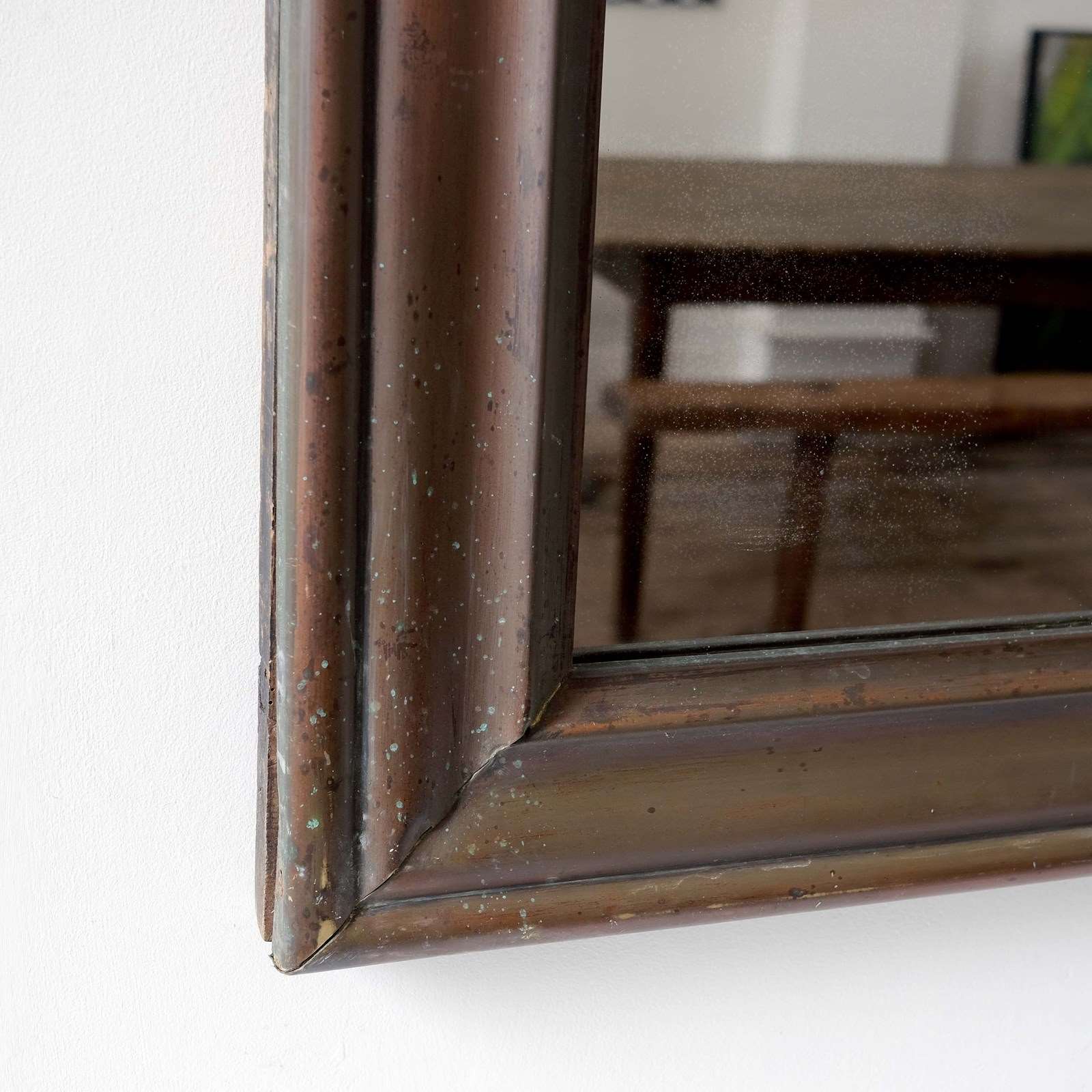 Late 19th century French bistro mirror. Original plate, original panelled back, original substantial brass plated frame with lovely patination. Great near square proportions.