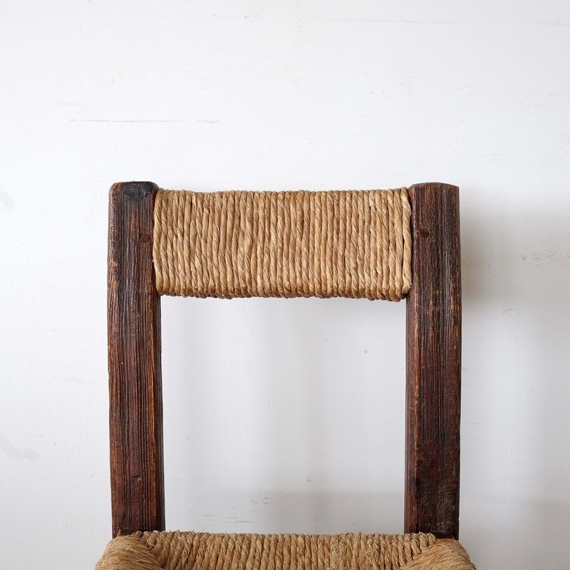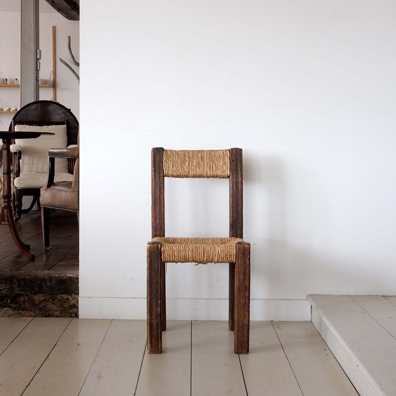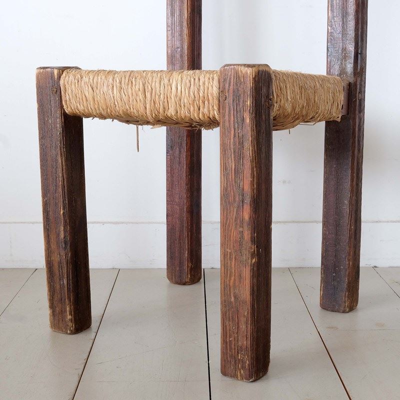 Mid 20th century Brutalist chair from the Pyrenees, France. Chunky square frame in Pine with remnants of the original finish. Original rushed seat and back rest. Stylish simple form.