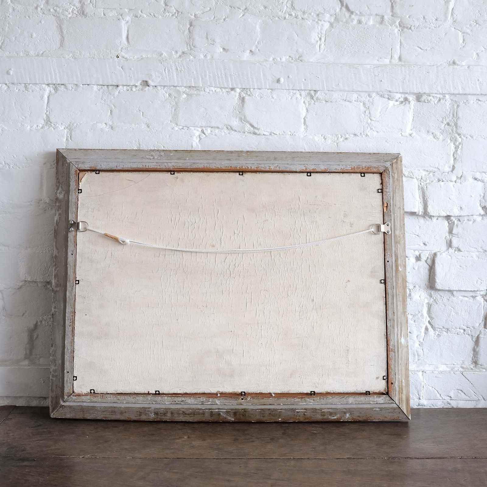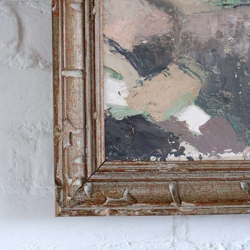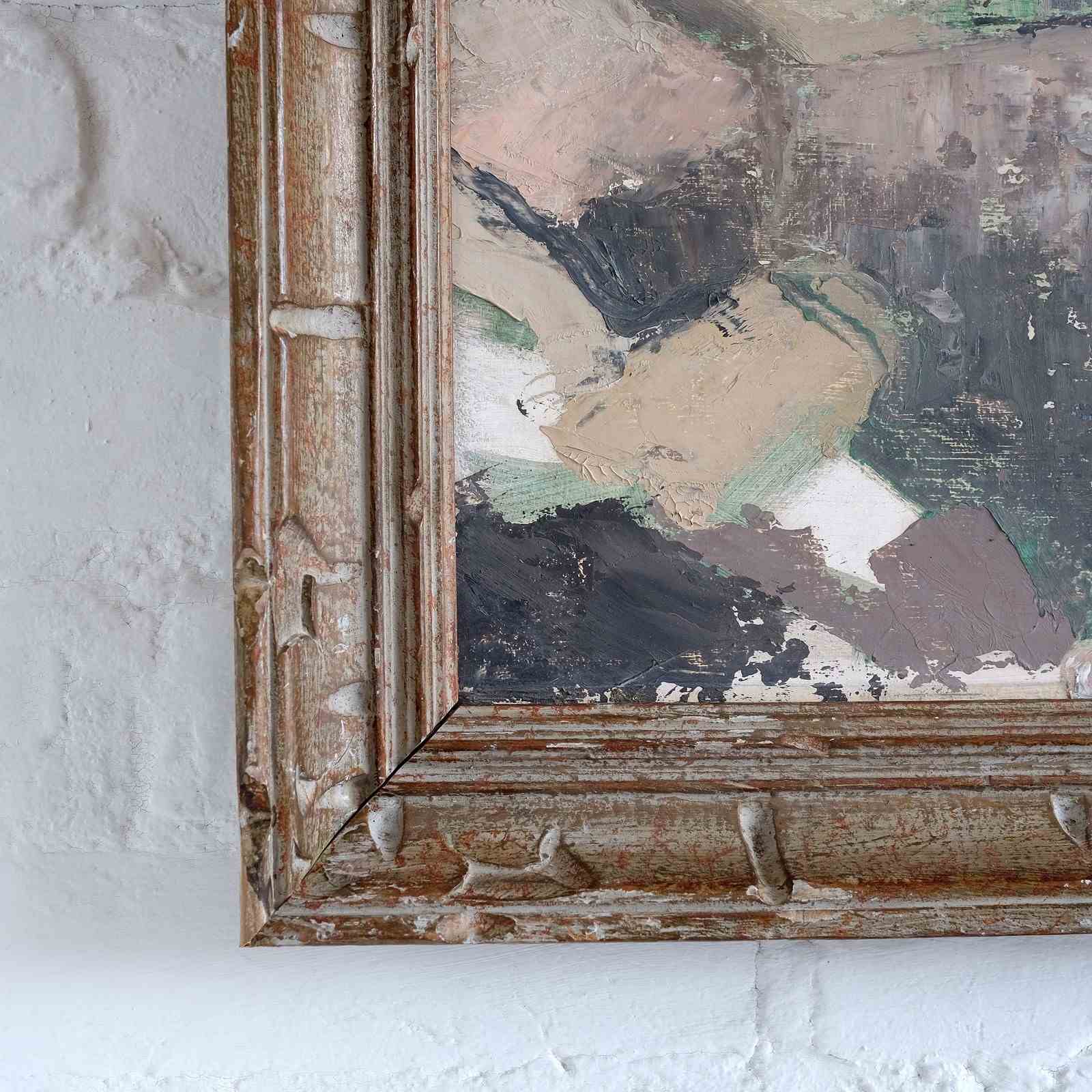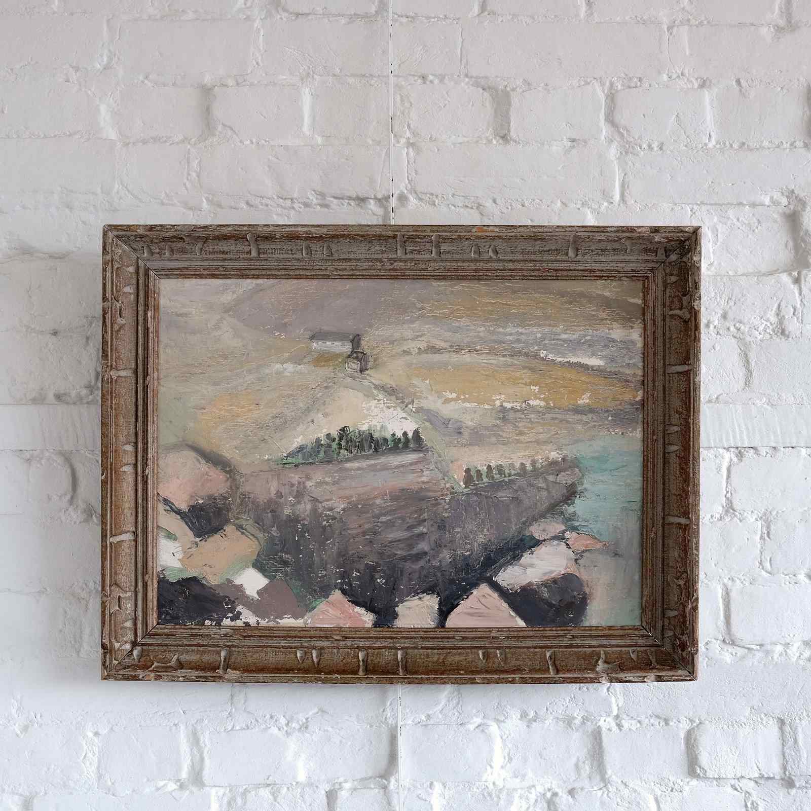 A very calming coastal scene, British school, mid 20th century, oil on board, in a vintage French frame. Artist and location unknown but lovely abstract slightly naive execution and muted palette.