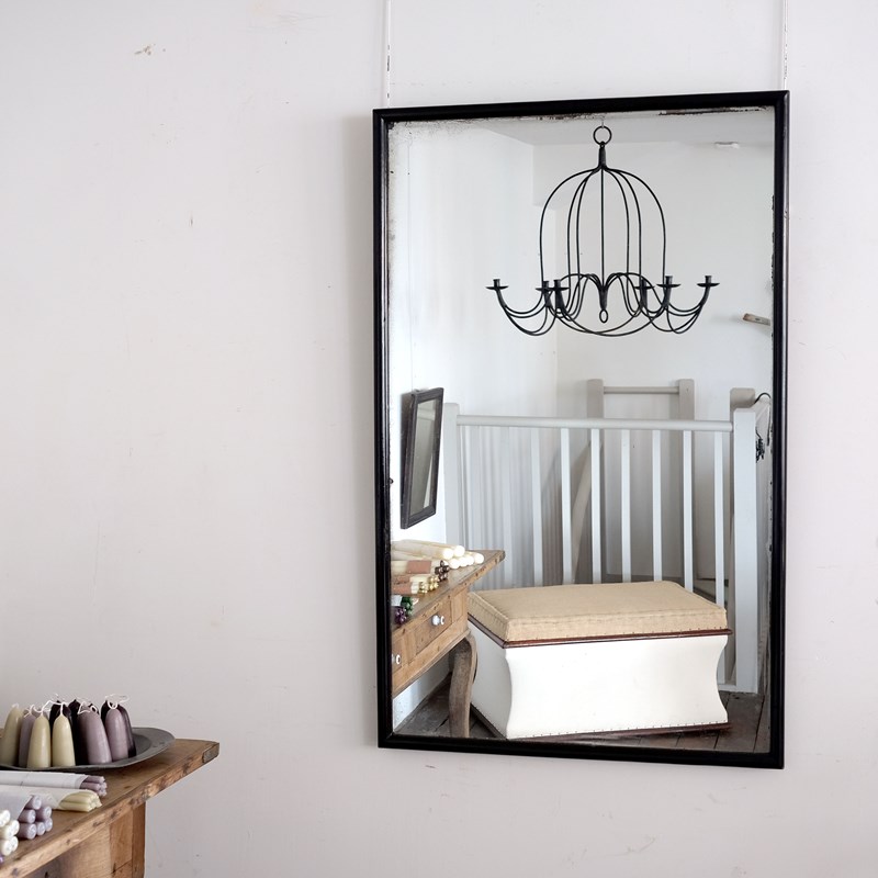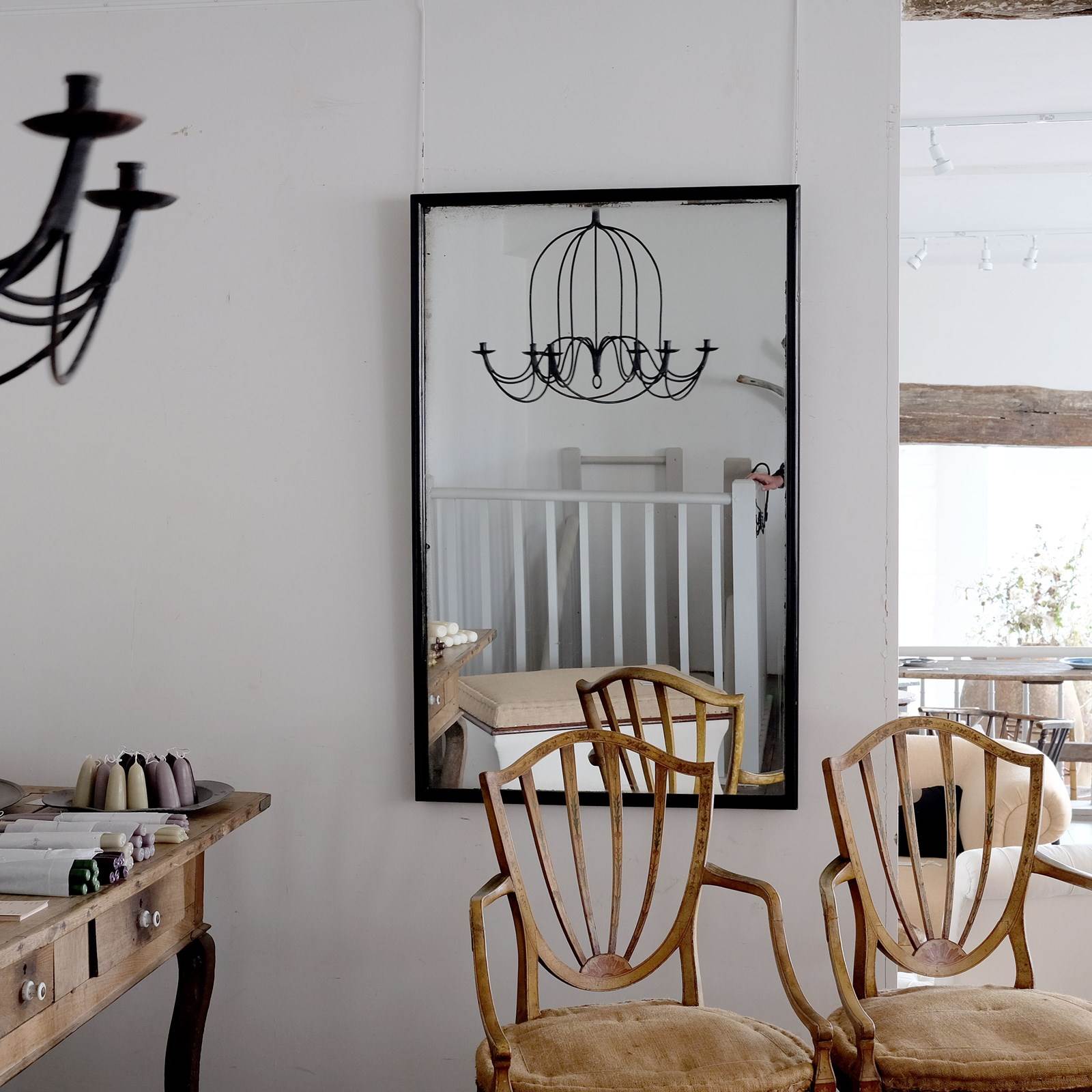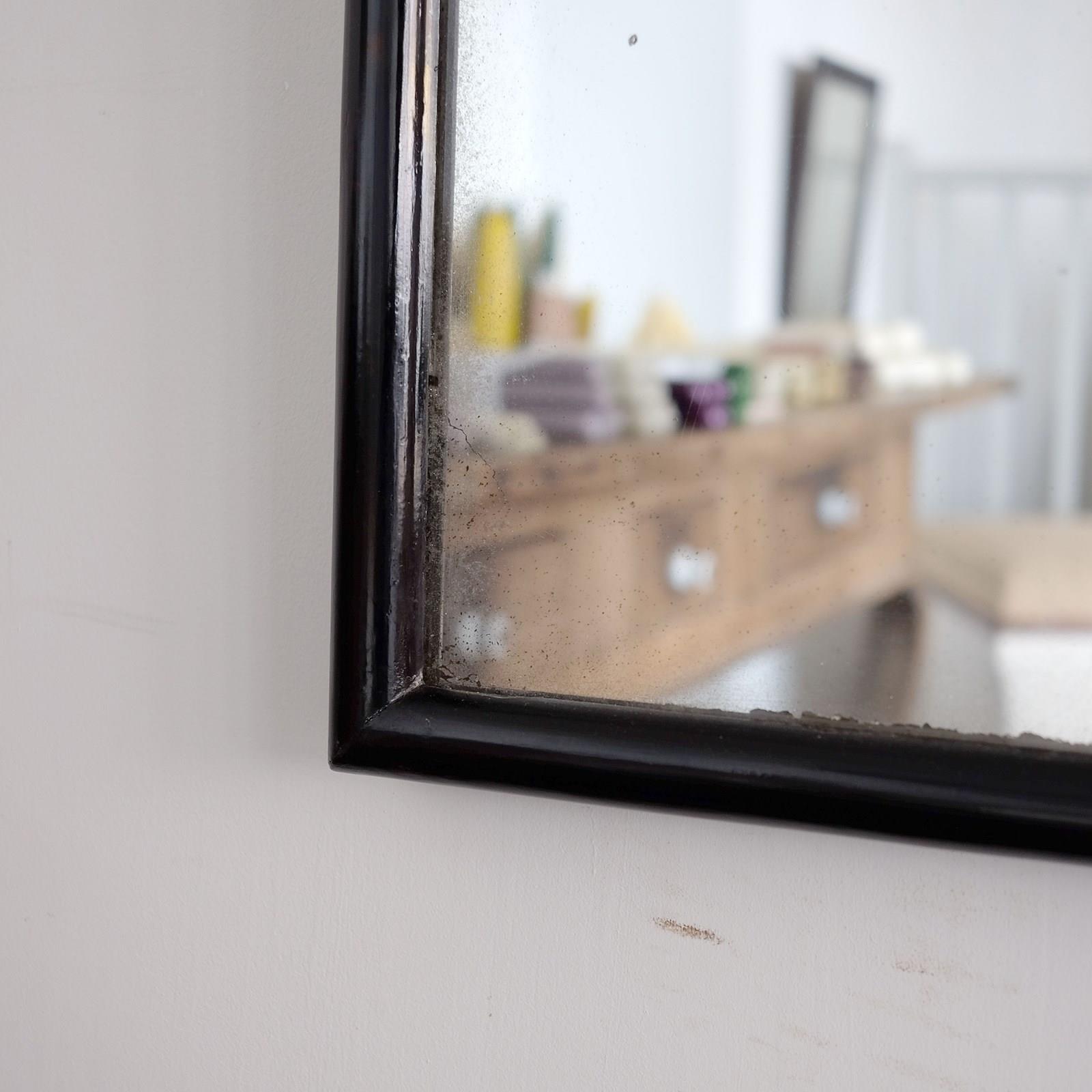 19th century English shop mirror, original sparkly mercury plate, original back, original ebonised finish on the elegant bull nose frame.