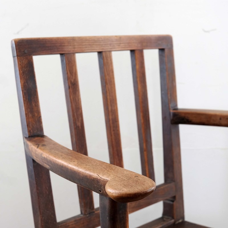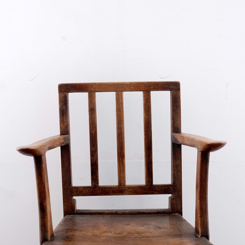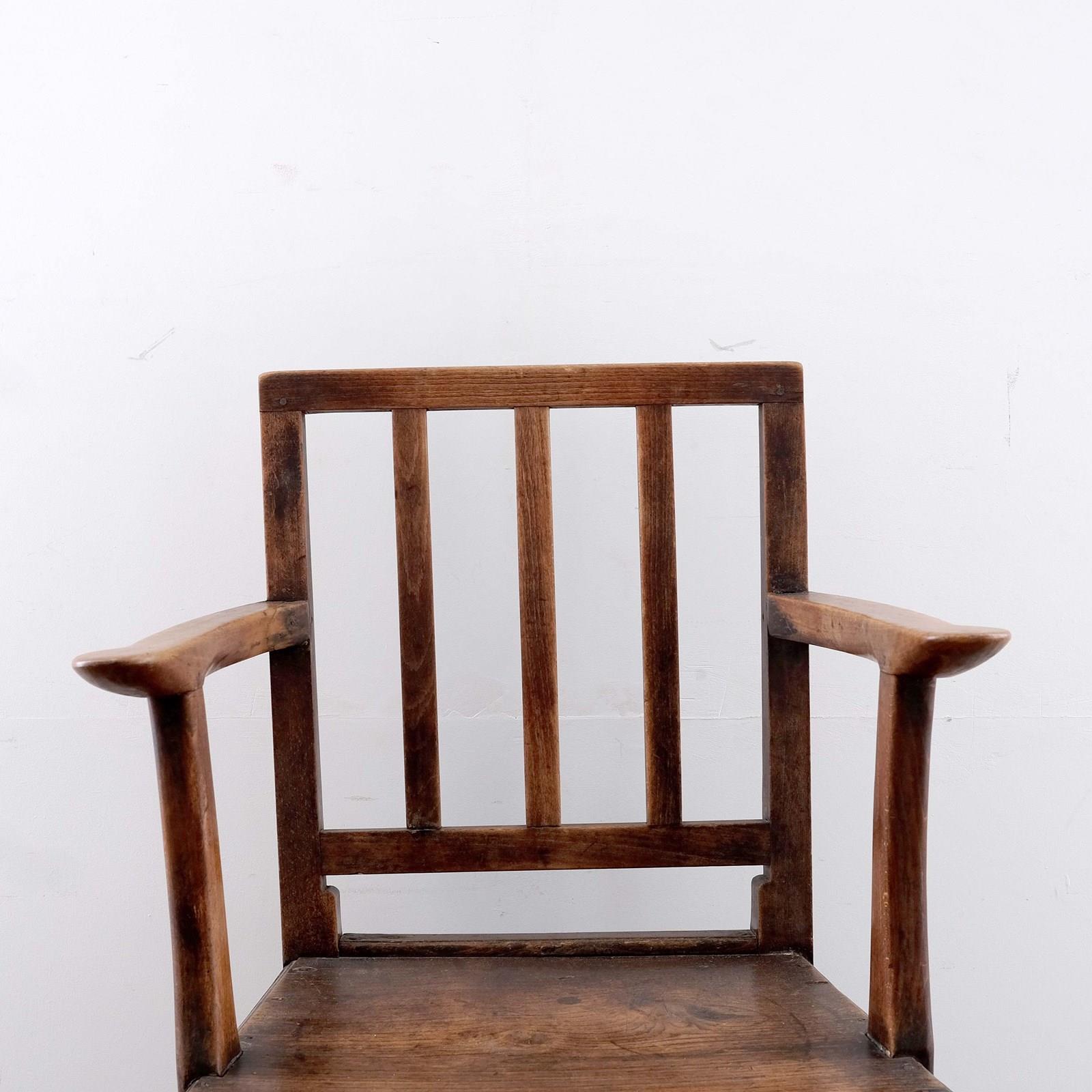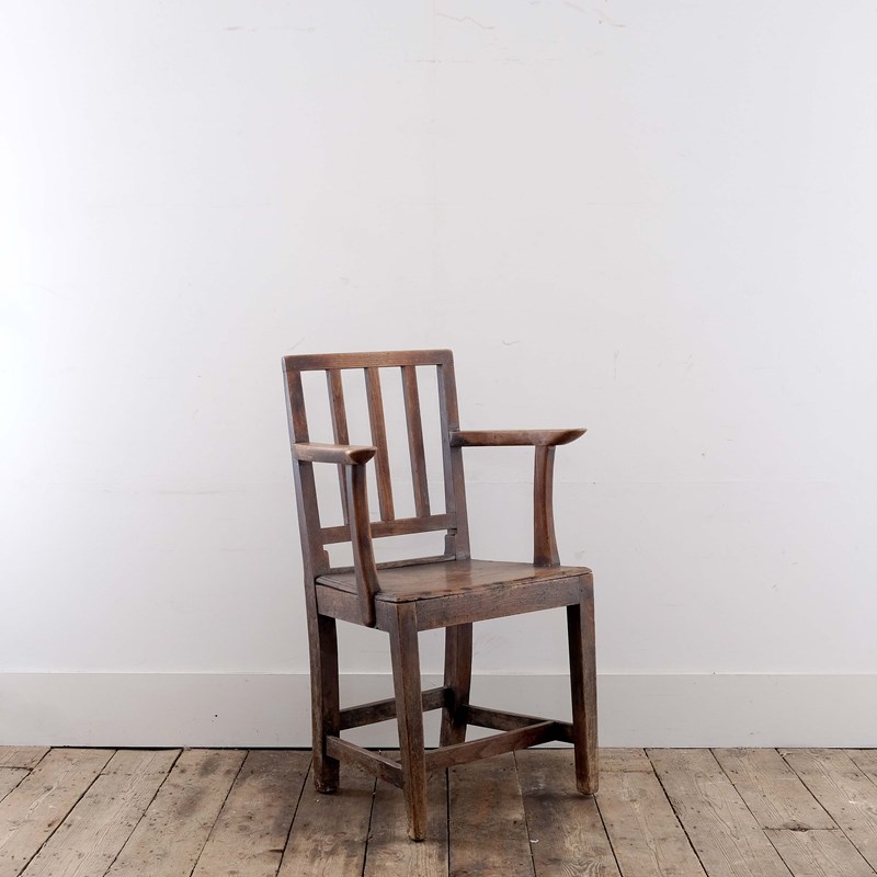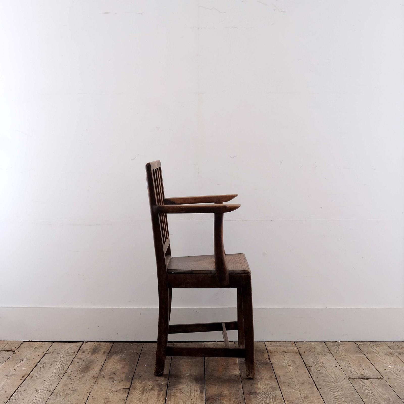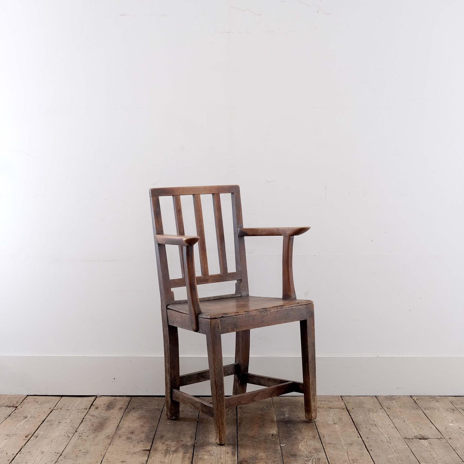 Early 19th century English country stick back armchair in elm. Wonderful simple form with unusually thin armrests. Lovely figuring and colour to the elm seat especially. Very nice signs of age and soft edges.