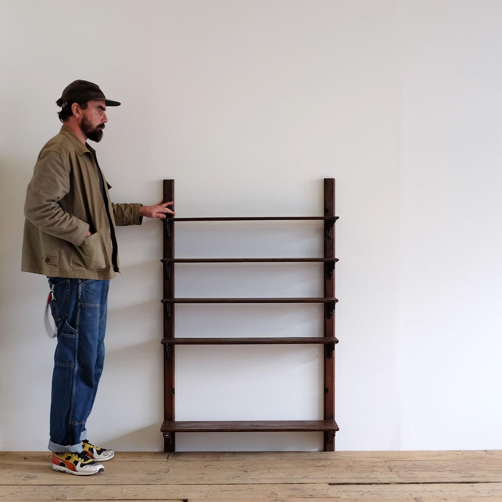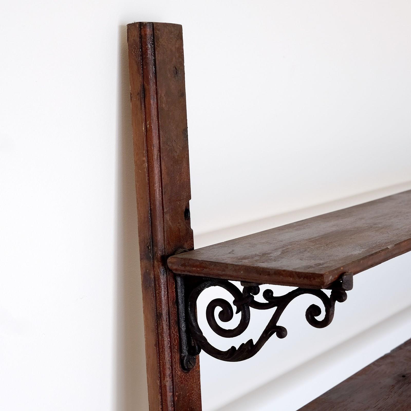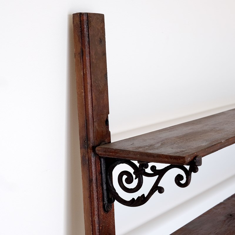 Late 19th century French bistro shelves in pine with remnants of the original patina. Lovely decorative wrought iron shelf supports. Simple, elegant, useful piece.
