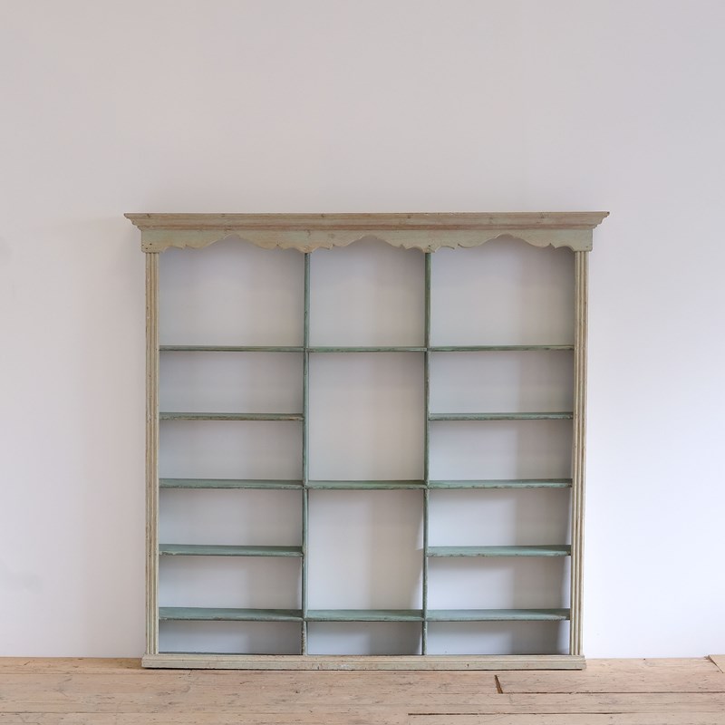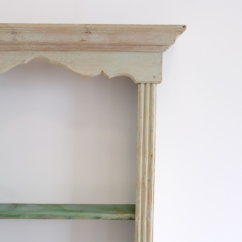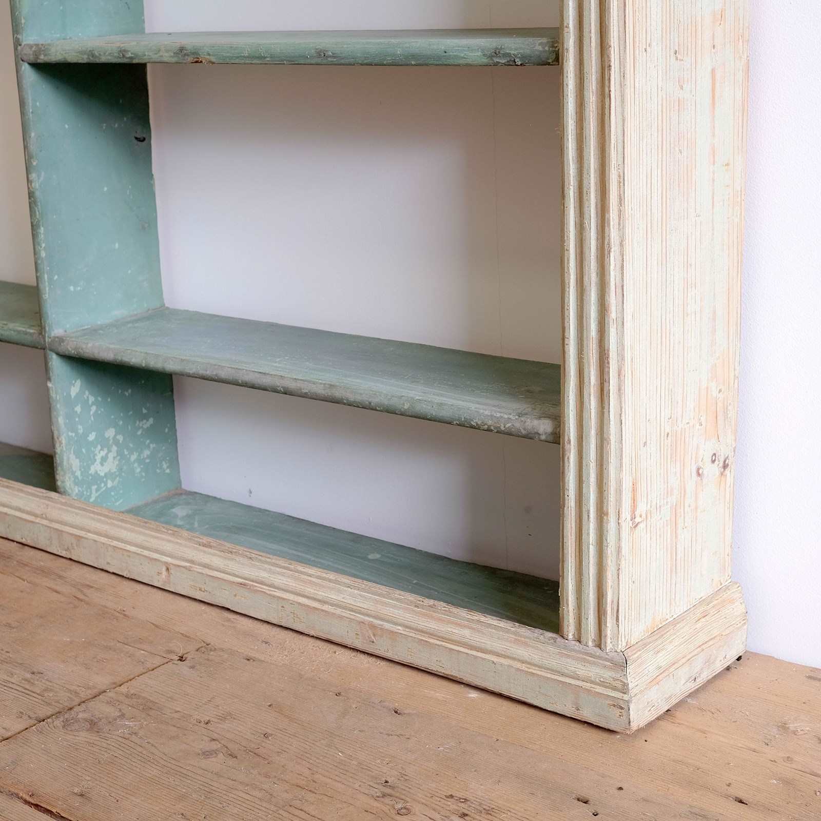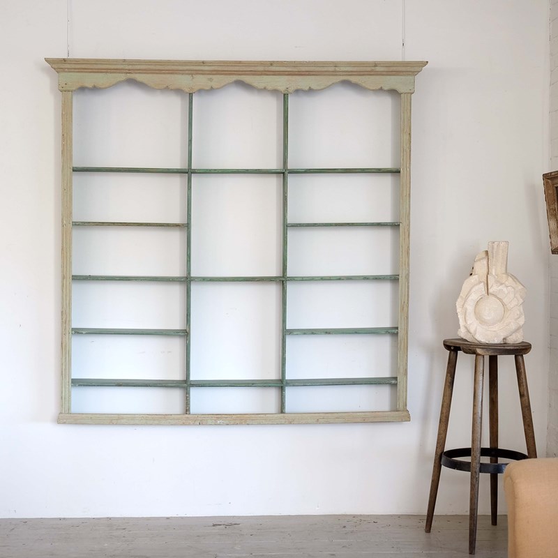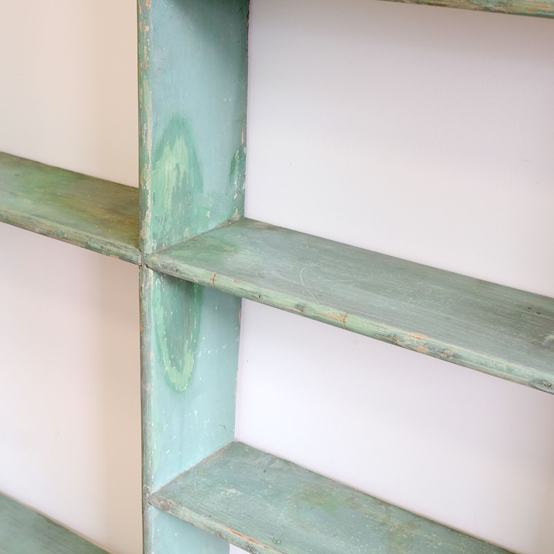 Late 19th century French bistro shelves constructed in pine with remnants of the lovely original green paint. Very elegant proportions being shallow and almost square. Nice design details such as the decorative cornice and reeded supports.