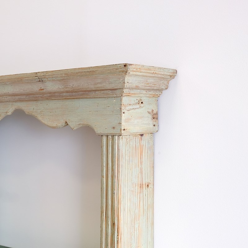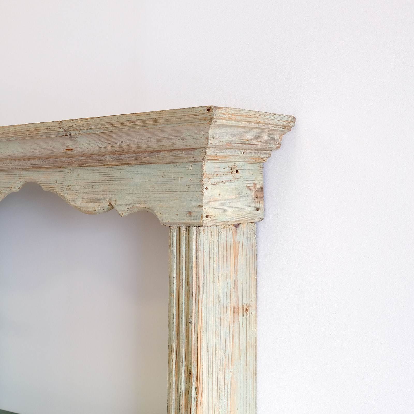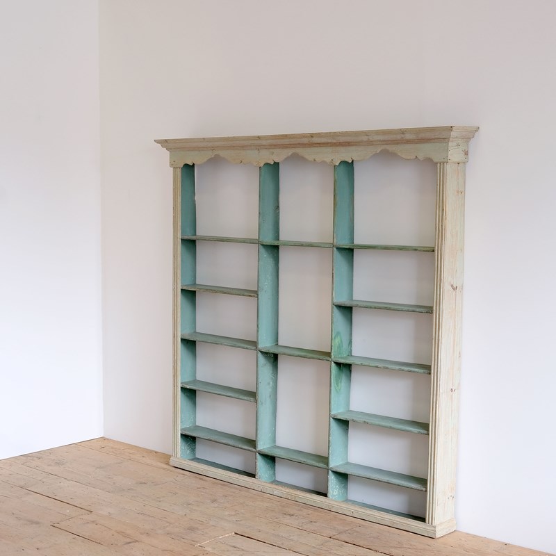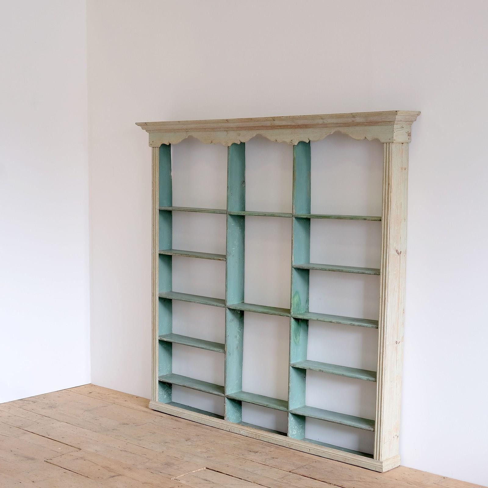 Late 19th century French bistro shelves constructed in pine with remnants of the lovely original green paint. Very elegant proportions being shallow and almost square. Nice design details such as the decorative cornice and reeded supports.
