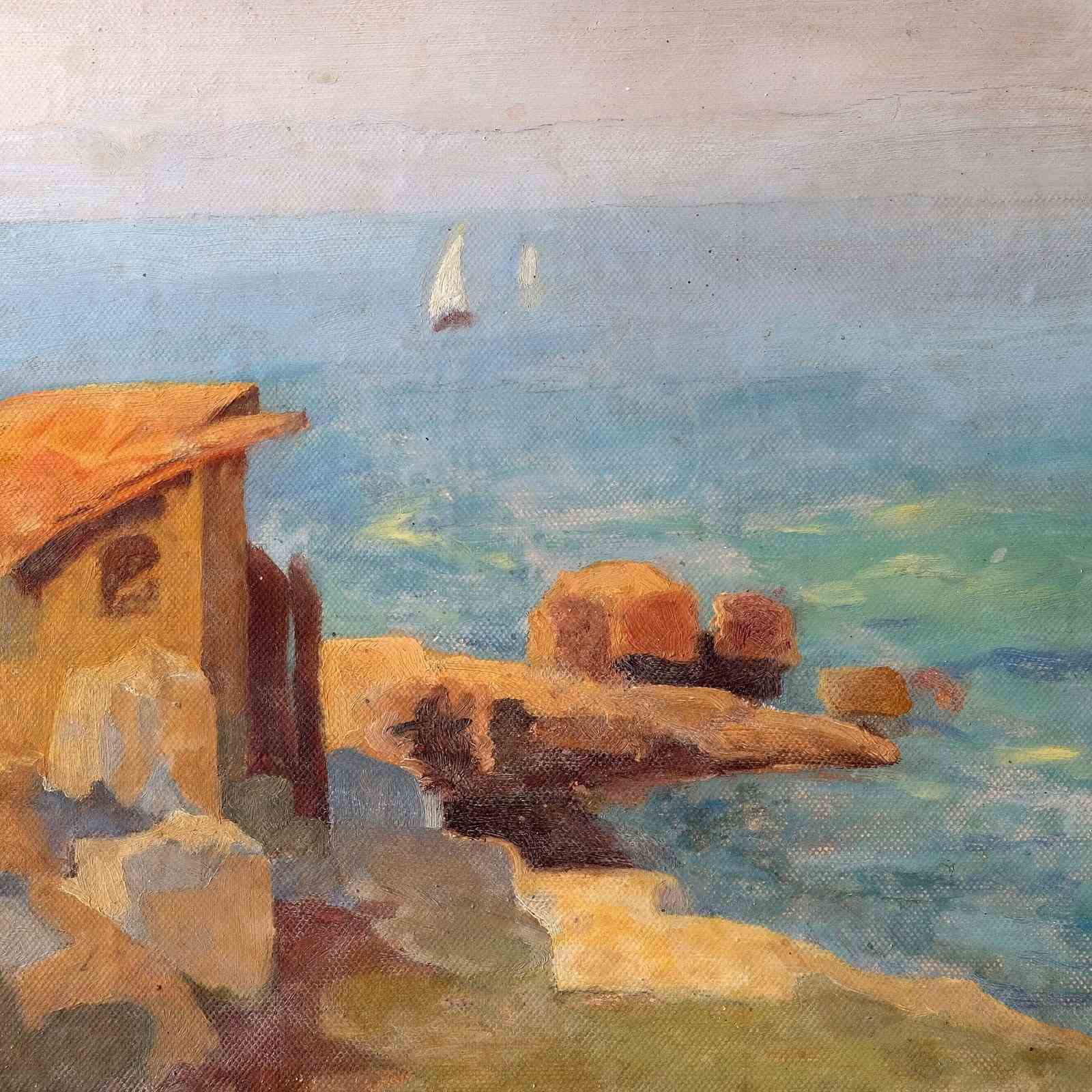 An early - mid 20th century oil on board depicting a coastal scene, southern France, signed J Richard framed in an antique gilded French frame. Lovely colour palette that is evocative of the light in that part of the World.