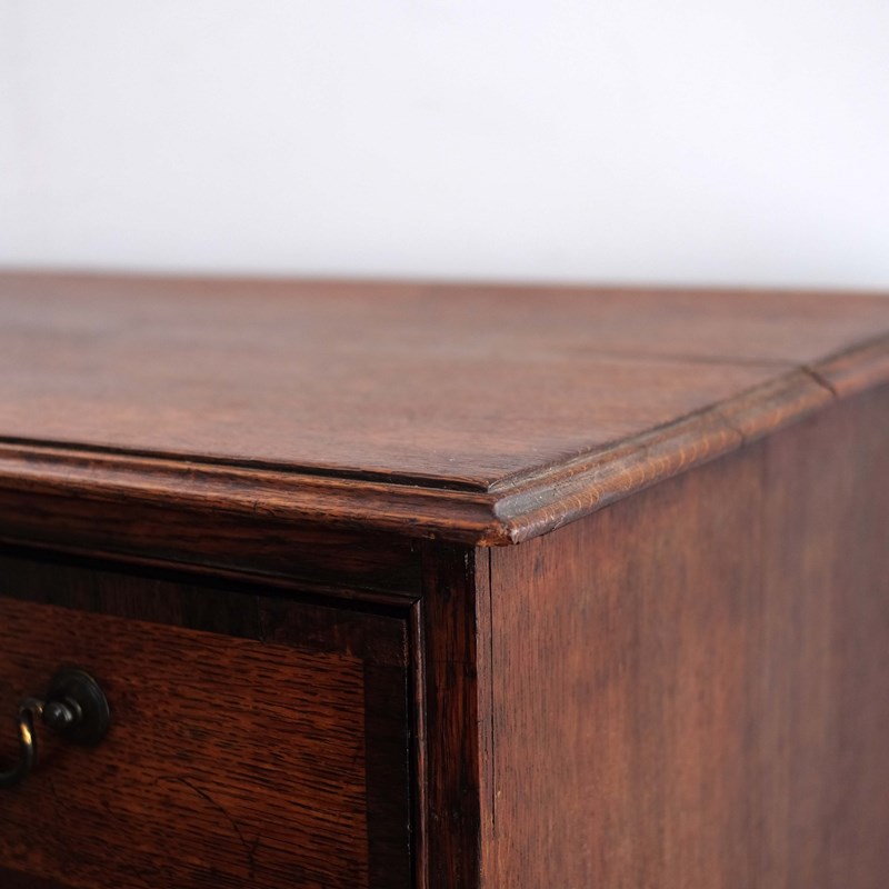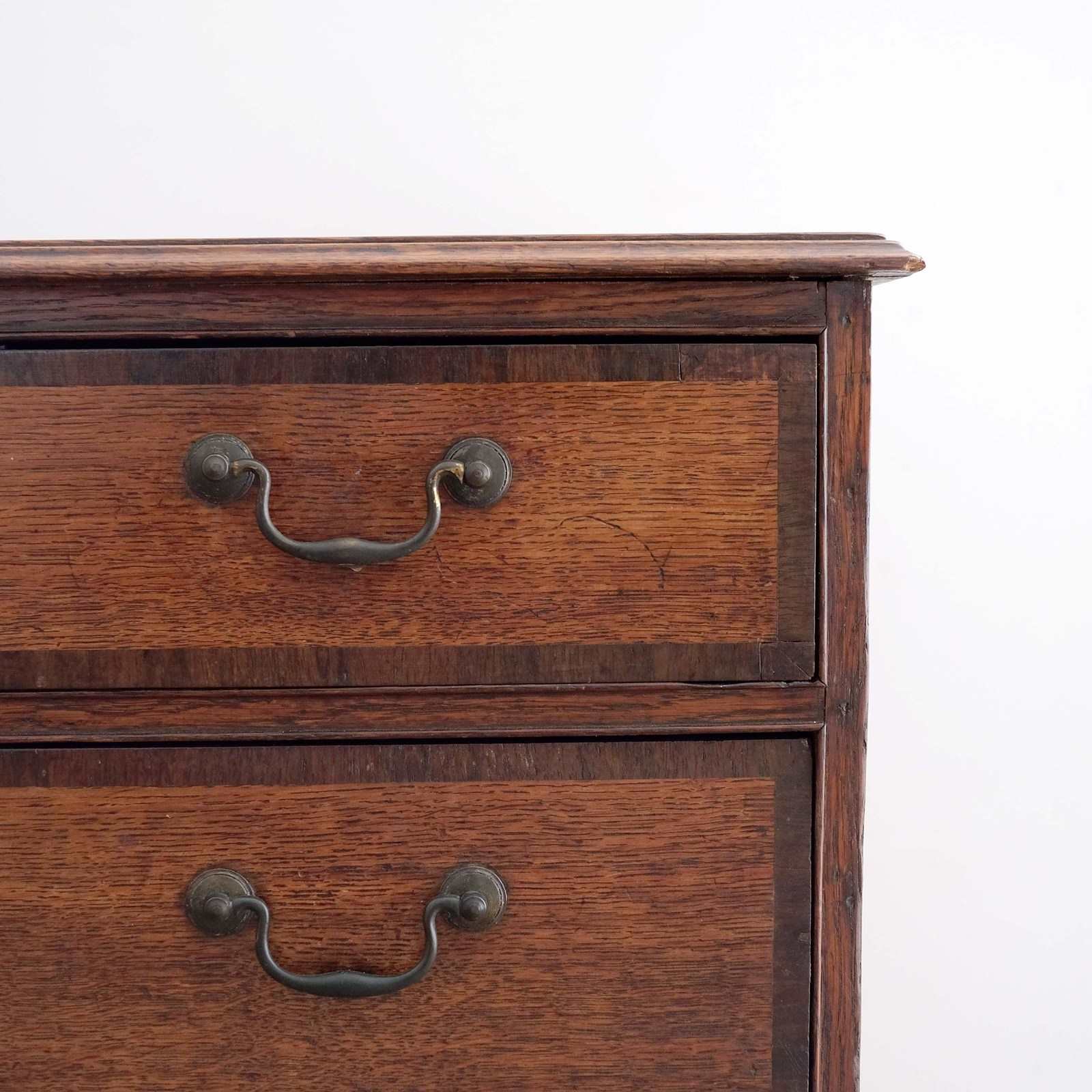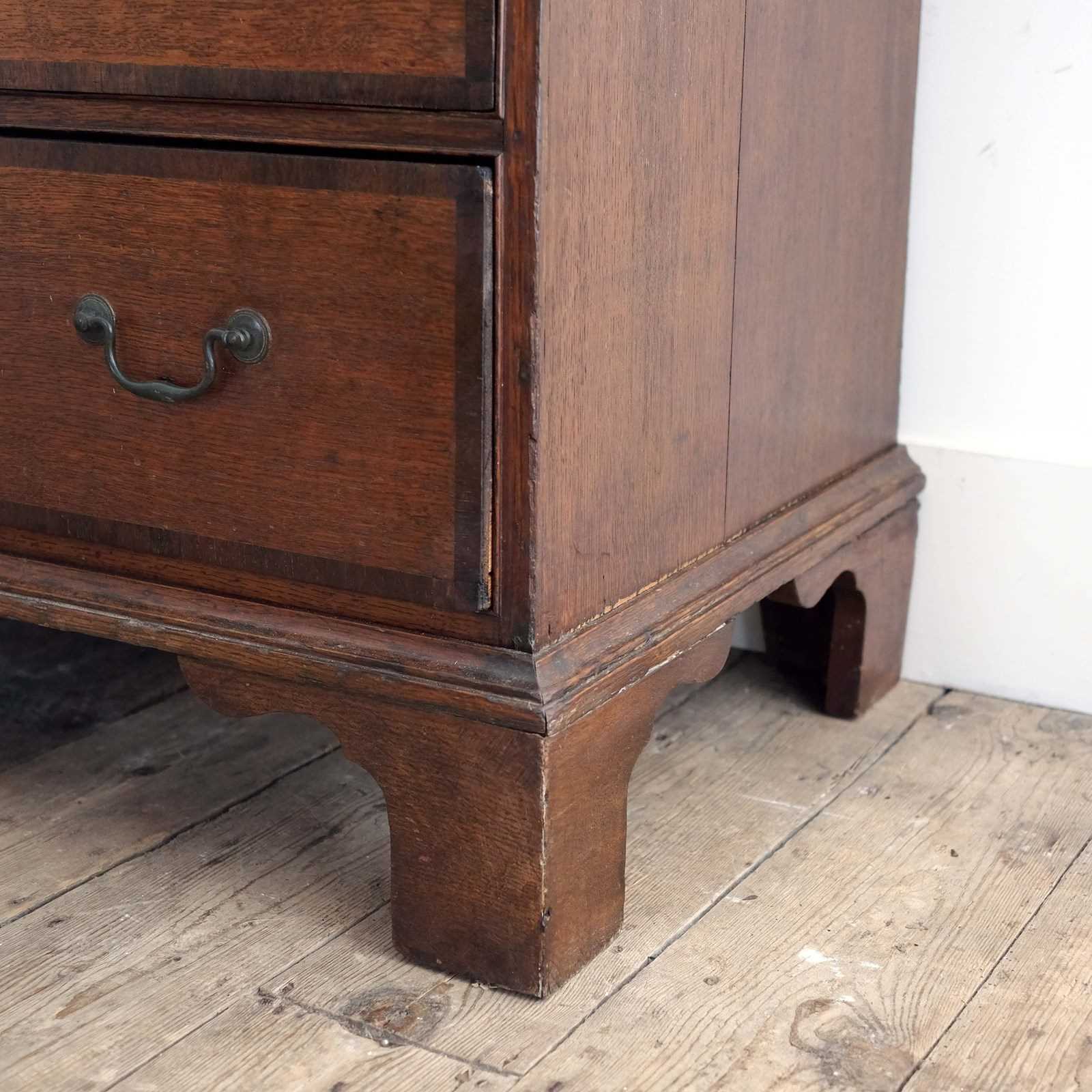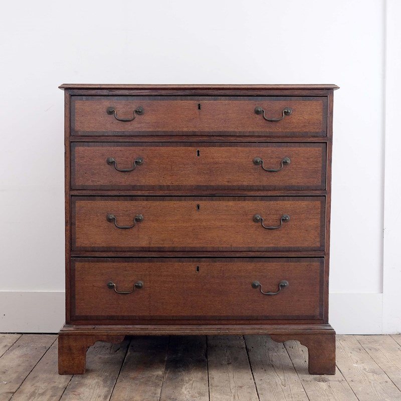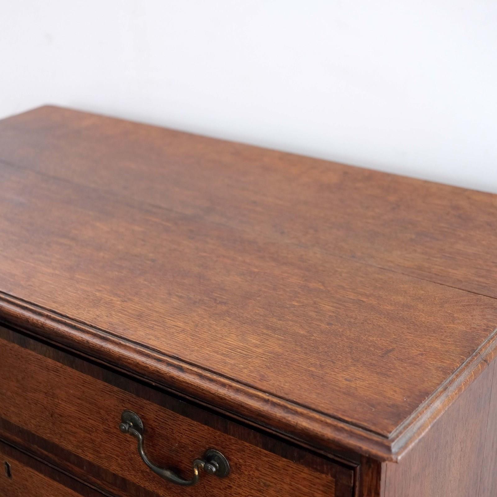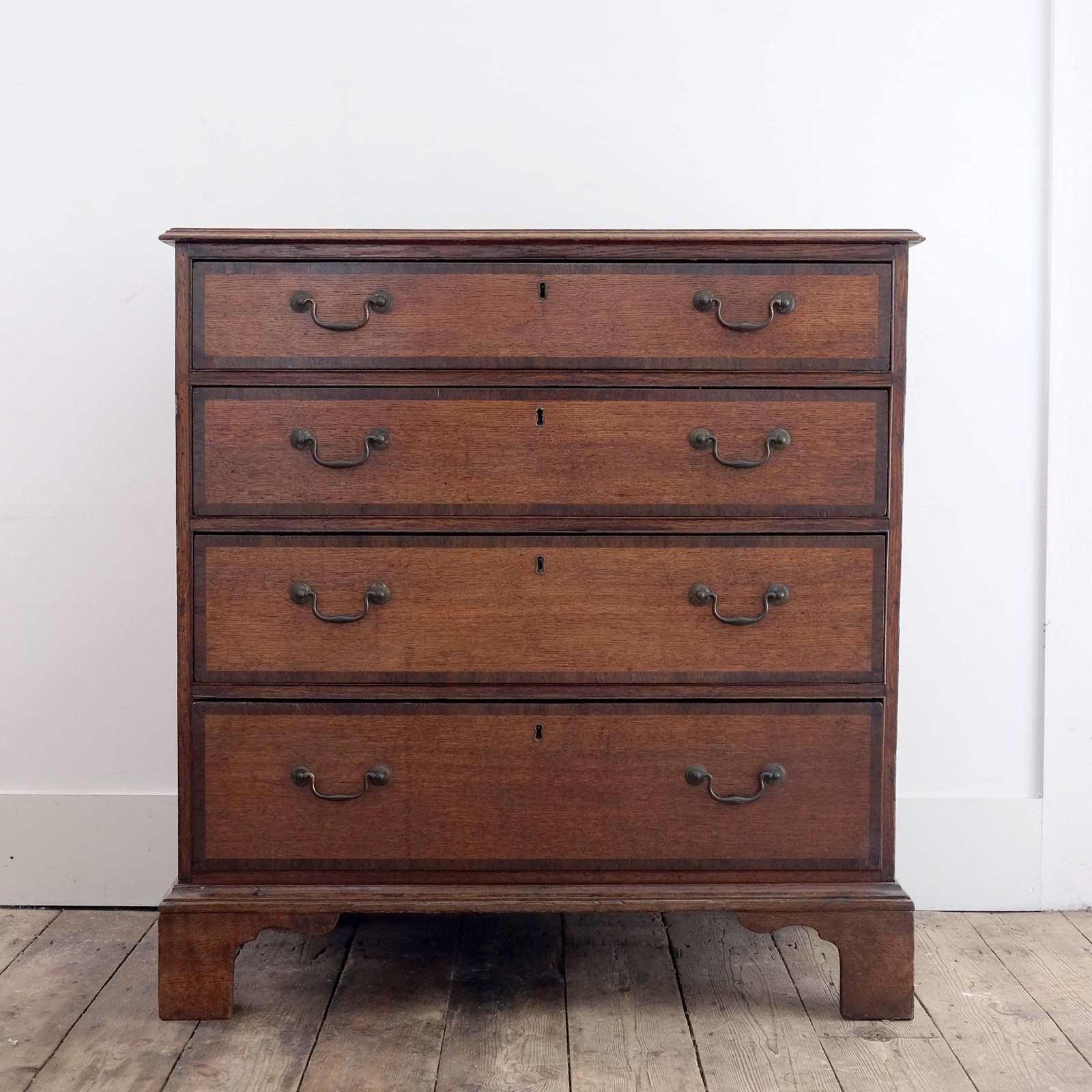 Lovely Georgian chest of drawers in oak, circa 1780. Neat proportions. Lovely honey colour. Bracket feet. Swan neck drawer pulls. Very smart darker inlays framing the drawers.