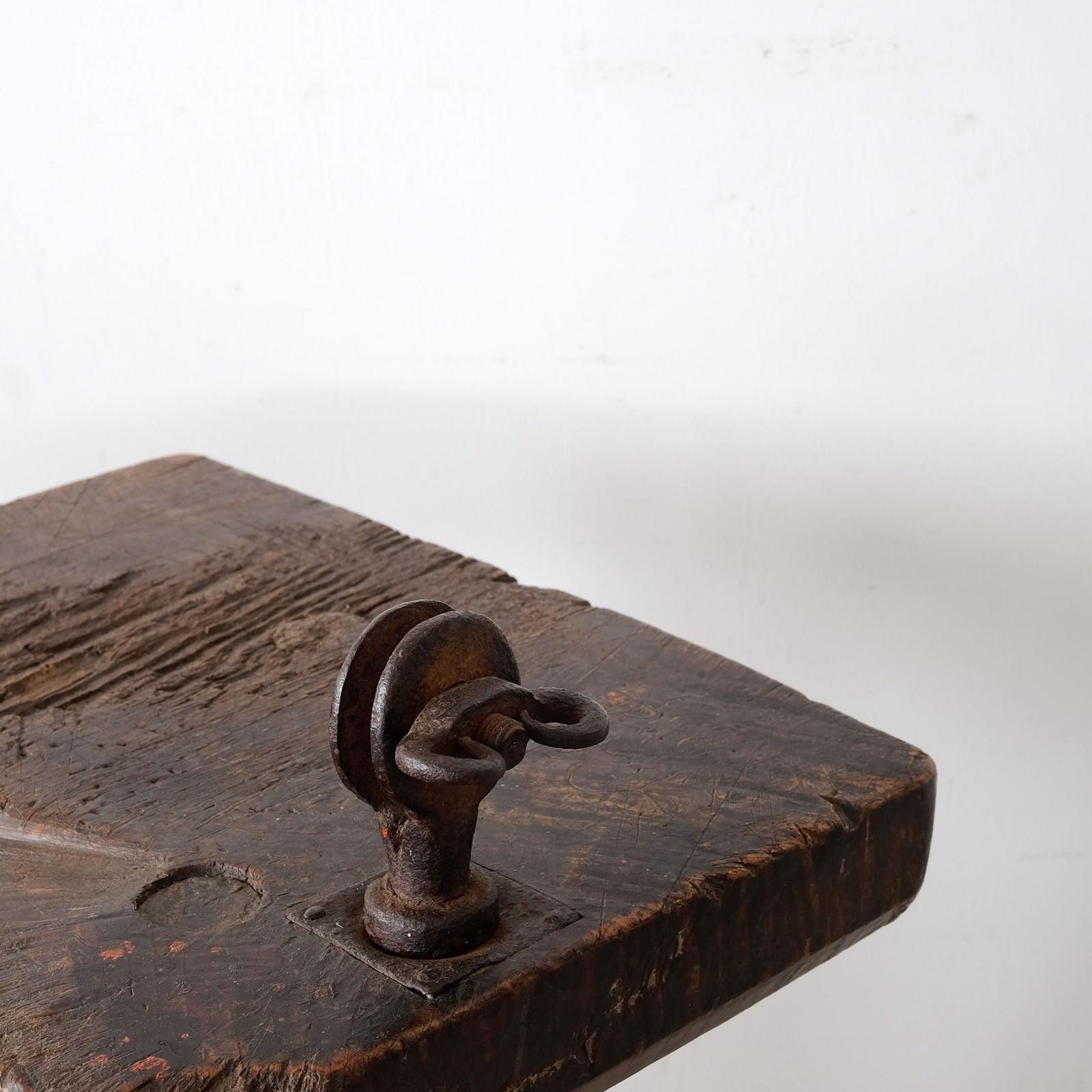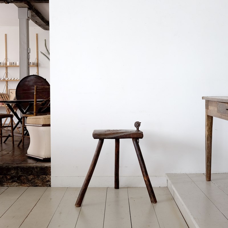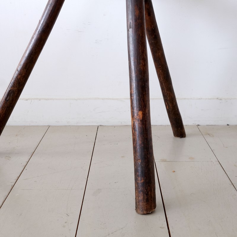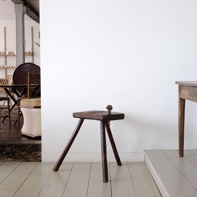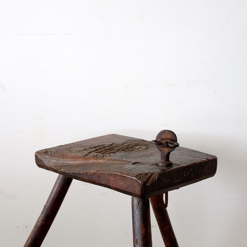 A rare and unique Georgian Folk Art stool, England, circa 1780. A single slab elm seat with the original blacksmith made spool on peg legs. Similar in design to a cutler's stool but we feel this piece was fashioned for the unique purpose of cutting wire or thread from the spool. Wonderful Folk Art Piece.