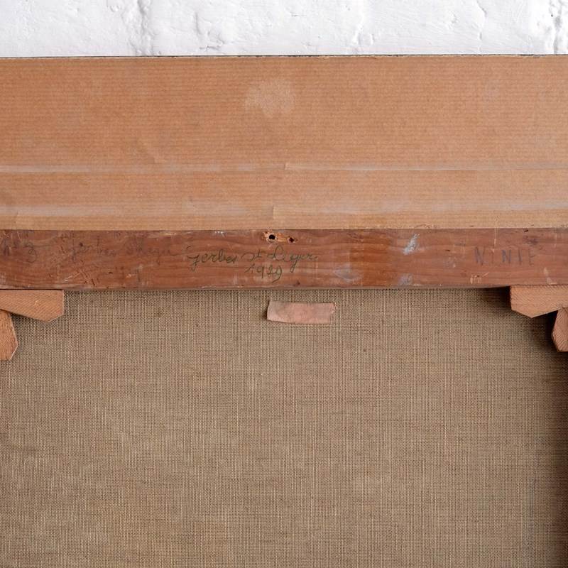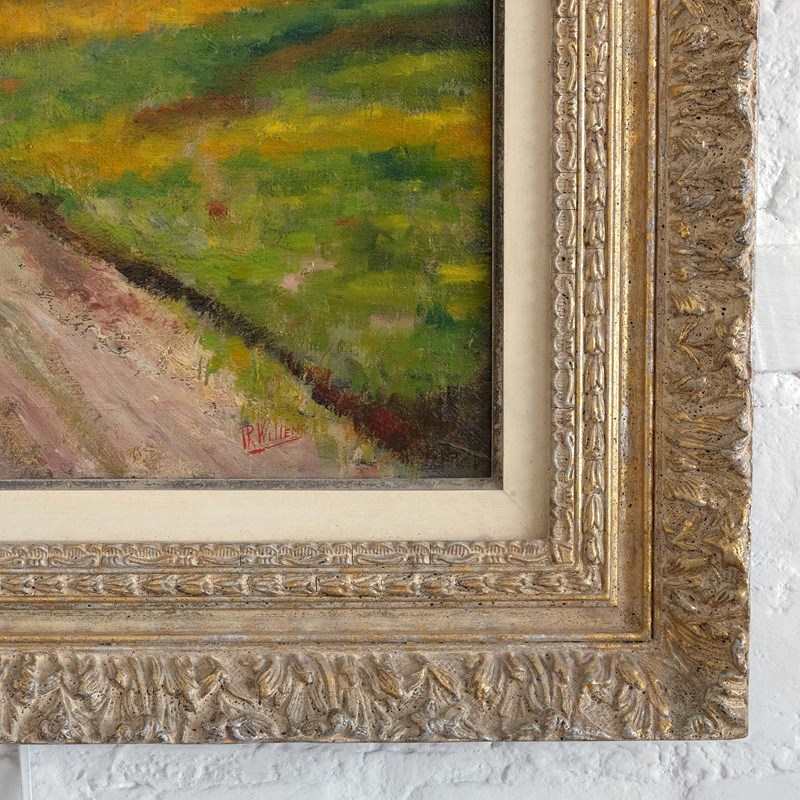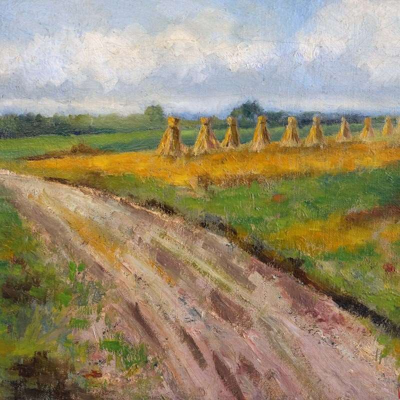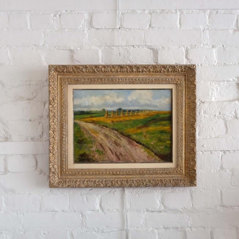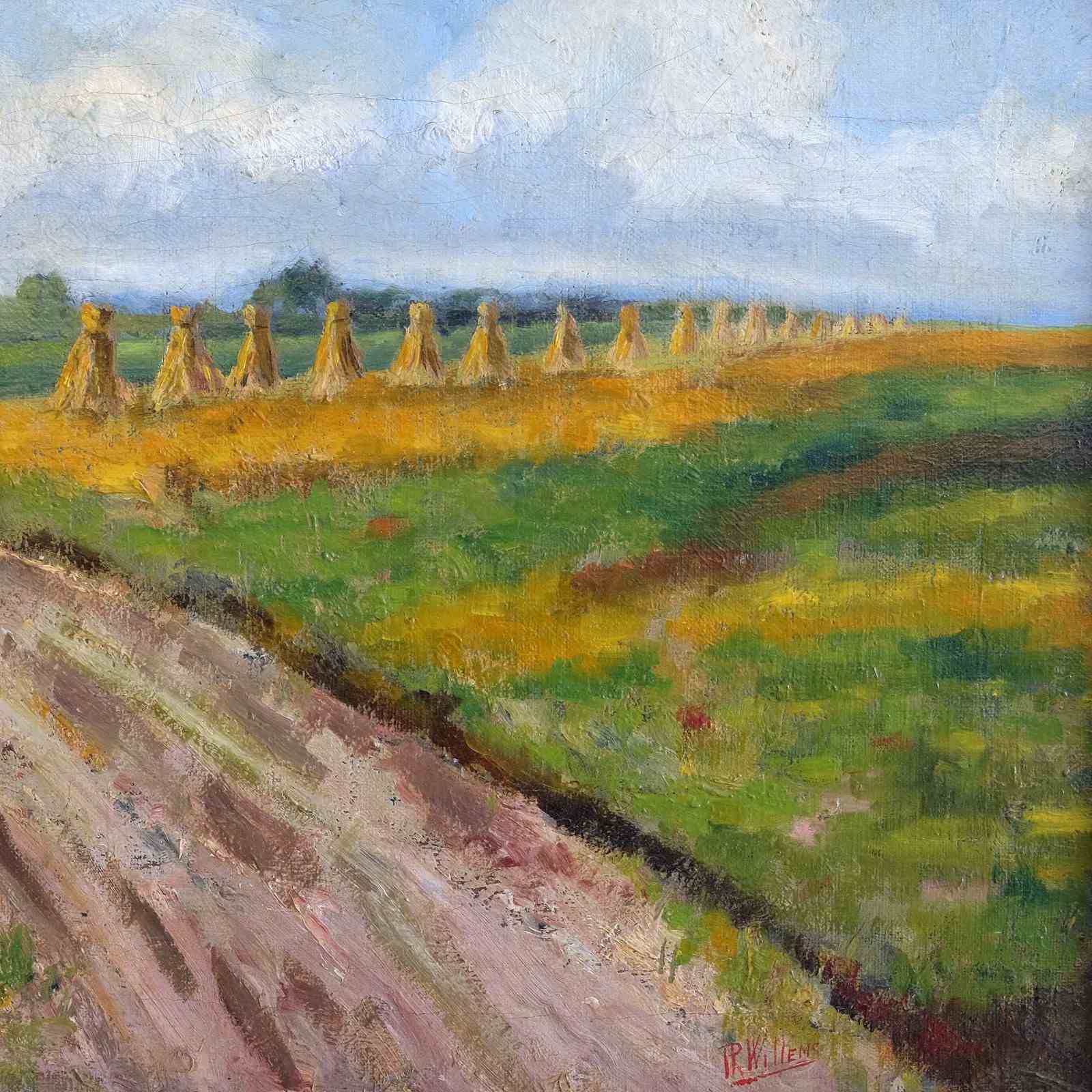 An early 20th century landscape depicting a row of wheat sheaves in green fields under a cloudy sky. Saint-Léger, Belgium. Oil on canvas in a montparnasse frame of the same period. Signed 'Willems' and scribed verso 'Gerbes St Legér 1929'.