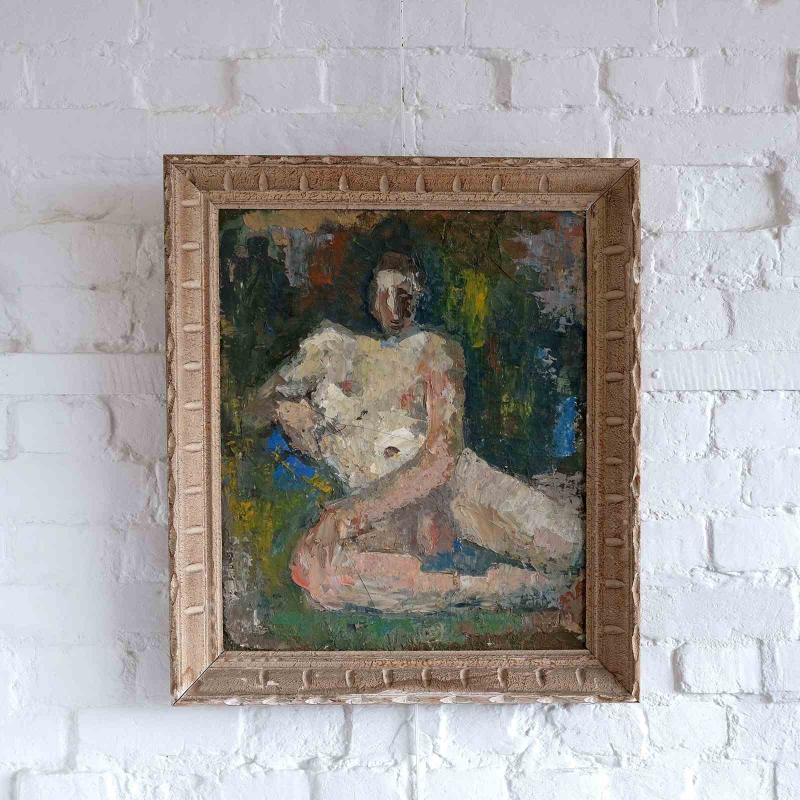 Mid 20th century British school nude study, oil on board, in a vintage French frame. Scribed verso Robert Harris. Executed in the impasto style with a vibrant palette.