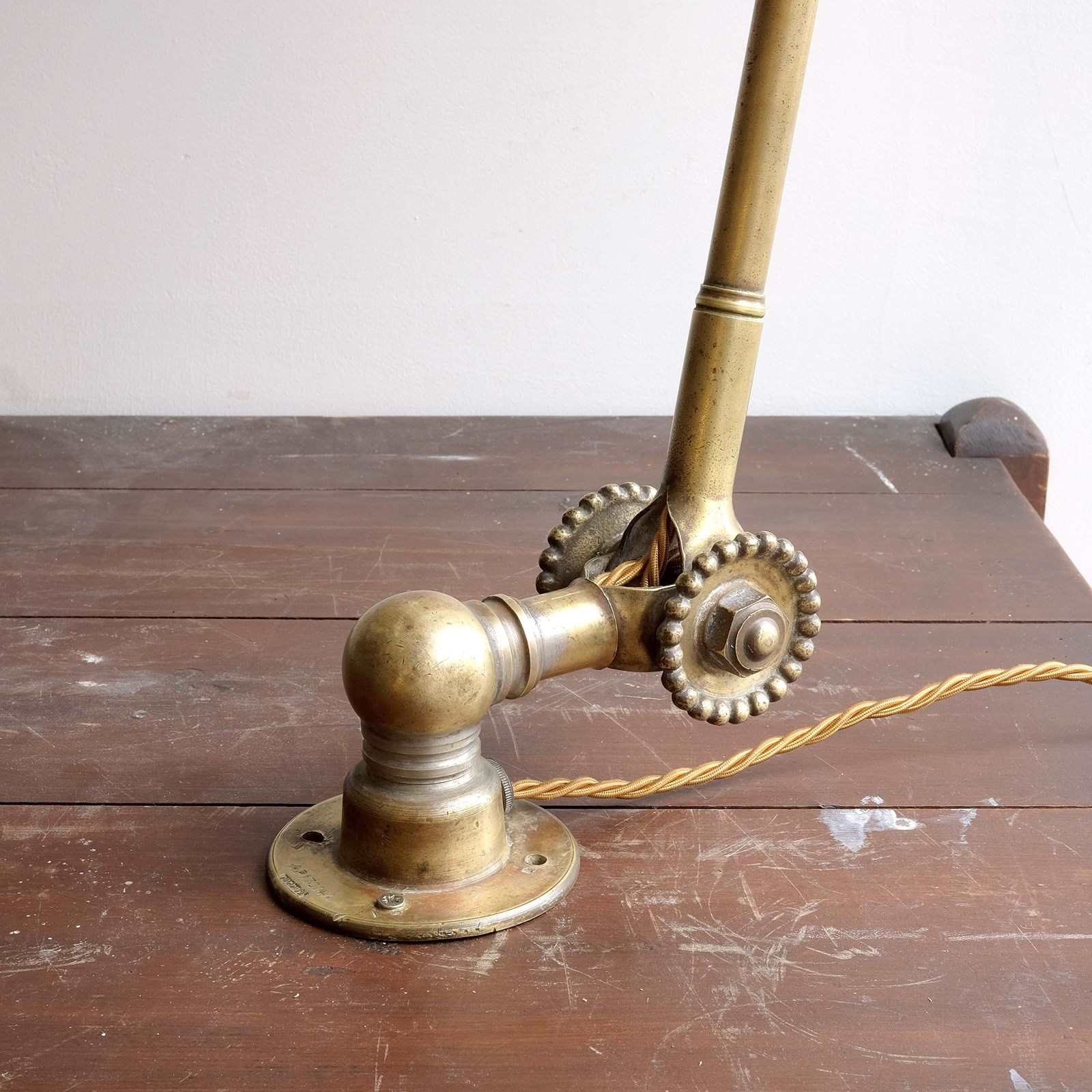 A very good quality articulated task light by John Dugdill & Co, circa 1930, originally manufactured for illuminating work benches and machines. This model is particularly good quality, made in brass, including the original brass shade and daisy cog hinges. Can be wall or table mounted. Re-wired and PAT tested.