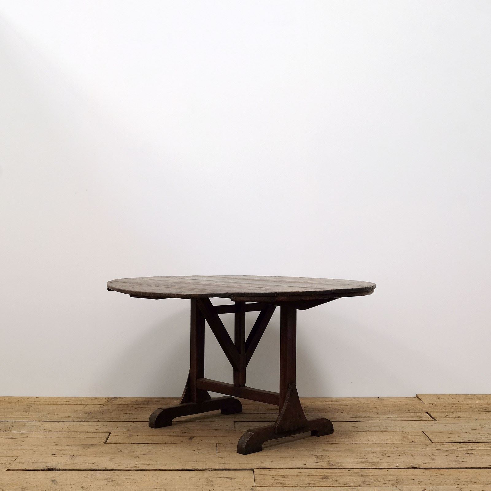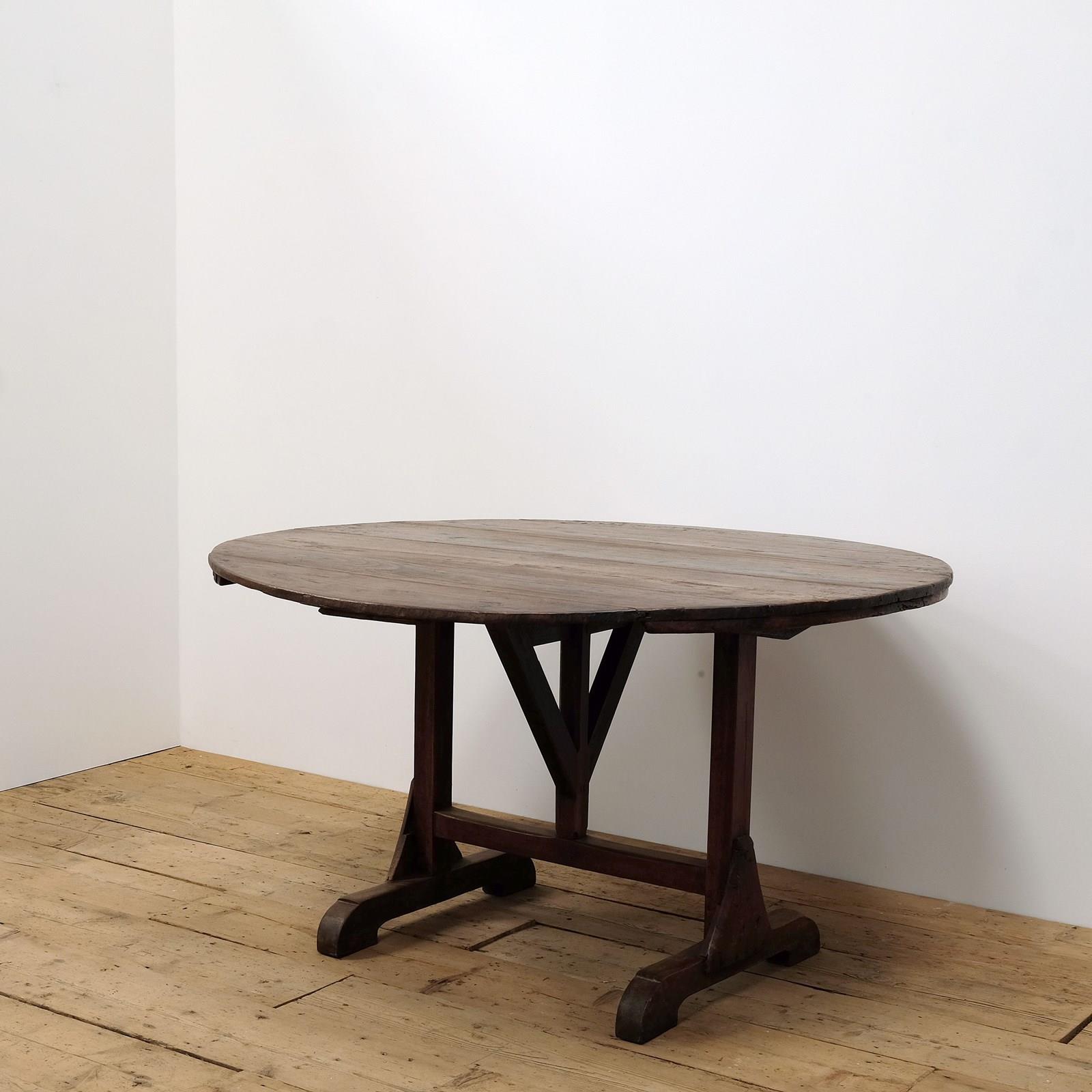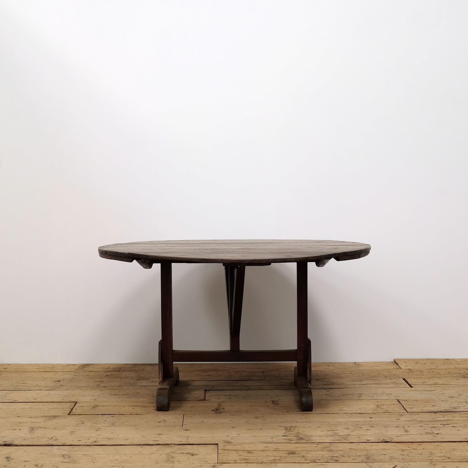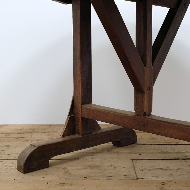 An usually large and substantial French antique vendange table. Constructed in various timbers. 19th century. Lovely dark rich patina. Originally used in vineyards and brought out for wine tasting. Folding mechanism for easy storage. Would comfortably seat 8 people. This piece has been through our workshop so structurally sound.