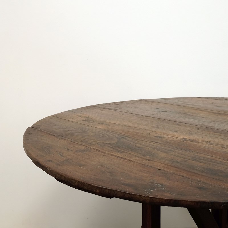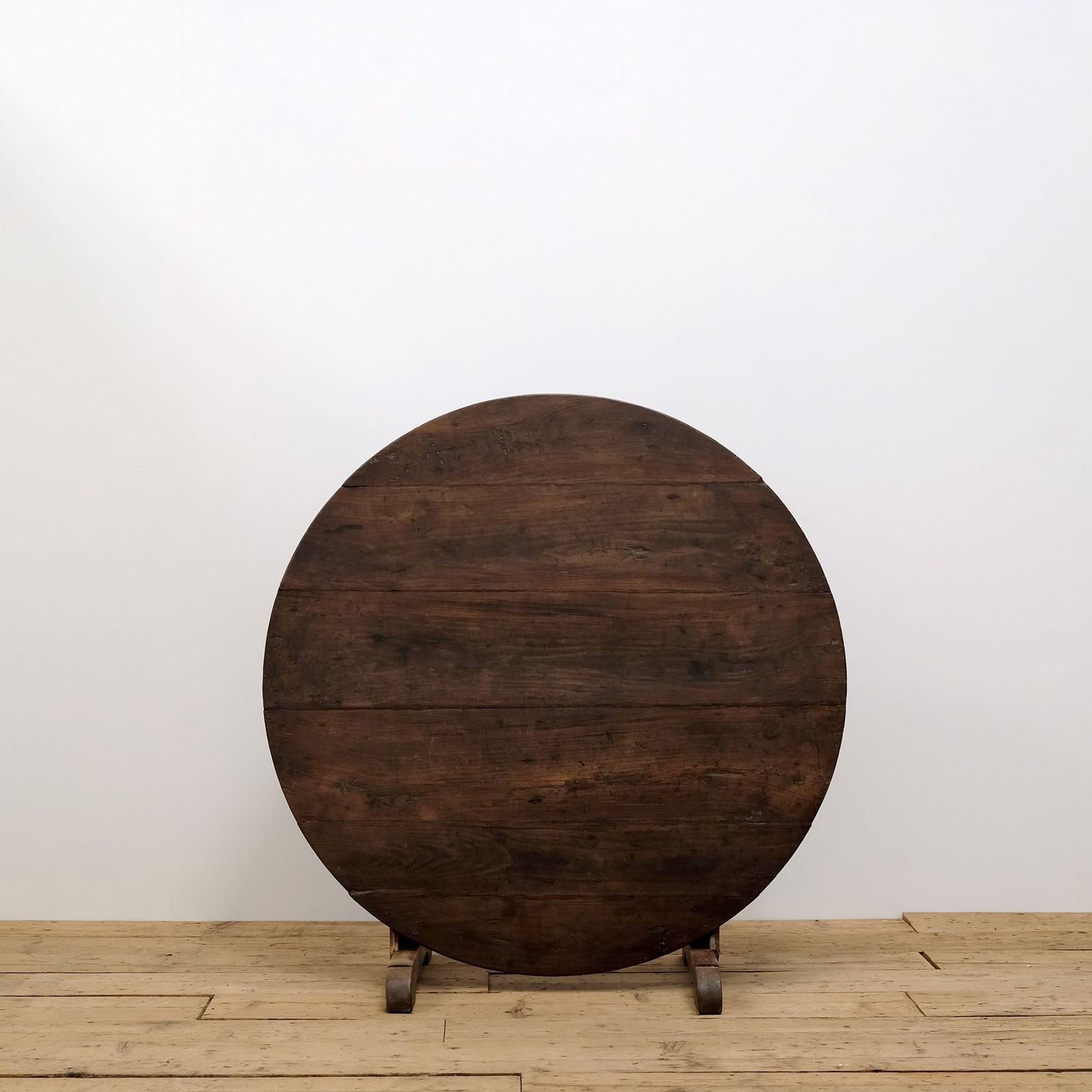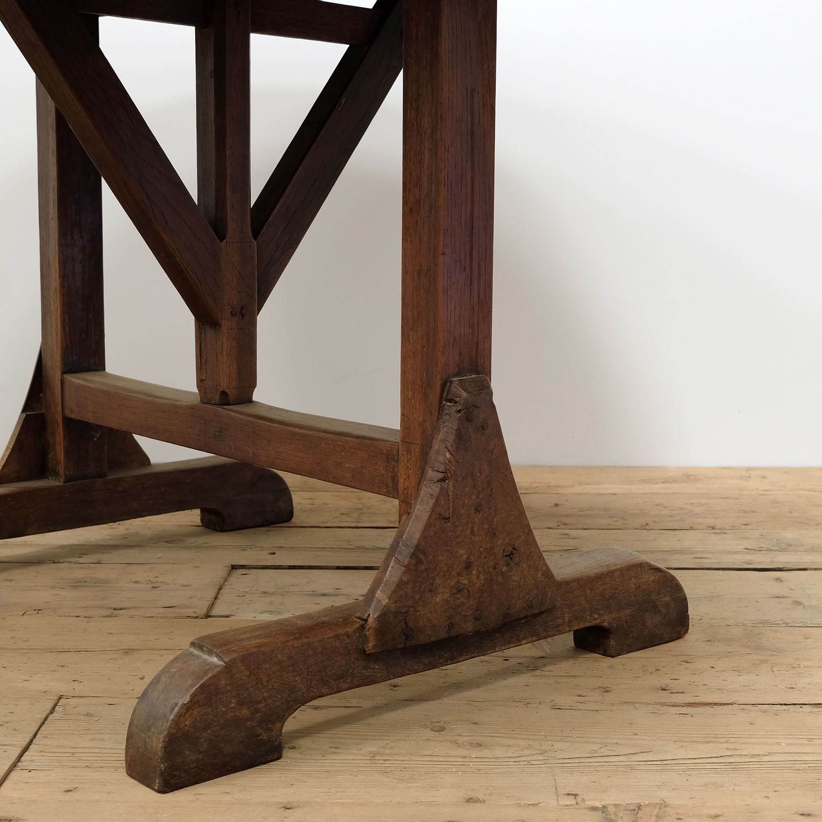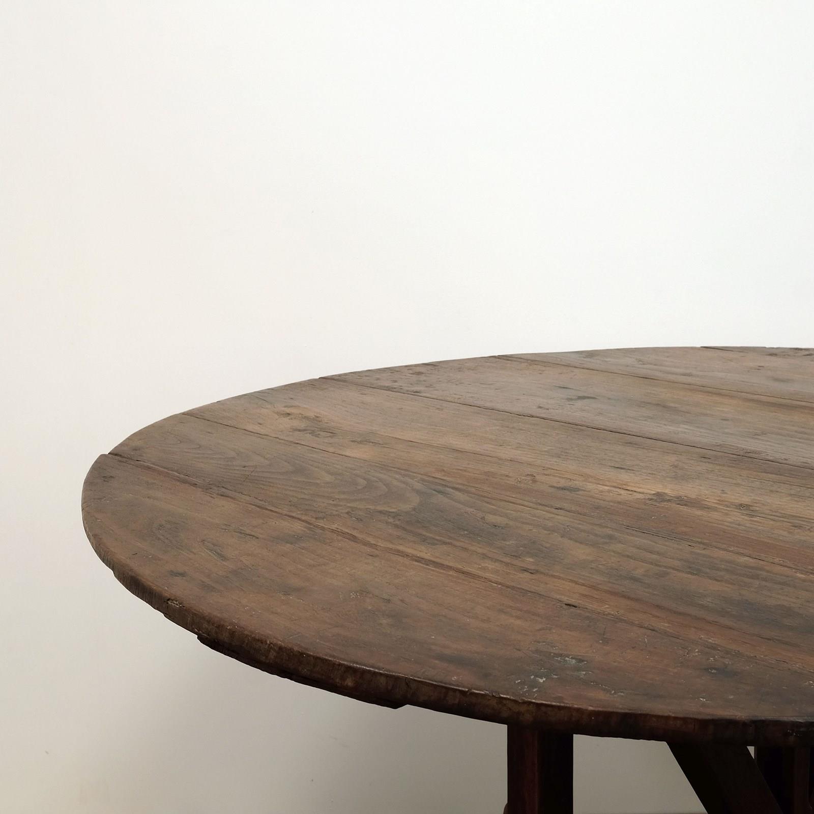 An usually large and substantial French antique vendange table. Constructed in various timbers. 19th century. Lovely dark rich patina. Originally used in vineyards and brought out for wine tasting. Folding mechanism for easy storage. Would comfortably seat 8 people. This piece has been through our workshop so structurally sound.