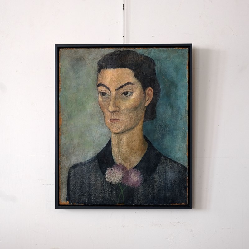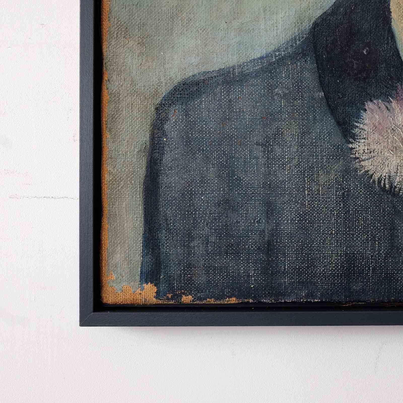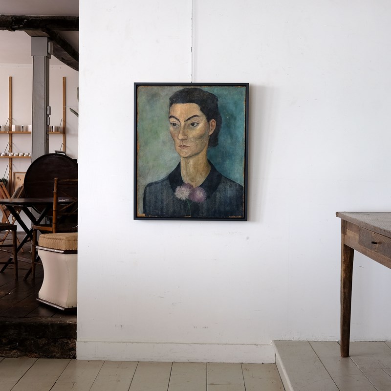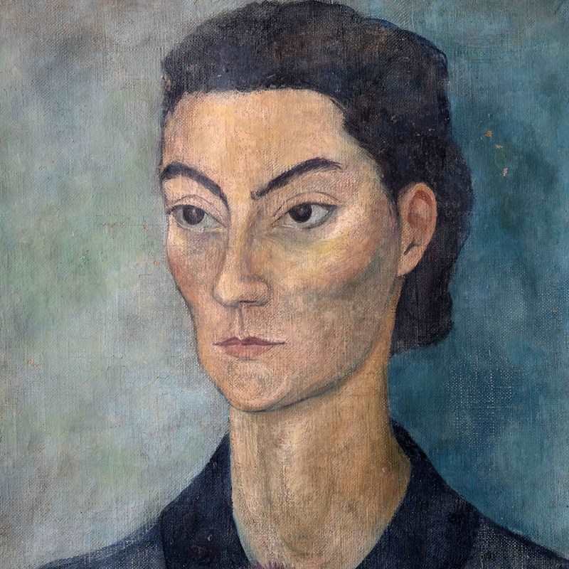 A very striking early 20th century French portrait, oil on canvas, framed in a contemporary dark blue tray frame. Executed beautifully in the modernist style. Minor paint loss around the edge of the canvas and it appears there has been some minor restoration, but this does not detract from the piece.