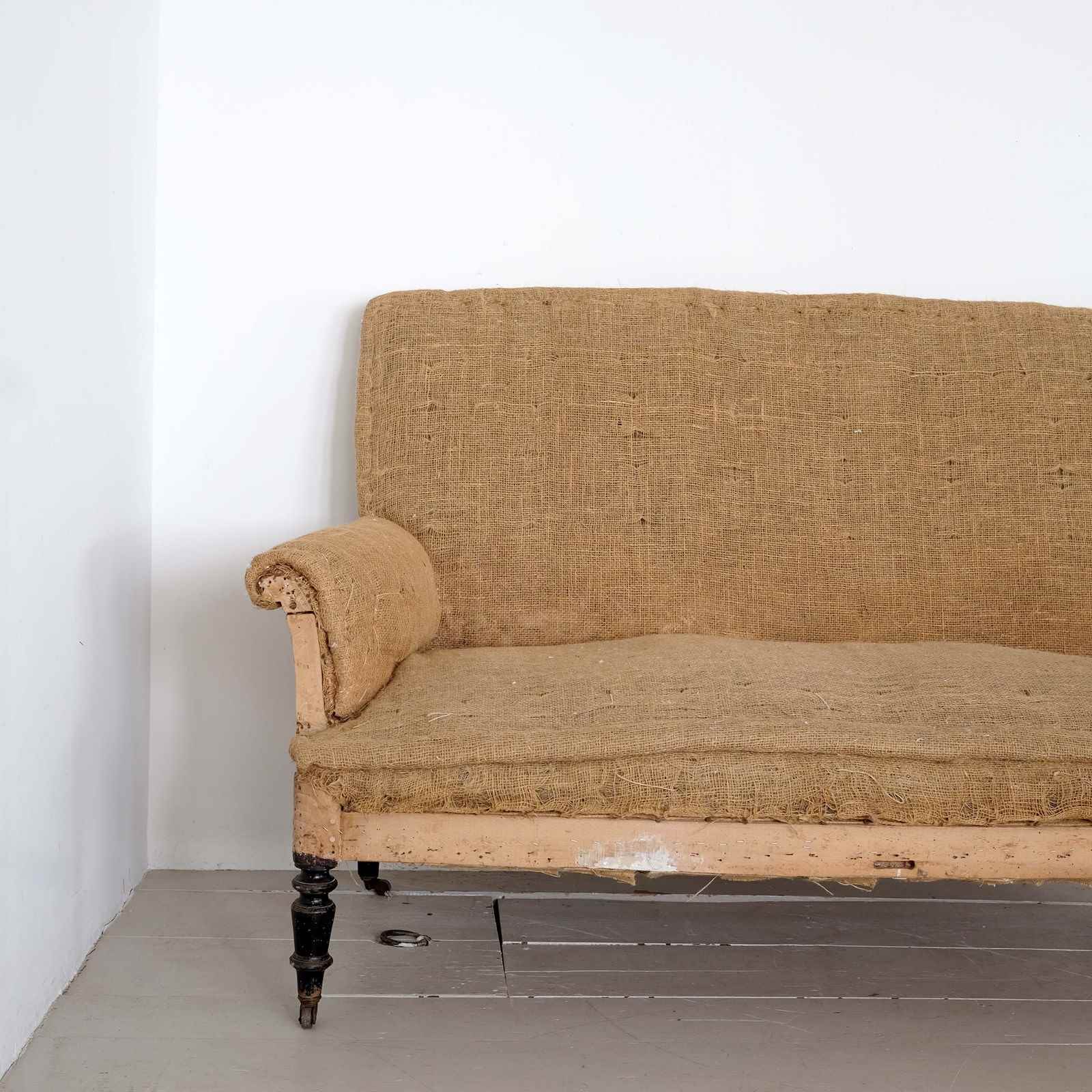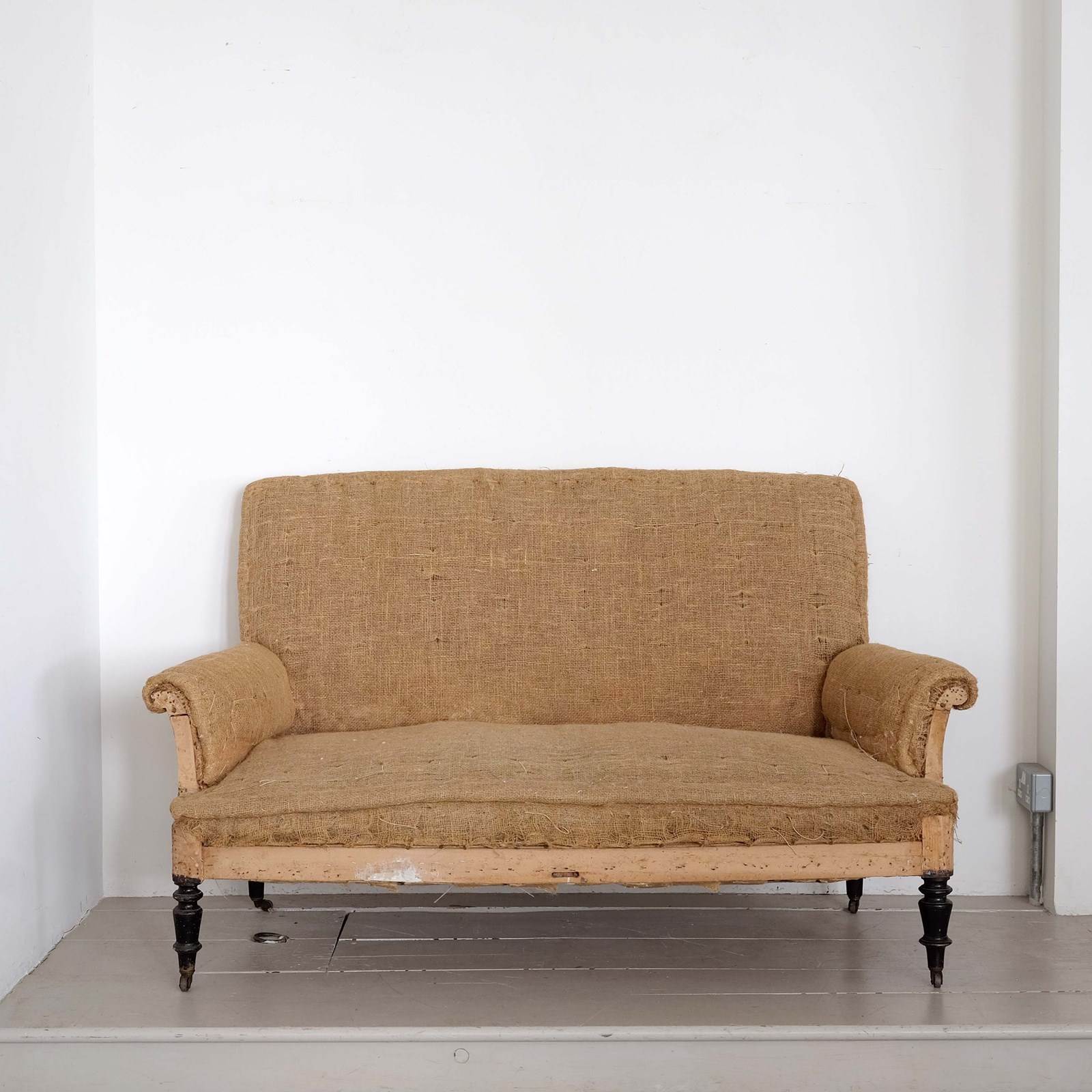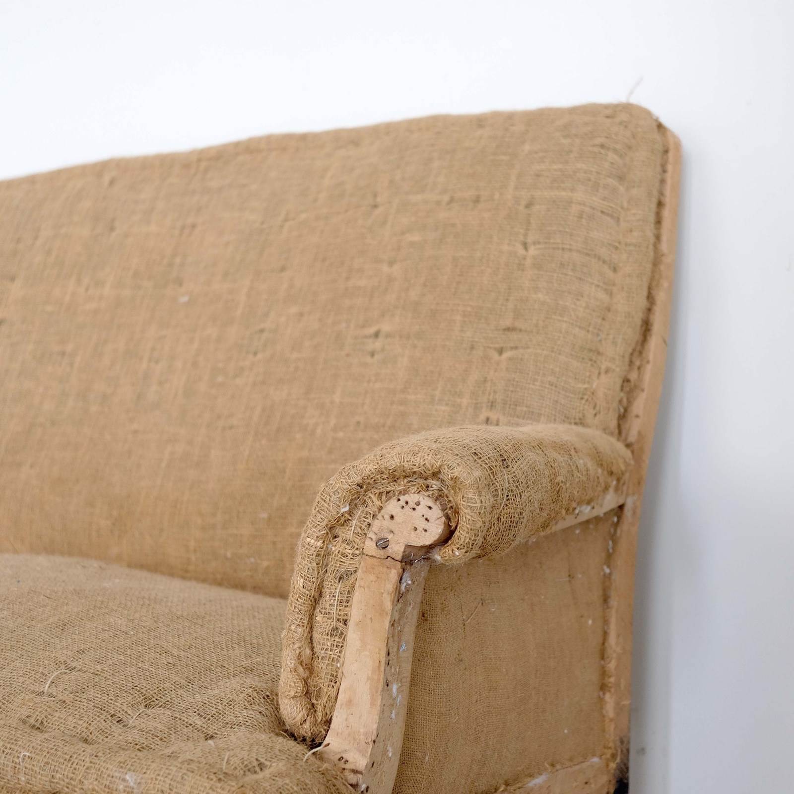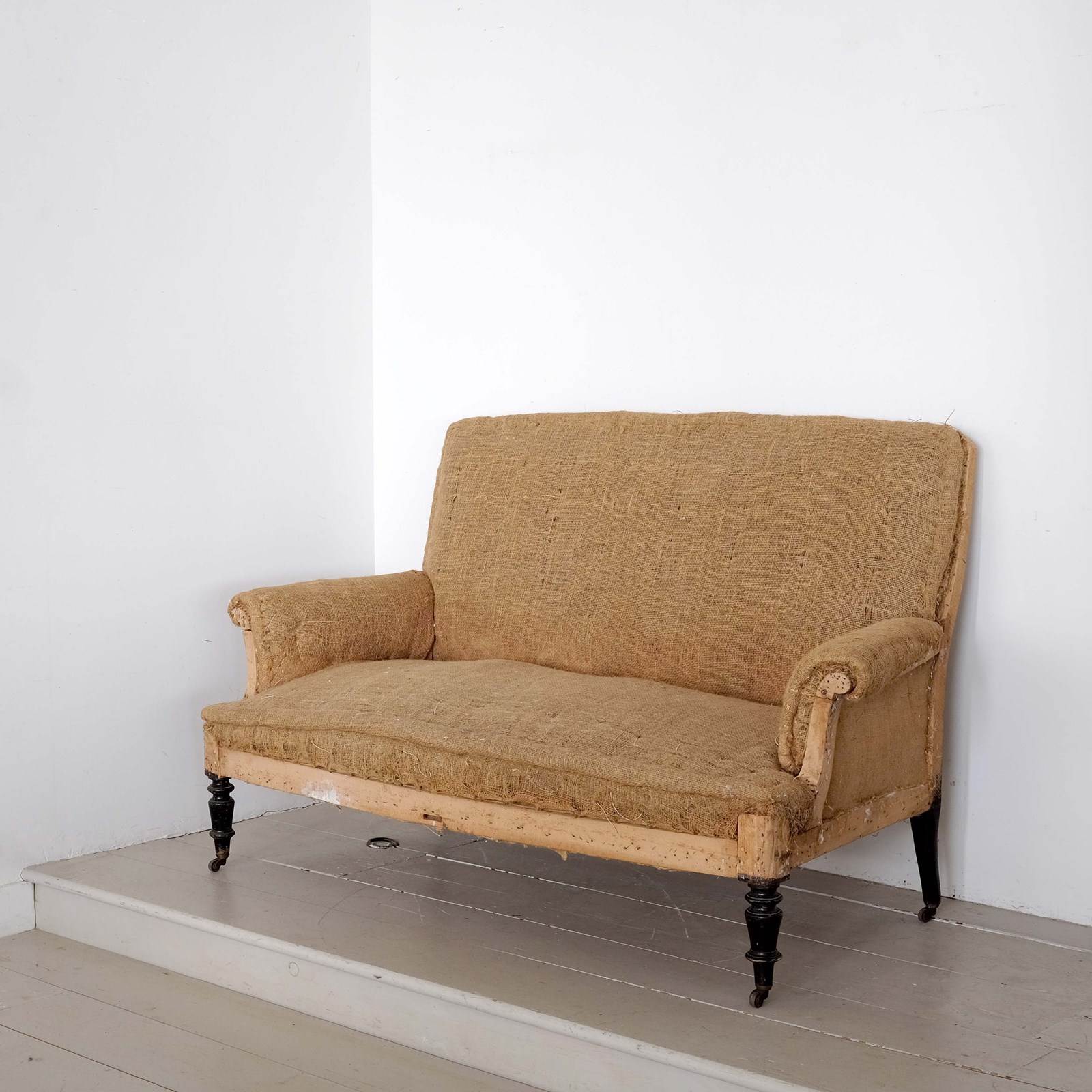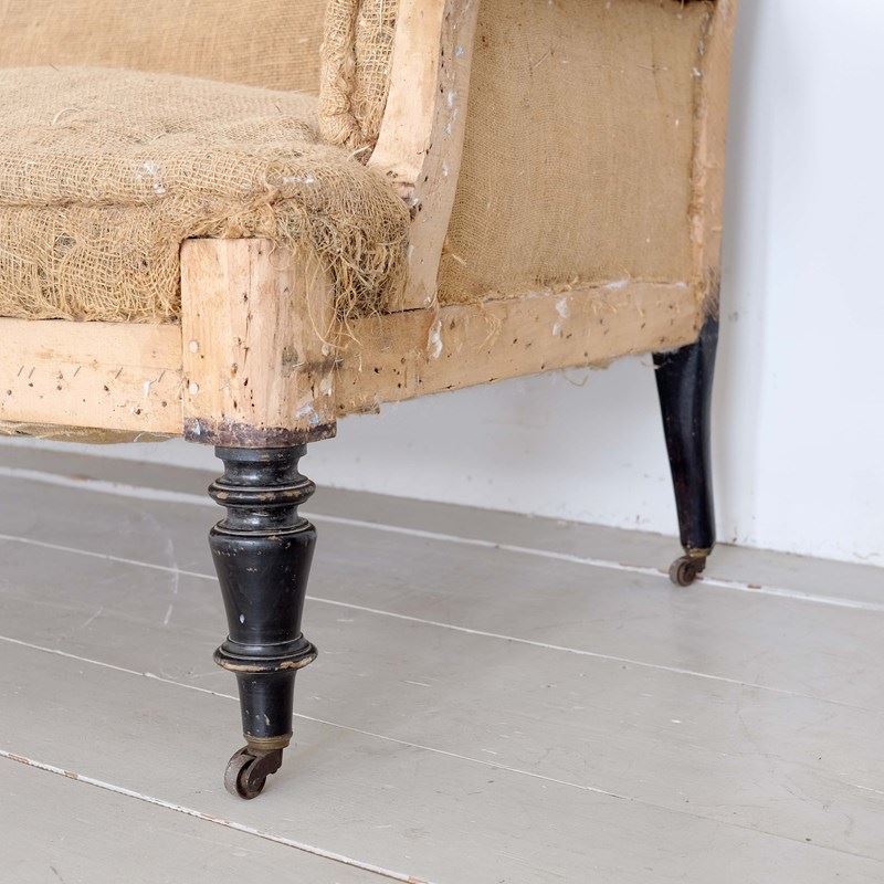 An elegant mid 19th century French Napoleon III canape/ settee/ sofa. Turned front legs with remnants of the original black paint on the original wooden castors. Stripped back to the original hessian ready for upholstery*.