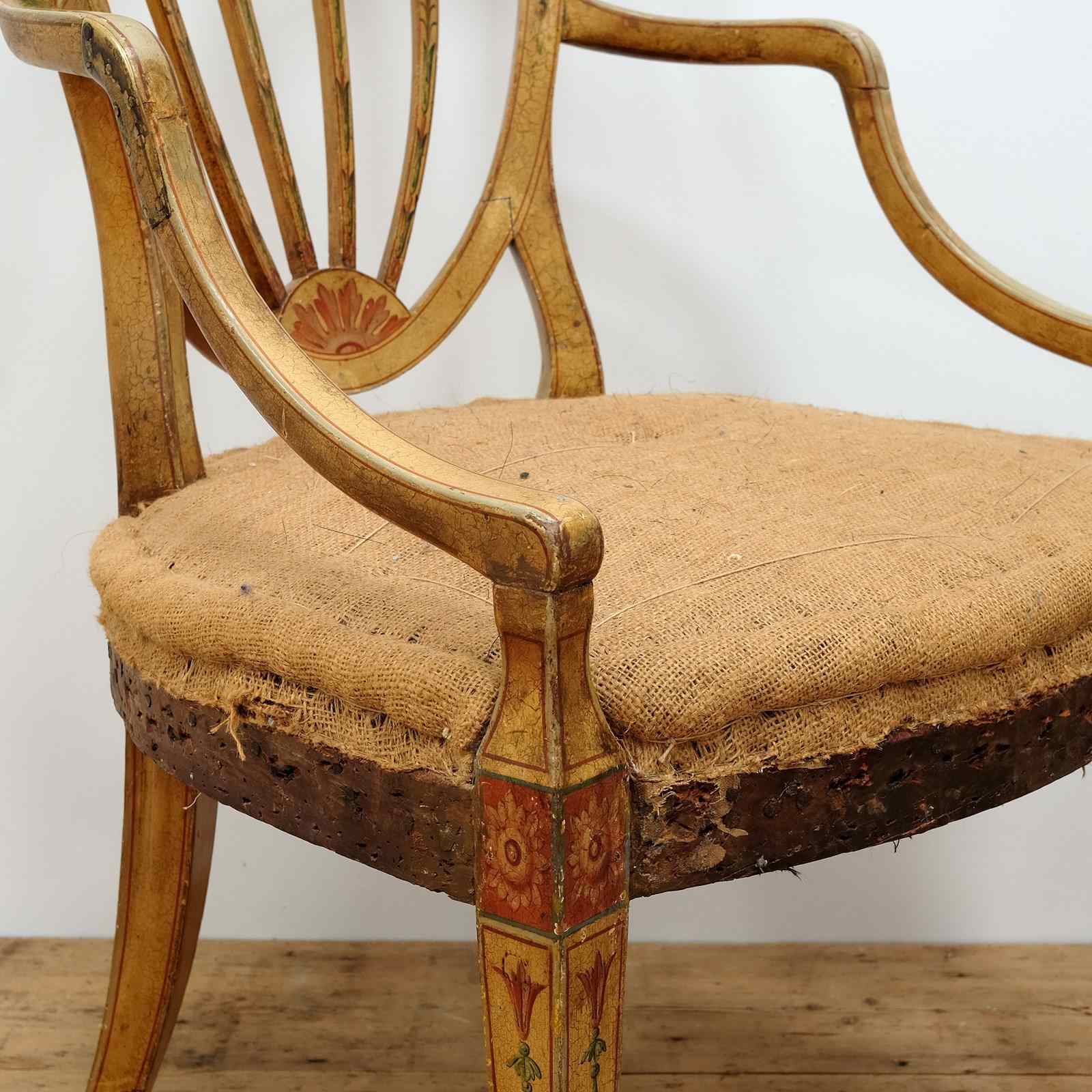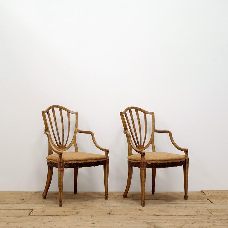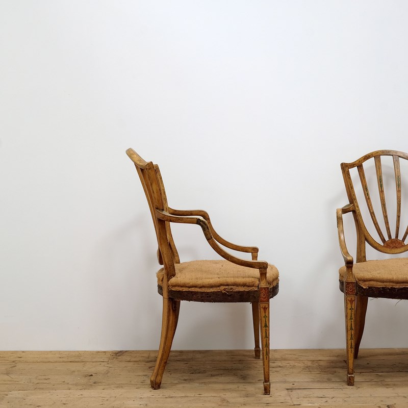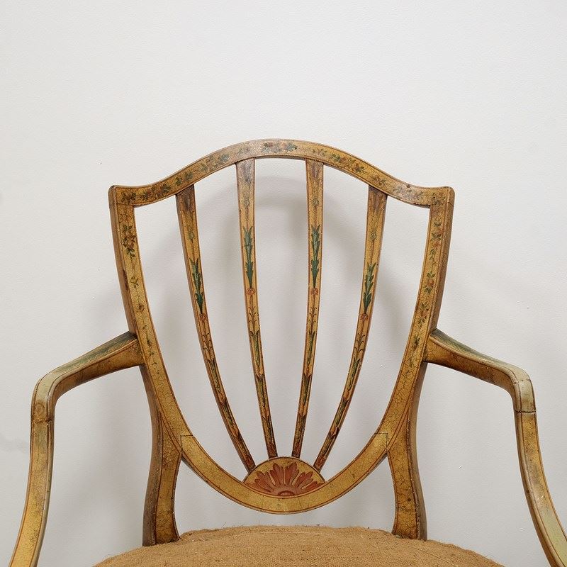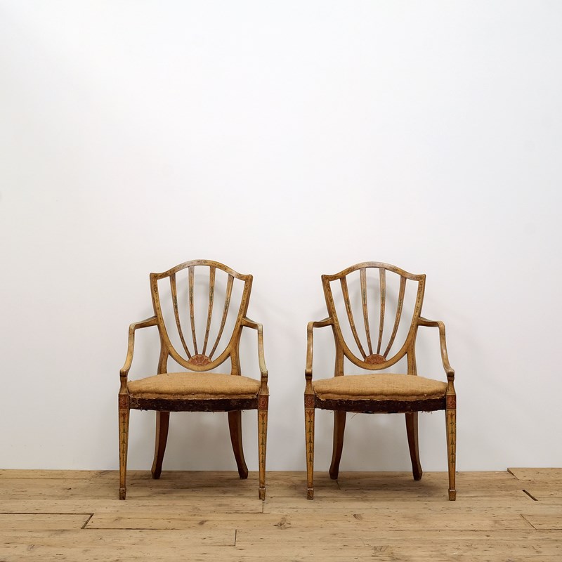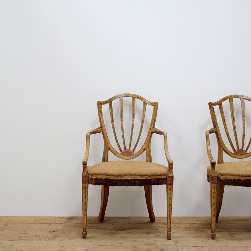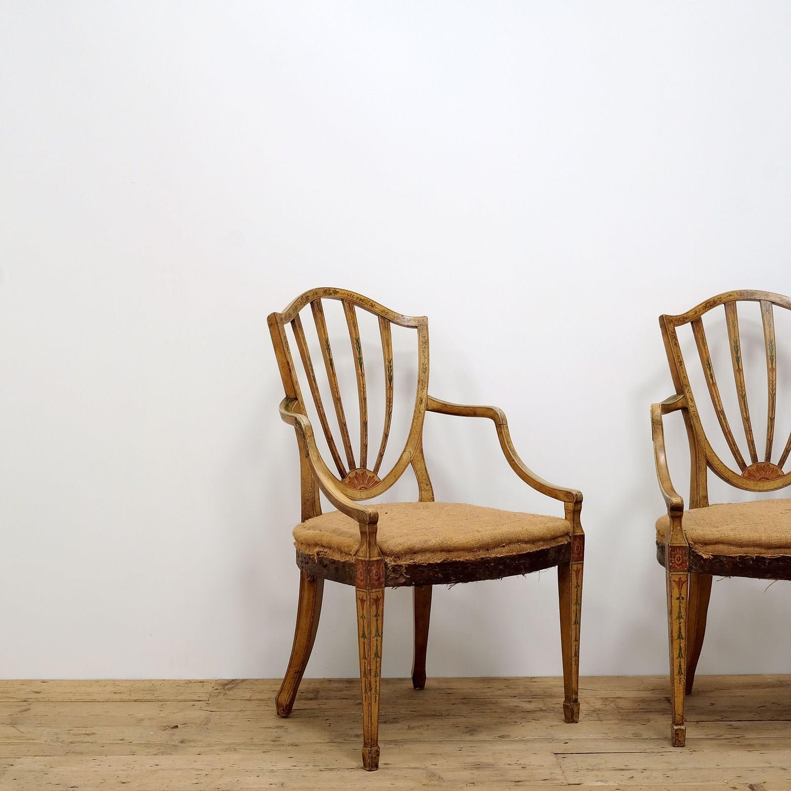 A very handsome pair of 19th century 'Sheraton style' armchairs. Fantastic shield back form. Elegant design with fine arms and square tapered legs. Lovely original painted decoration with honest brass repairs. Ready for recovering.