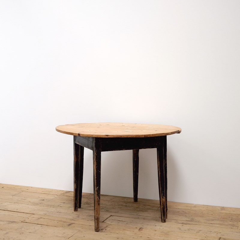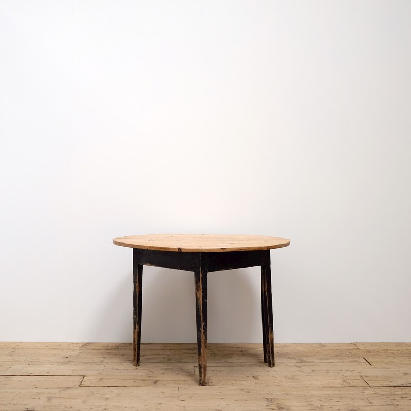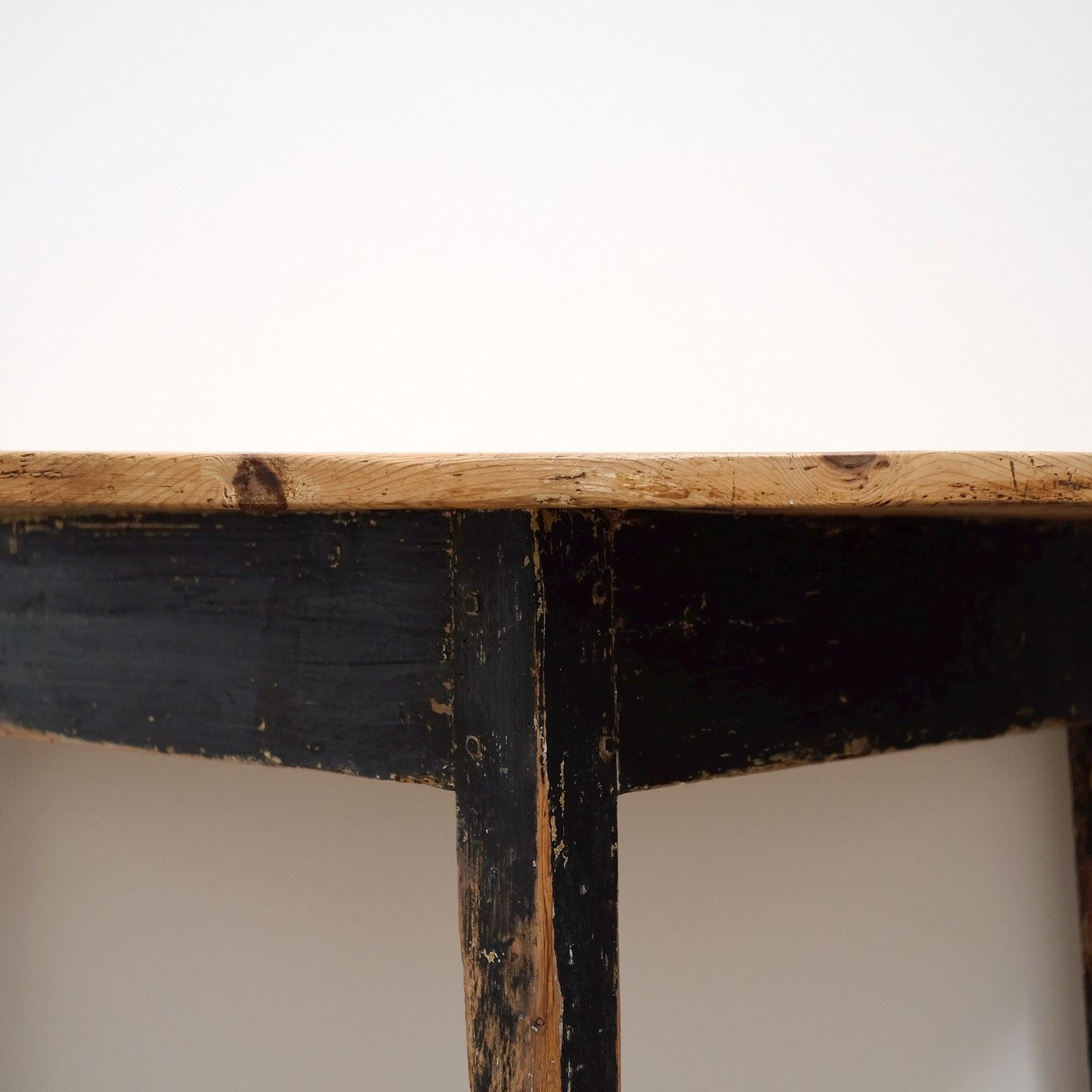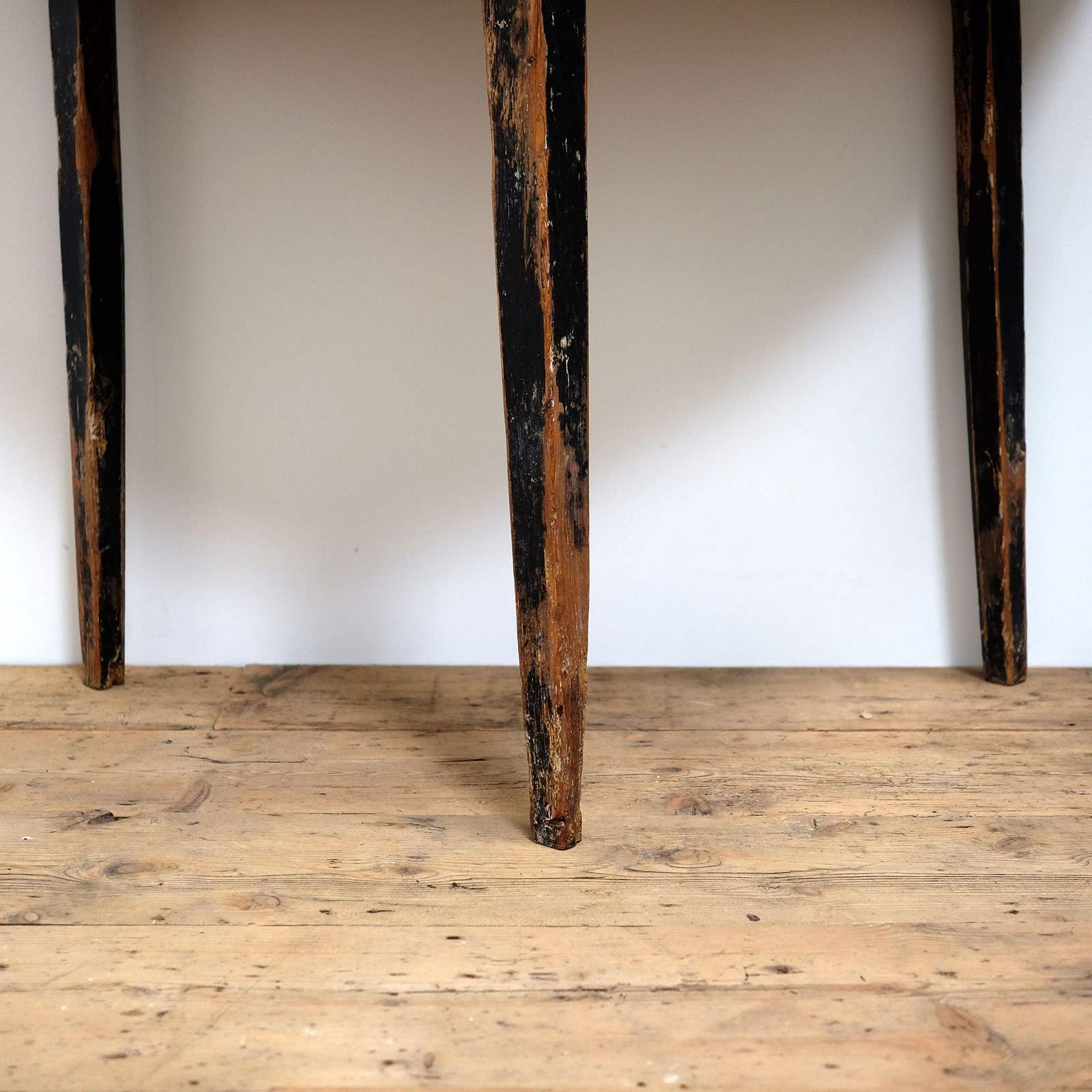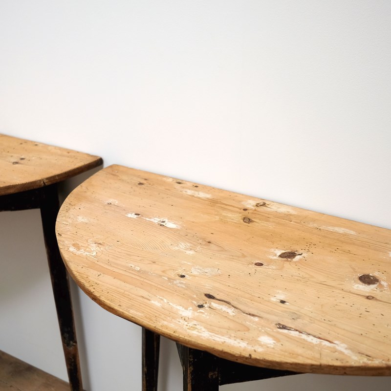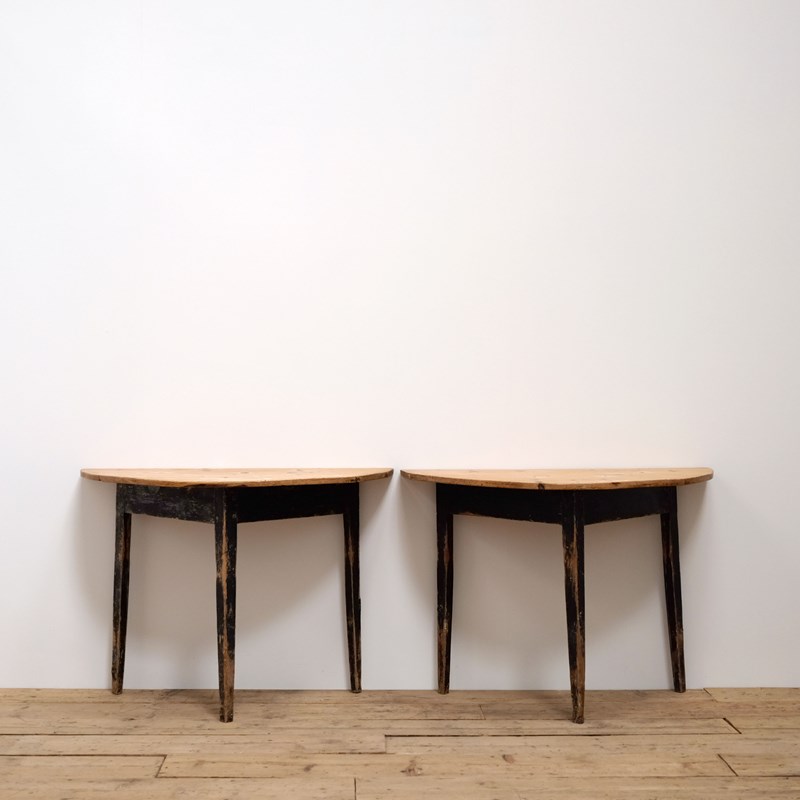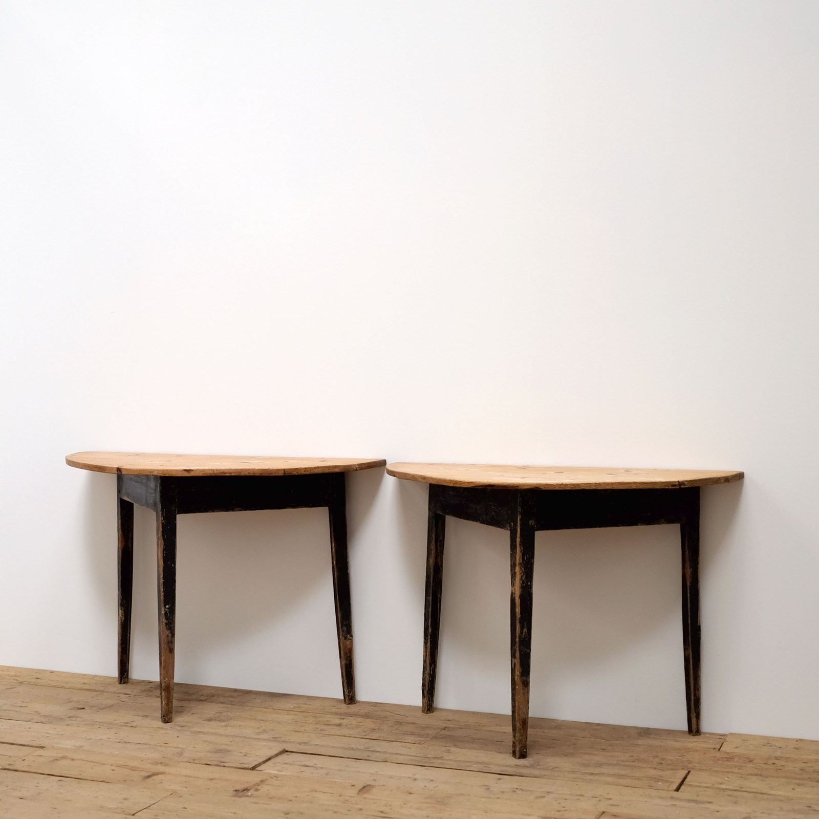 Elegant pair of Swedish demi-lune table, circa 1820, constructed in pine with remnants of the lovely original black paint. Scrubbed pine tops on elegant square tapering legs. Can be displayed as consoles or put together to make a round table.