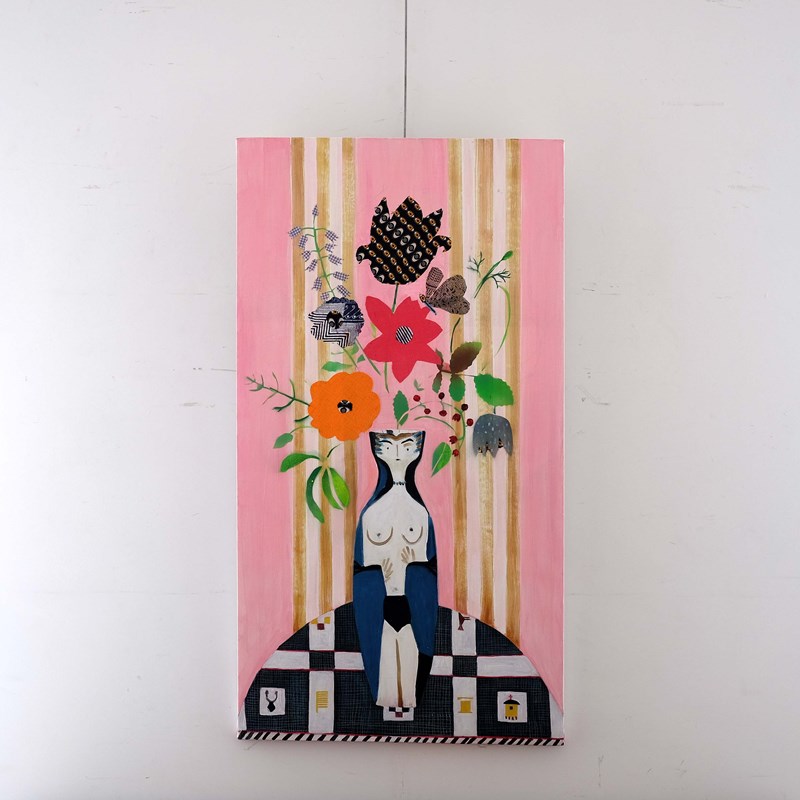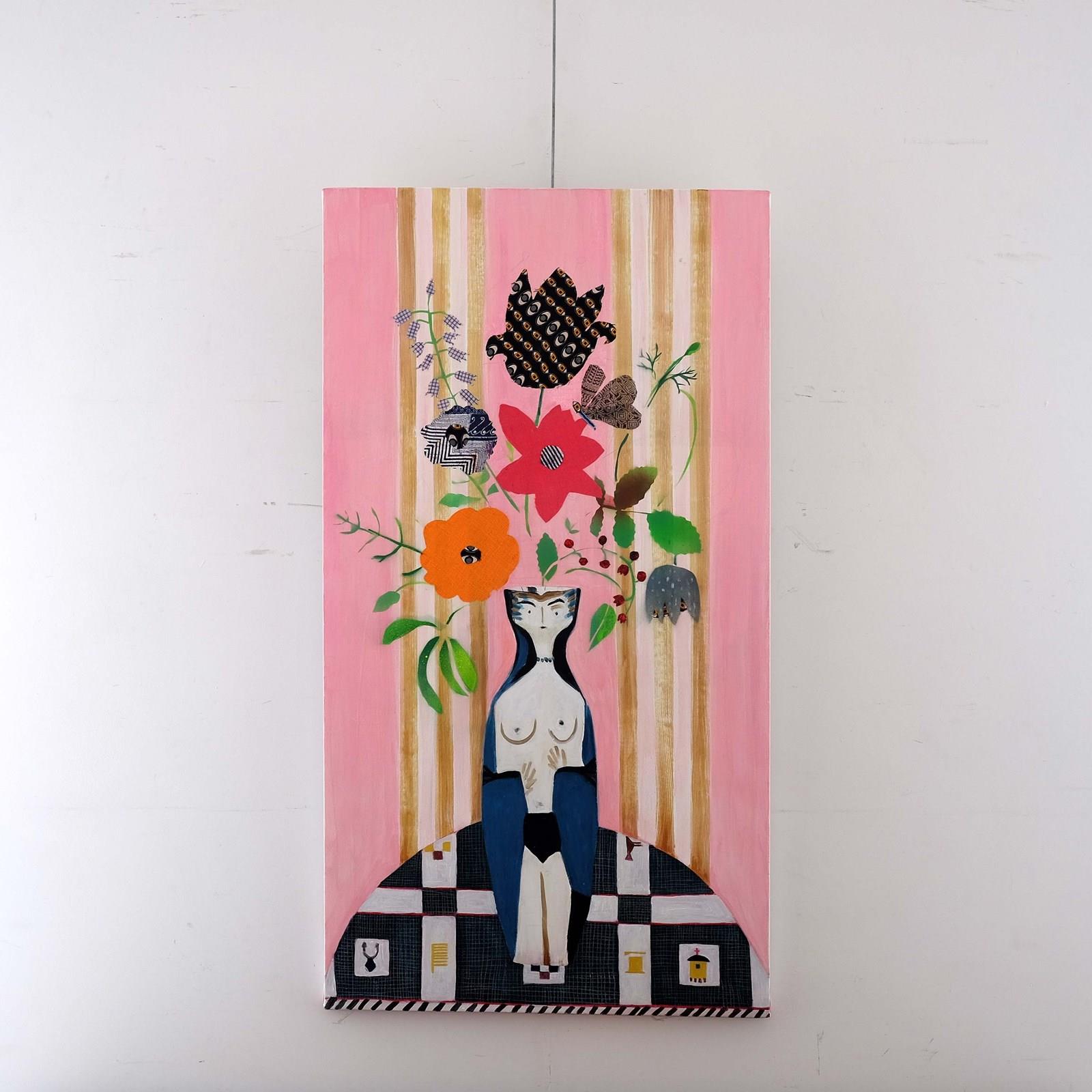 'Pink Botanical Demi Lune' by Isabelle Hayman, oil paint, spray paint and found fabrics on canvas.