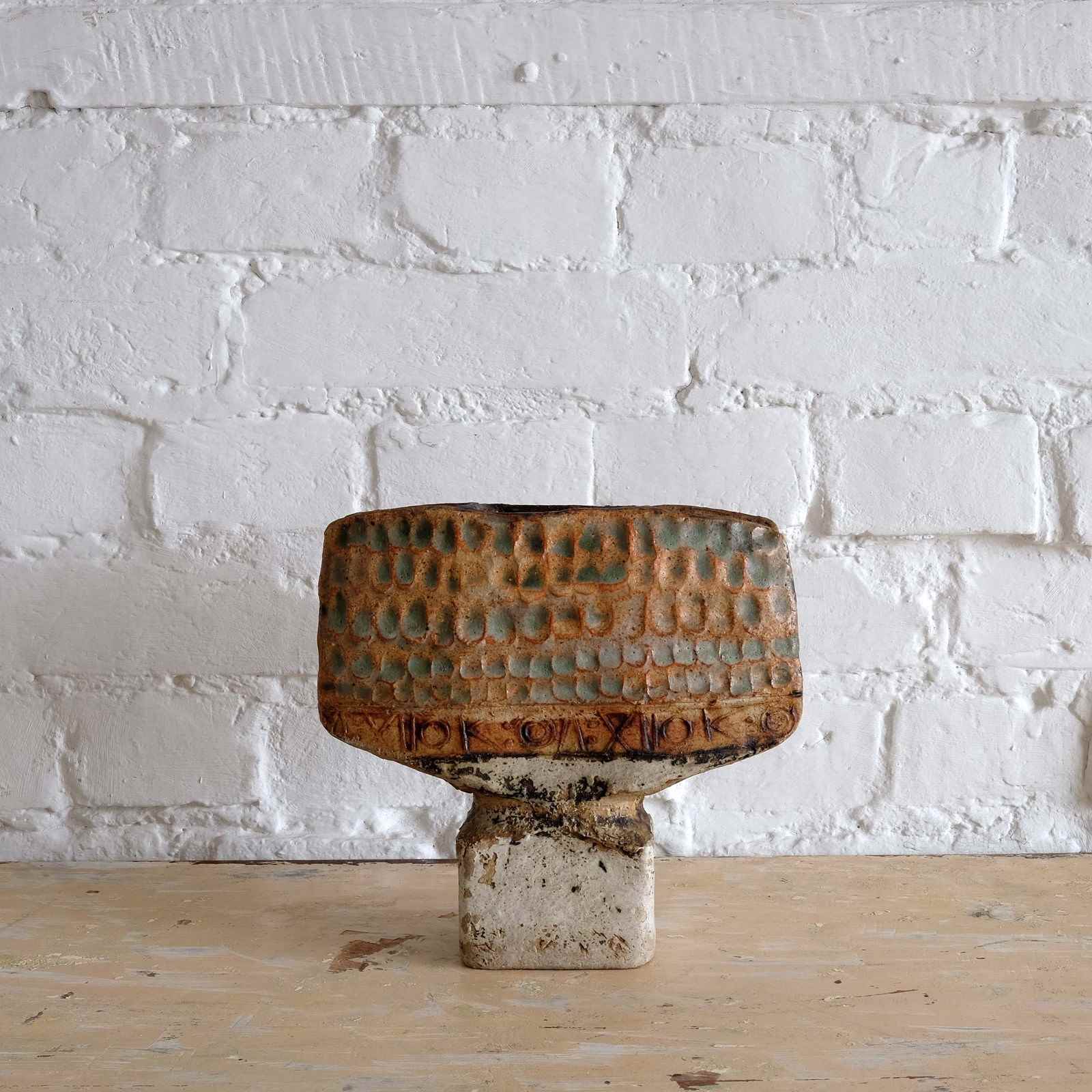 1970s British studio ceramic vessel formed to resemble a totem with lovely finger press details and glazed in earthy tones. Initialled underneath.