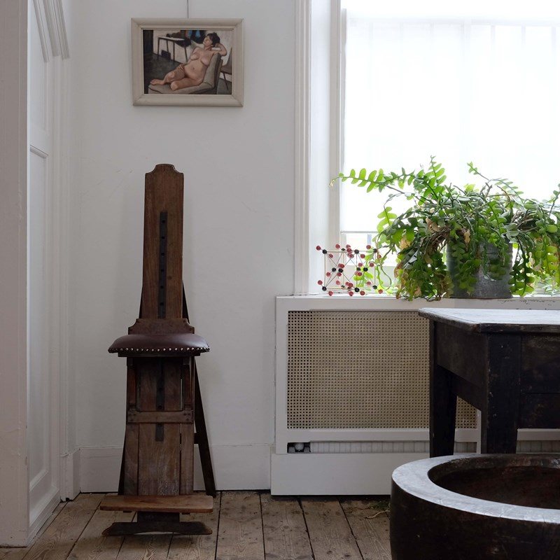 A rare and very stylish early - mid 20th century artist's easel chair. Good quality design constructed in oak, with a height adjustable seat covered in leather. Folds away with a hinged metal strap for convenience.