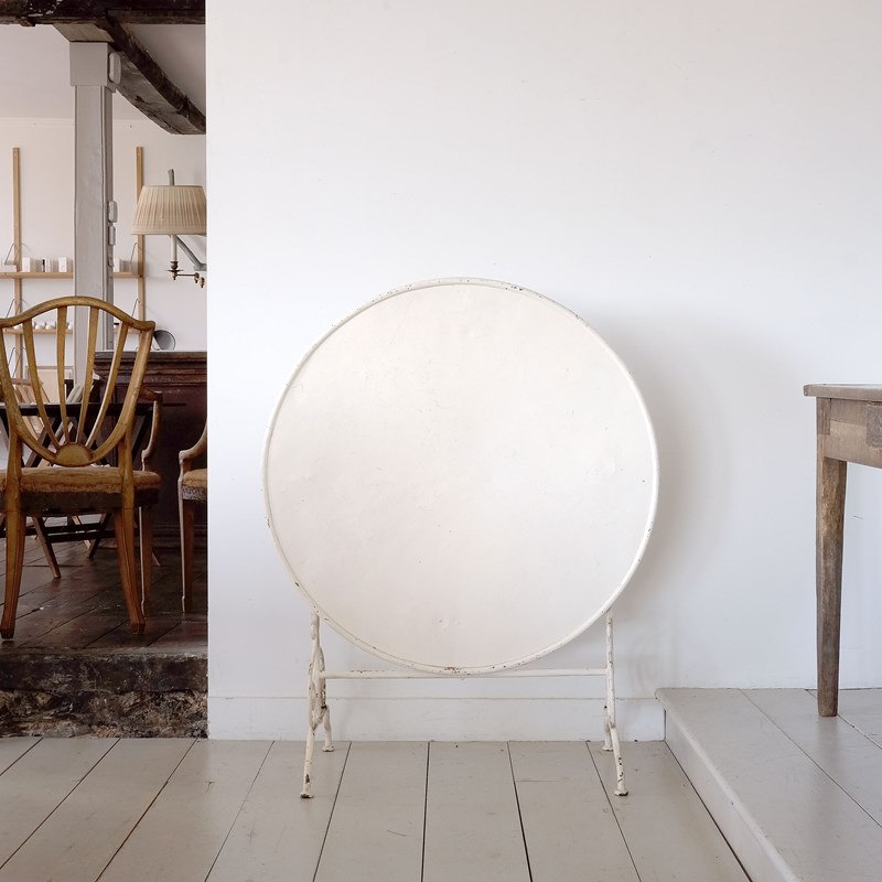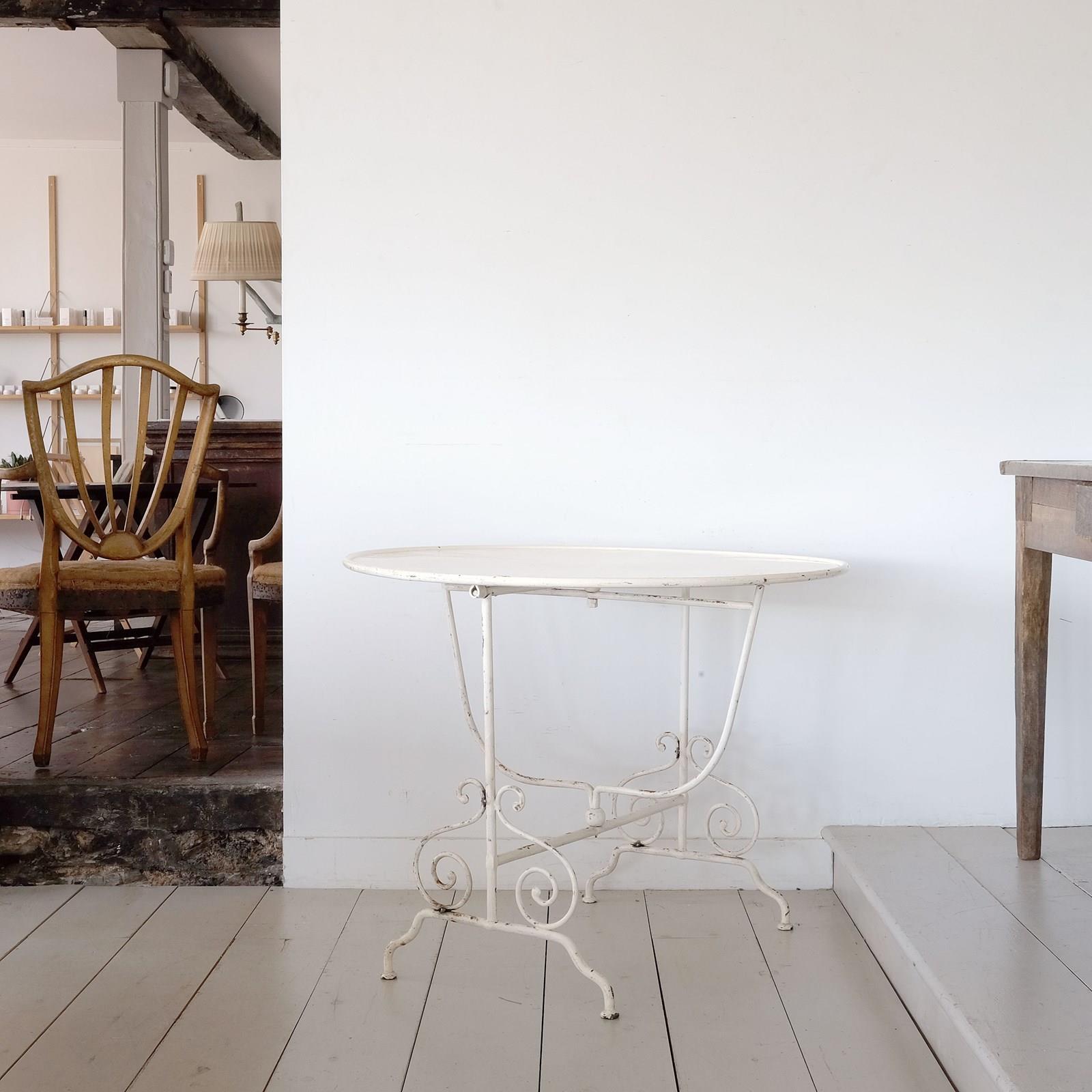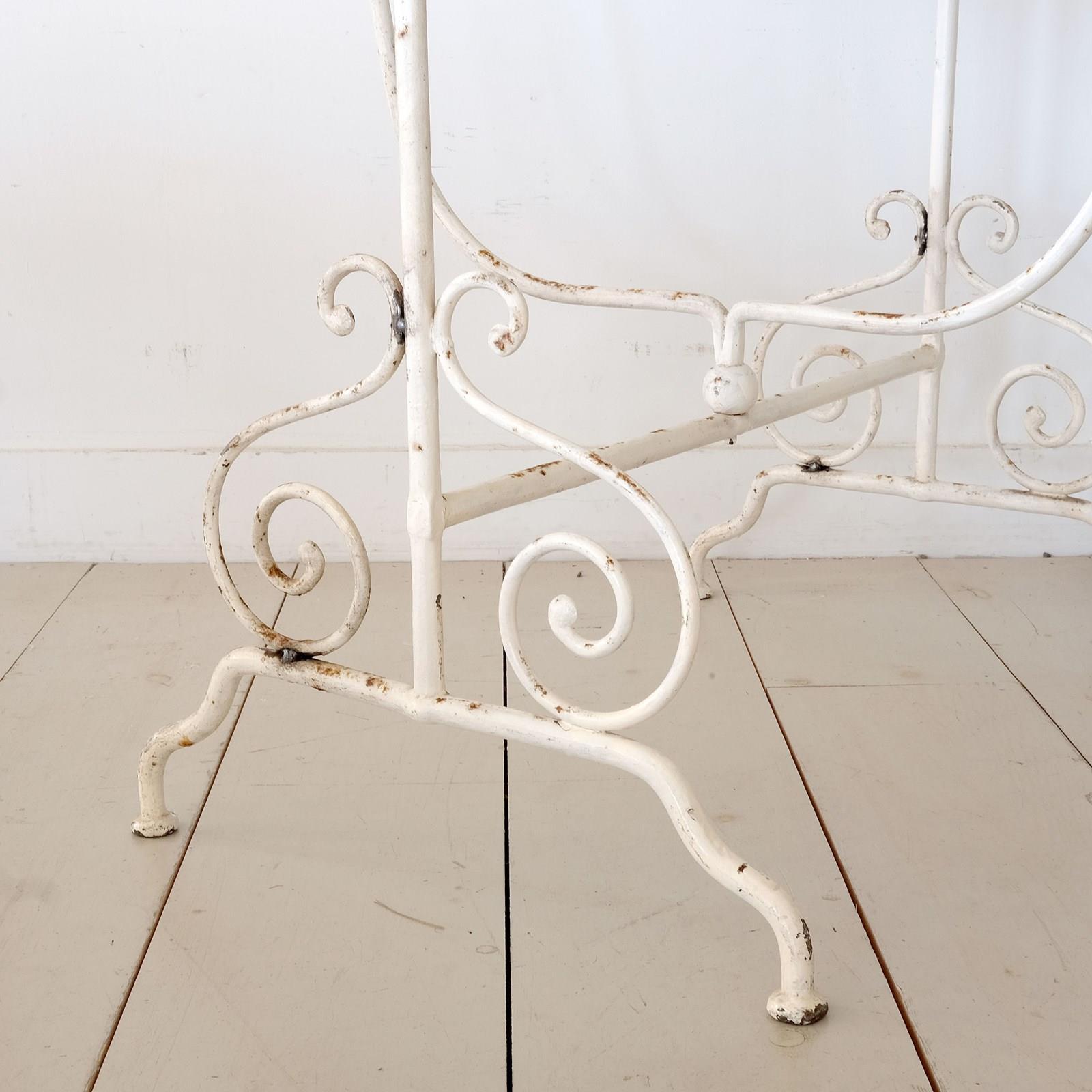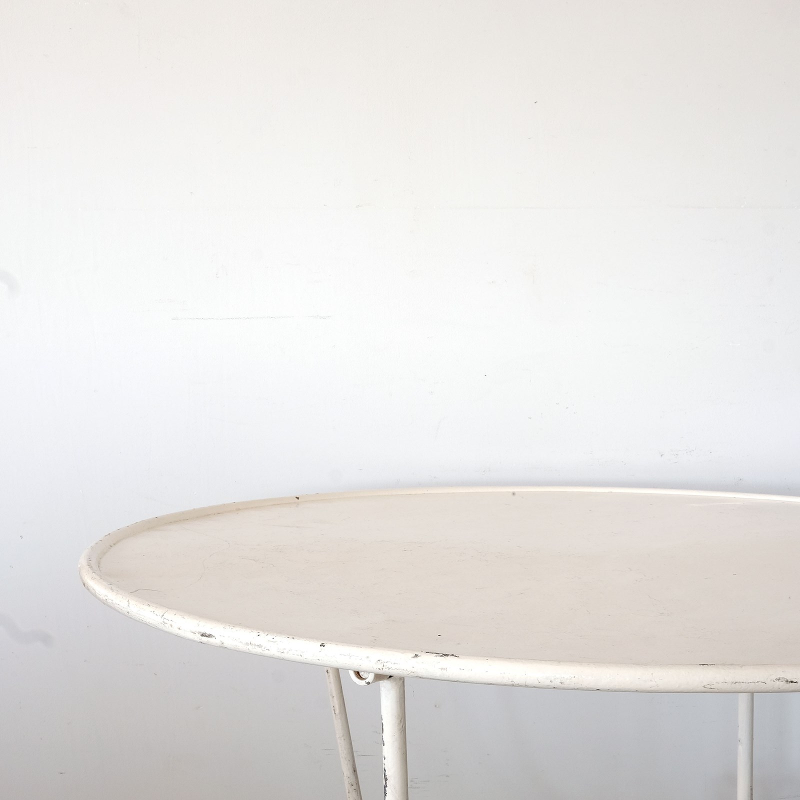 Late 19th century French folding garden table. Sheet metal dish top on a very pretty wrought iron base with remnants of the original paint. Unusual folding mechanism that works well and is very stable. Perfect for storage in bad weather and comfortably seats four.