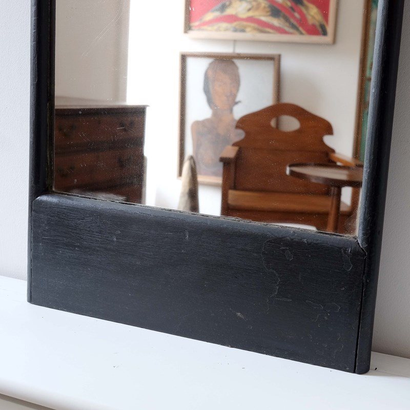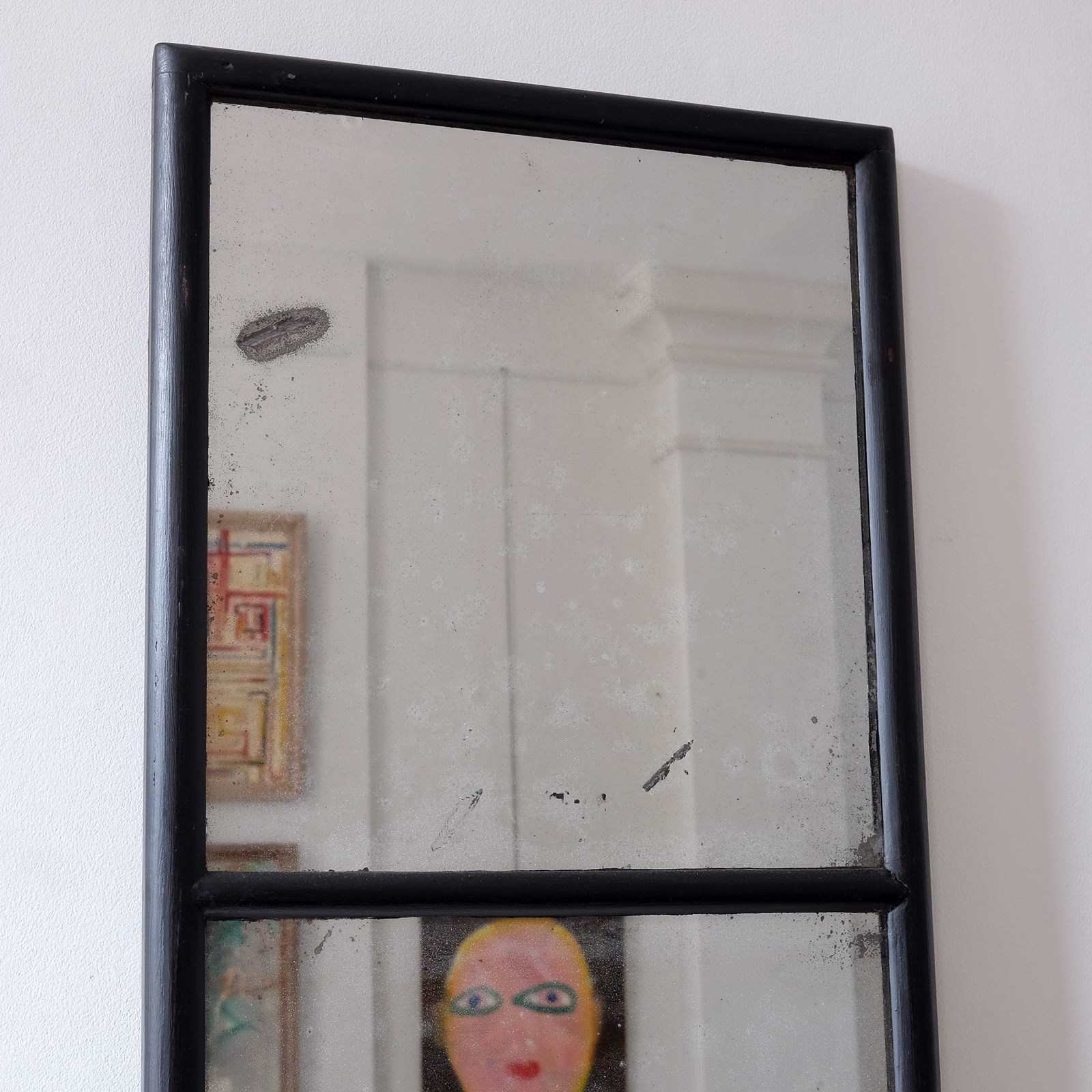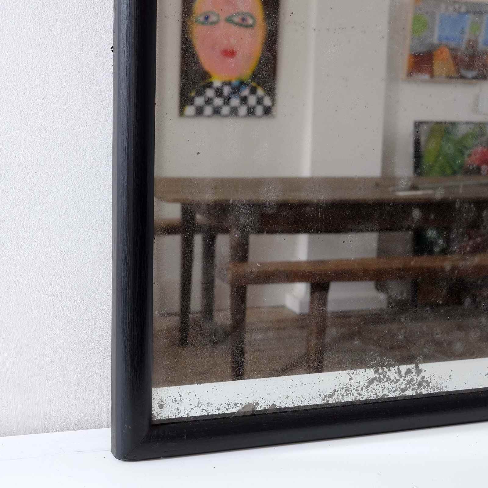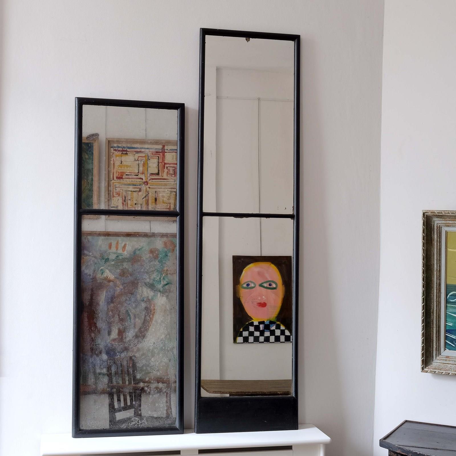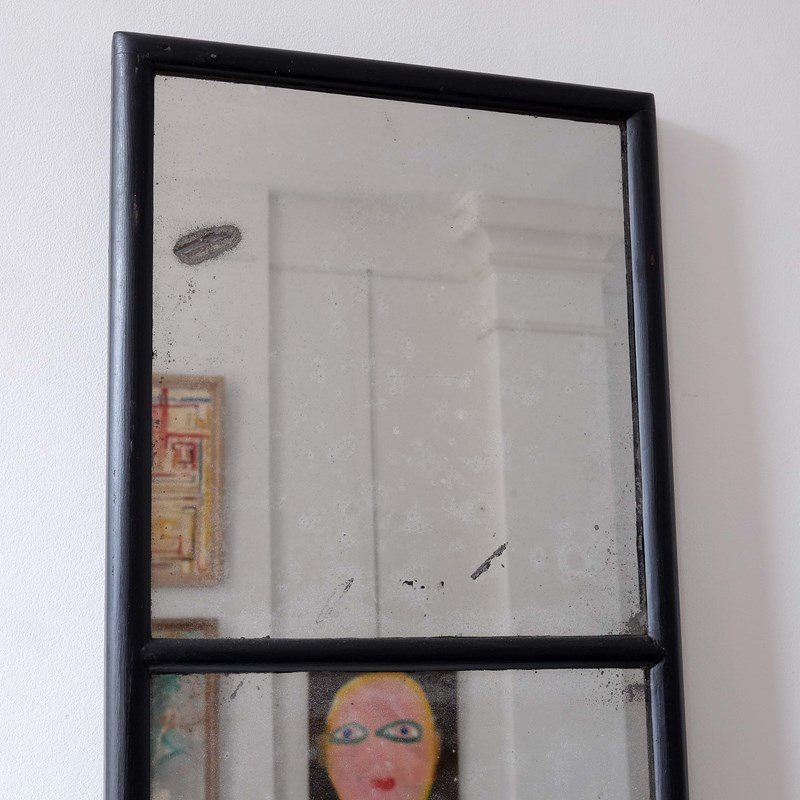An early 20th century French shop mirror, original plates and back, elegant bull nose frame, unusual sectioned design. Accompanied by a similar 19th century English shop mirror with original sparkly mercury plates. They were bought independently of each other but we feel they work well as a pair. Sold separately.