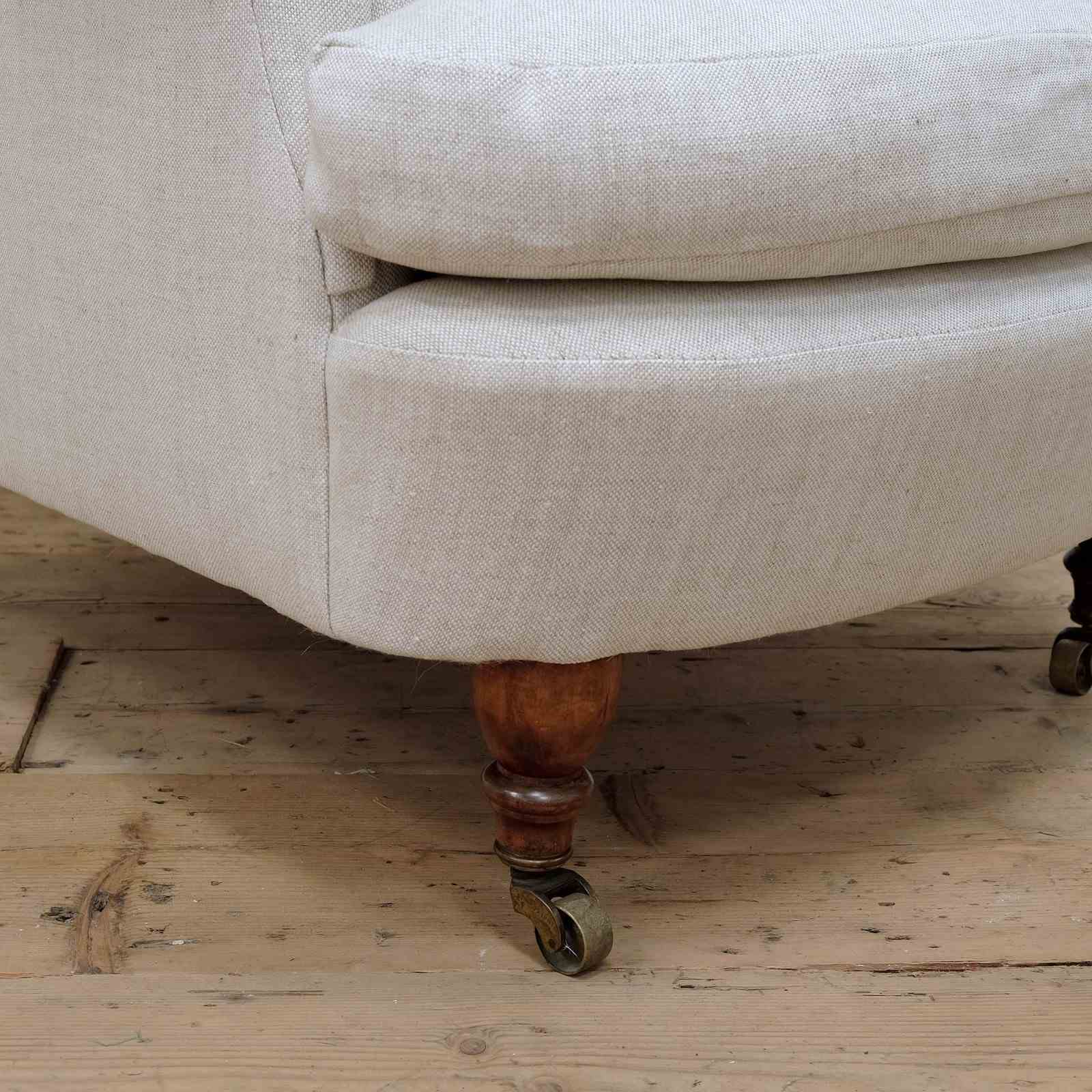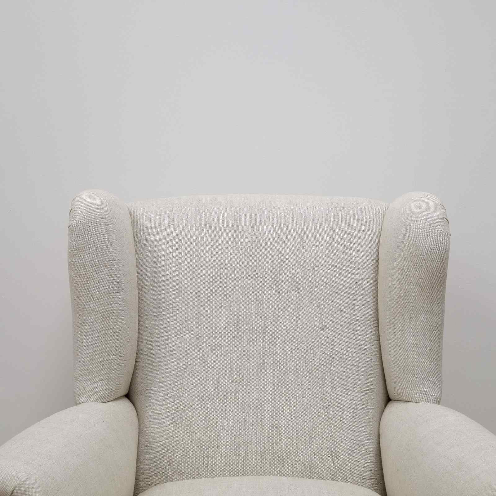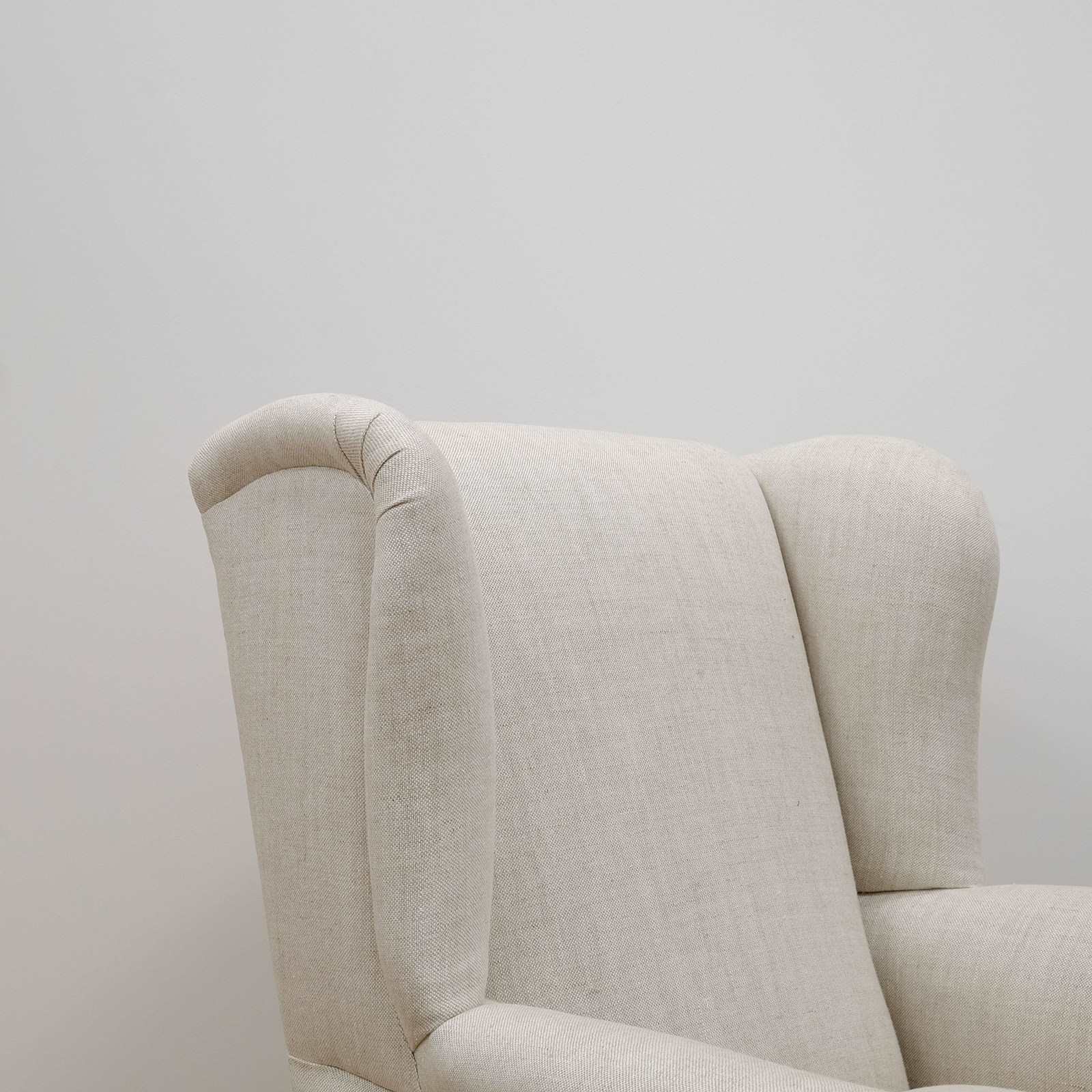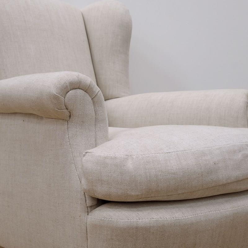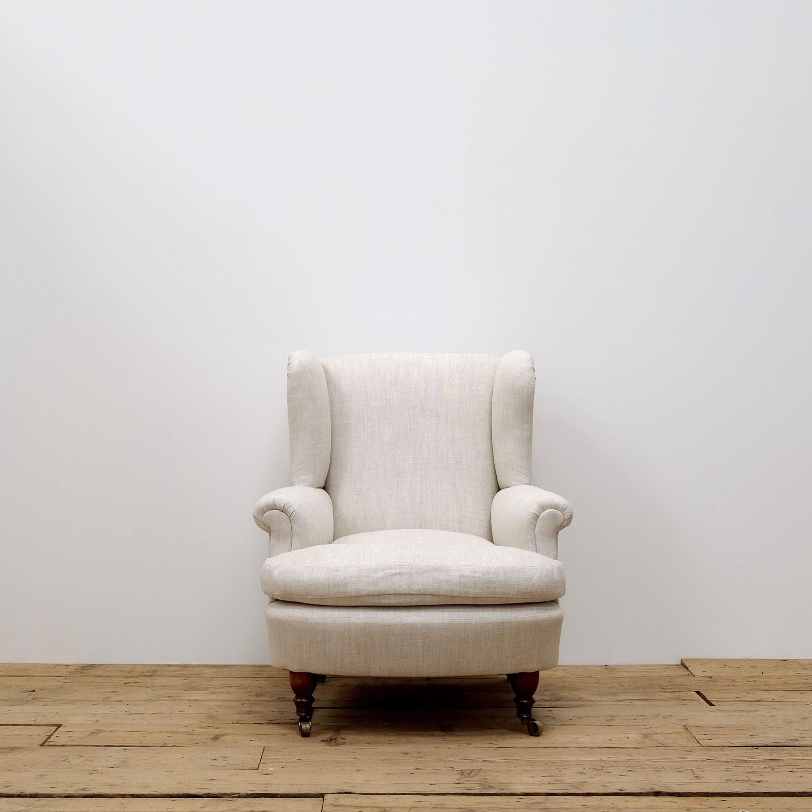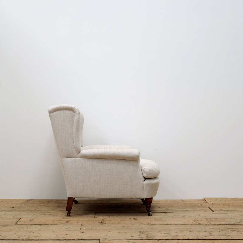 Good quality English Edwardian wingback armchair, circa 1910. Newly upholstered in neutral linen. Walnut legs on brass castors. Fantastic low, deep, and comfortable proportions.