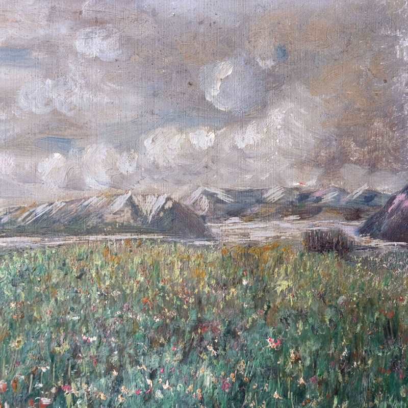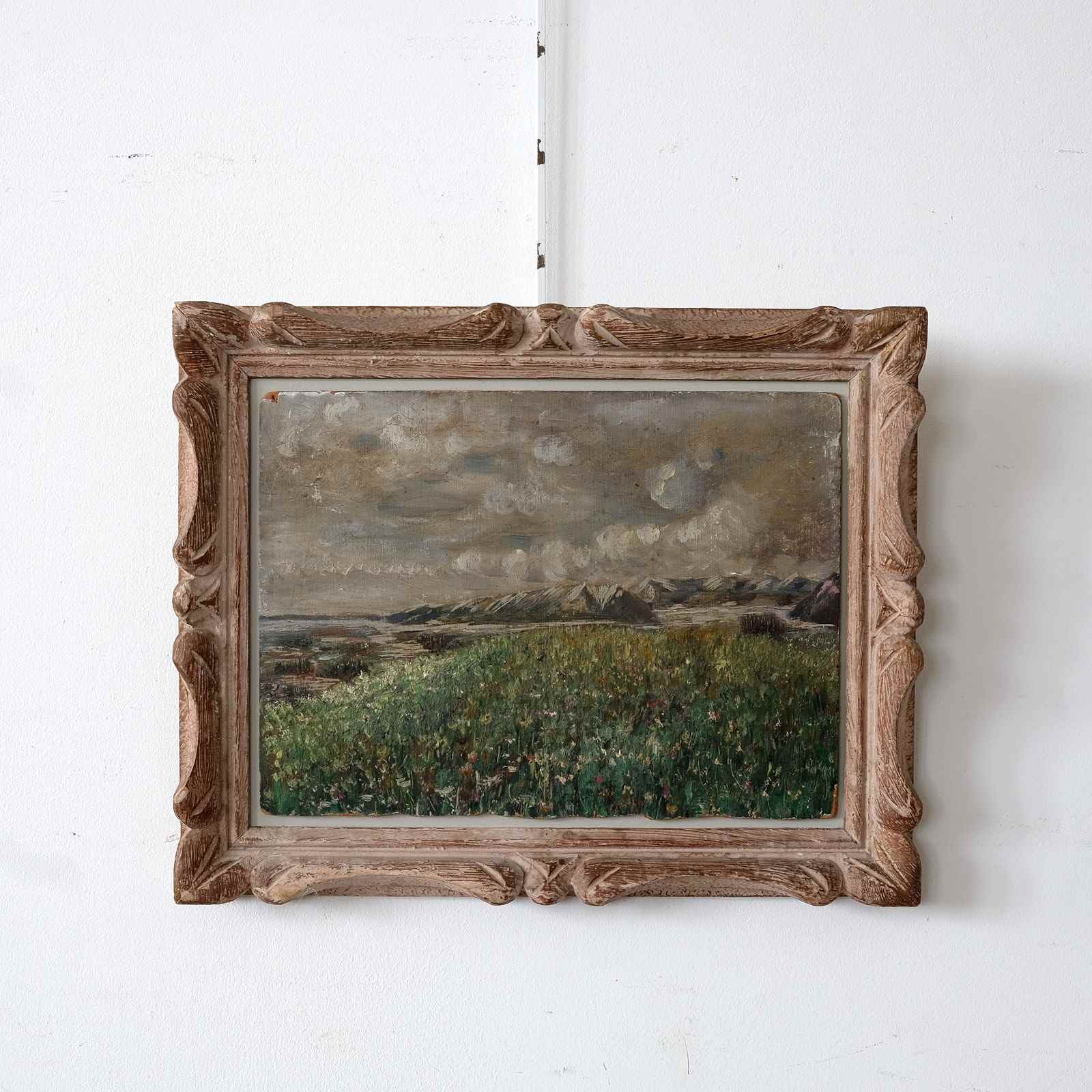 A beautiful little French landscape depicting a wild flower meadow in the foreground and snow capped mountains on the horizon. Oil on board mounted in an antique French frame. Artist unknown but executed in an accomplished hand.