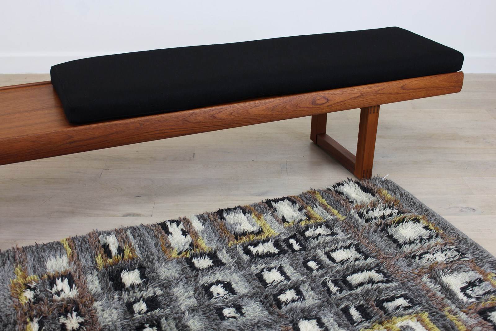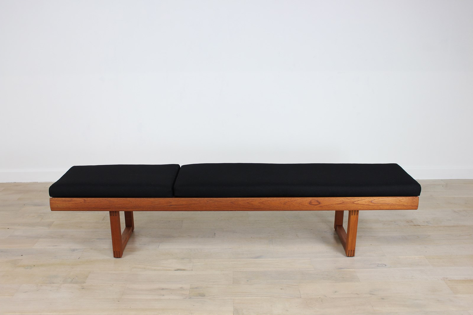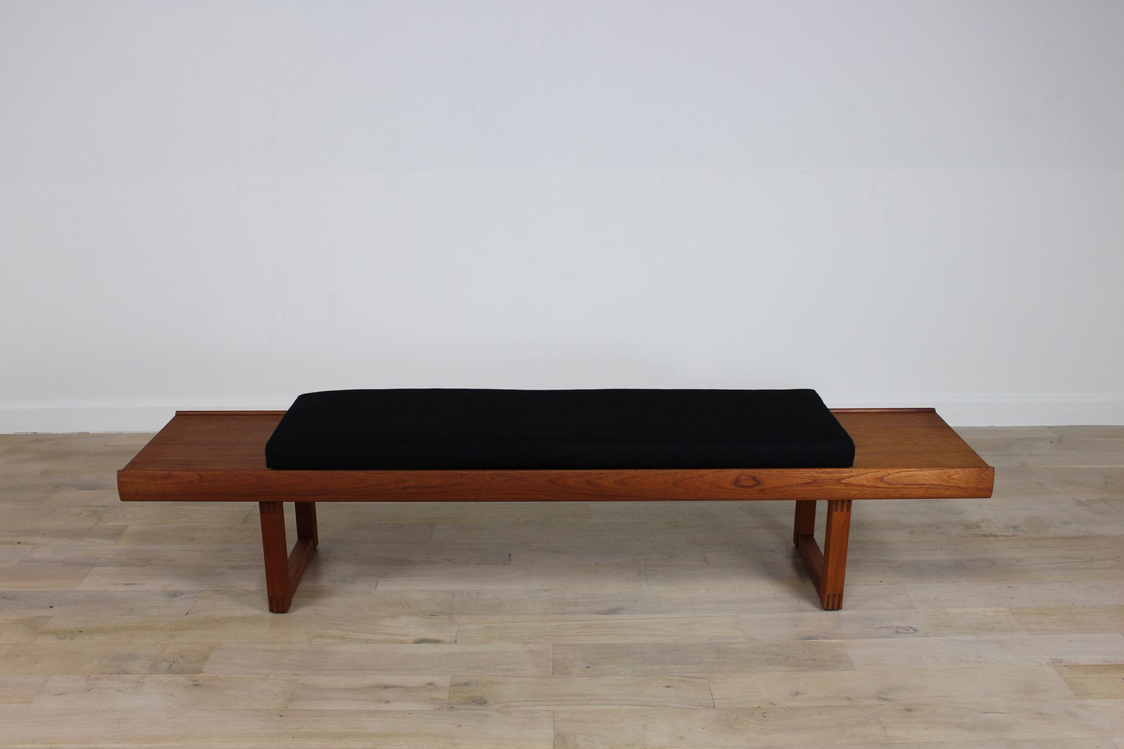 We go out of our way to buy these lovely stylish low benches which were made in this size and a shorter 4ft version . We’ve sold a few over the last 10 years . The first one we found had a great small chest of drawers that sat on the top , and another came with cushions . Unfortunately the small chests are even rarer the benches . This one came without any cushions , so our upholsterer has made a set of 3 in a lovely black wool fabric .