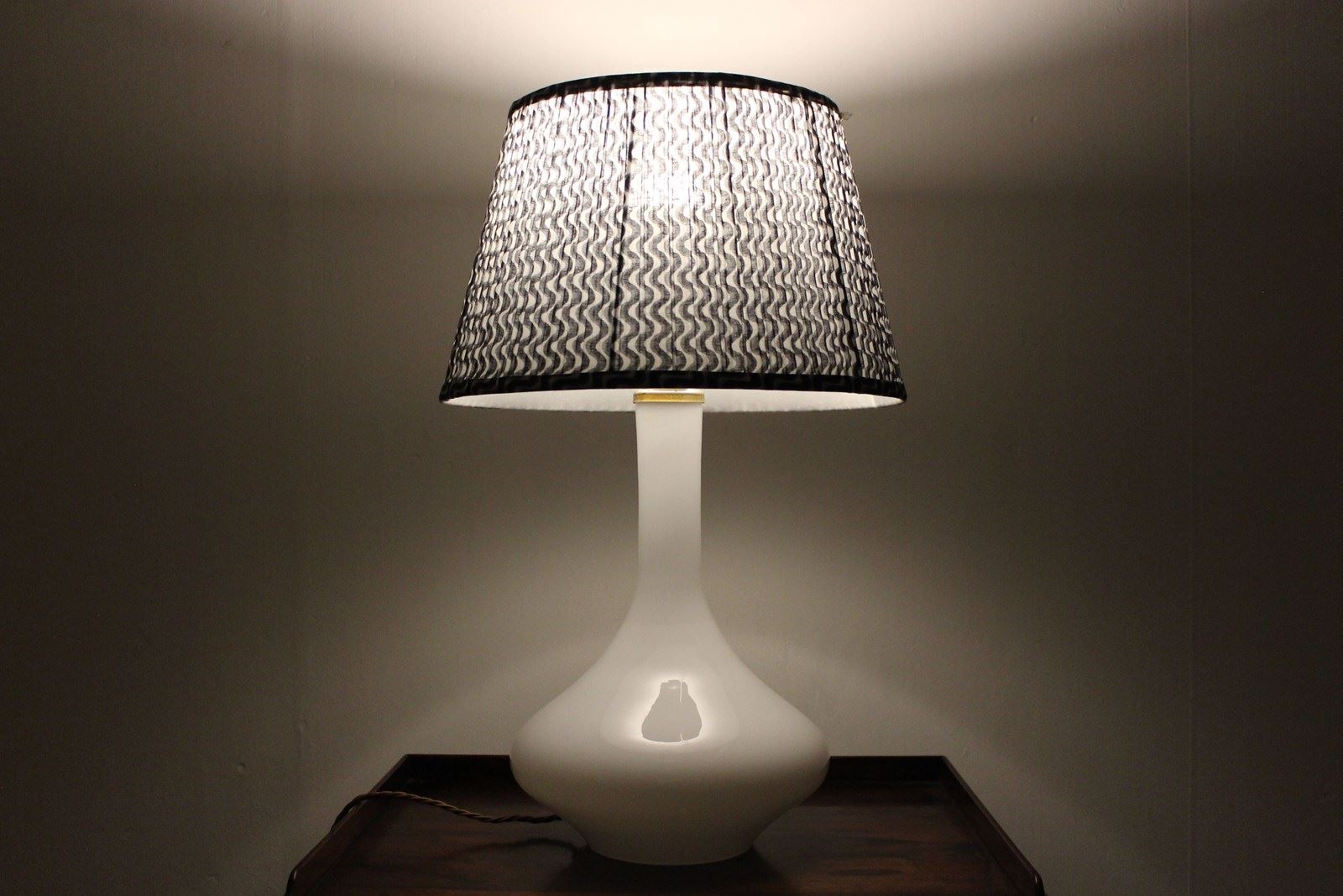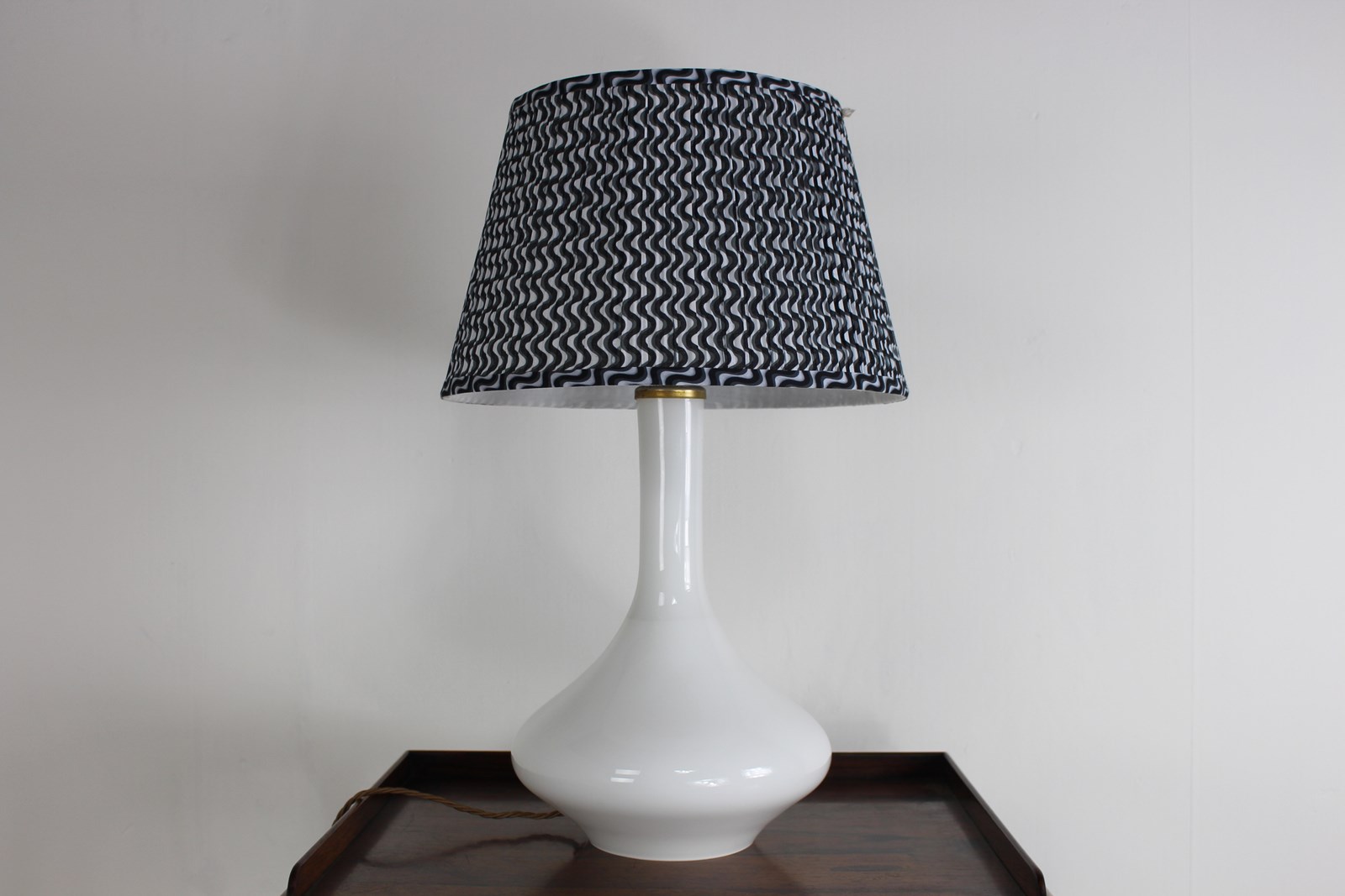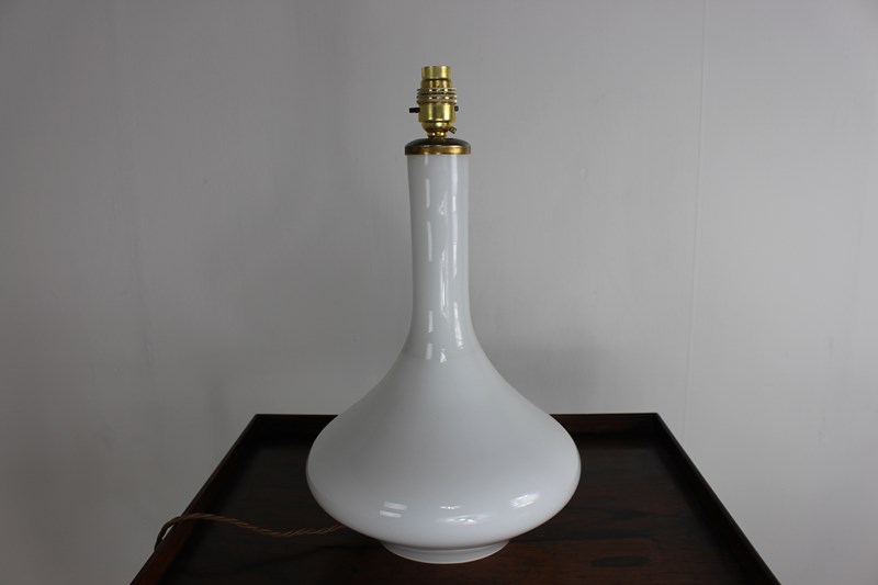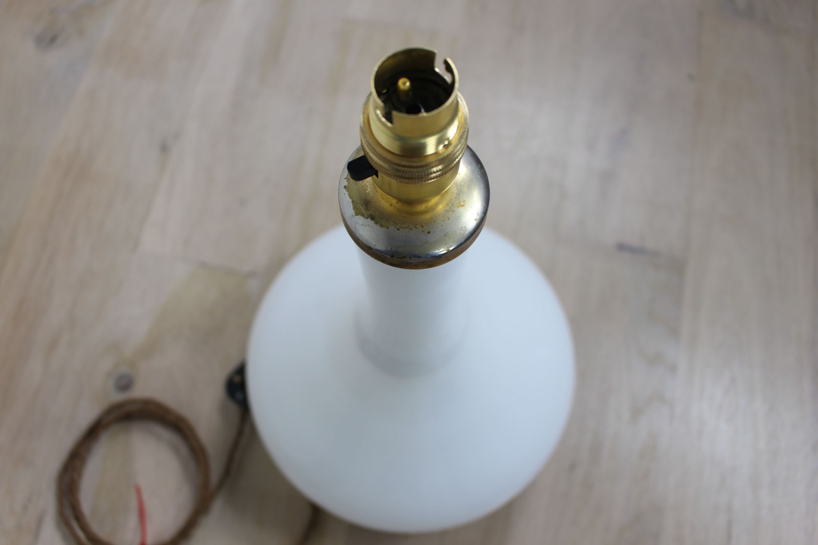 A nice simple stylish shape in white glass with a brass top . Newly rewired with a new brass fitting and twisted cord wiring to current UK standards and PAT tested so ready to use safely .